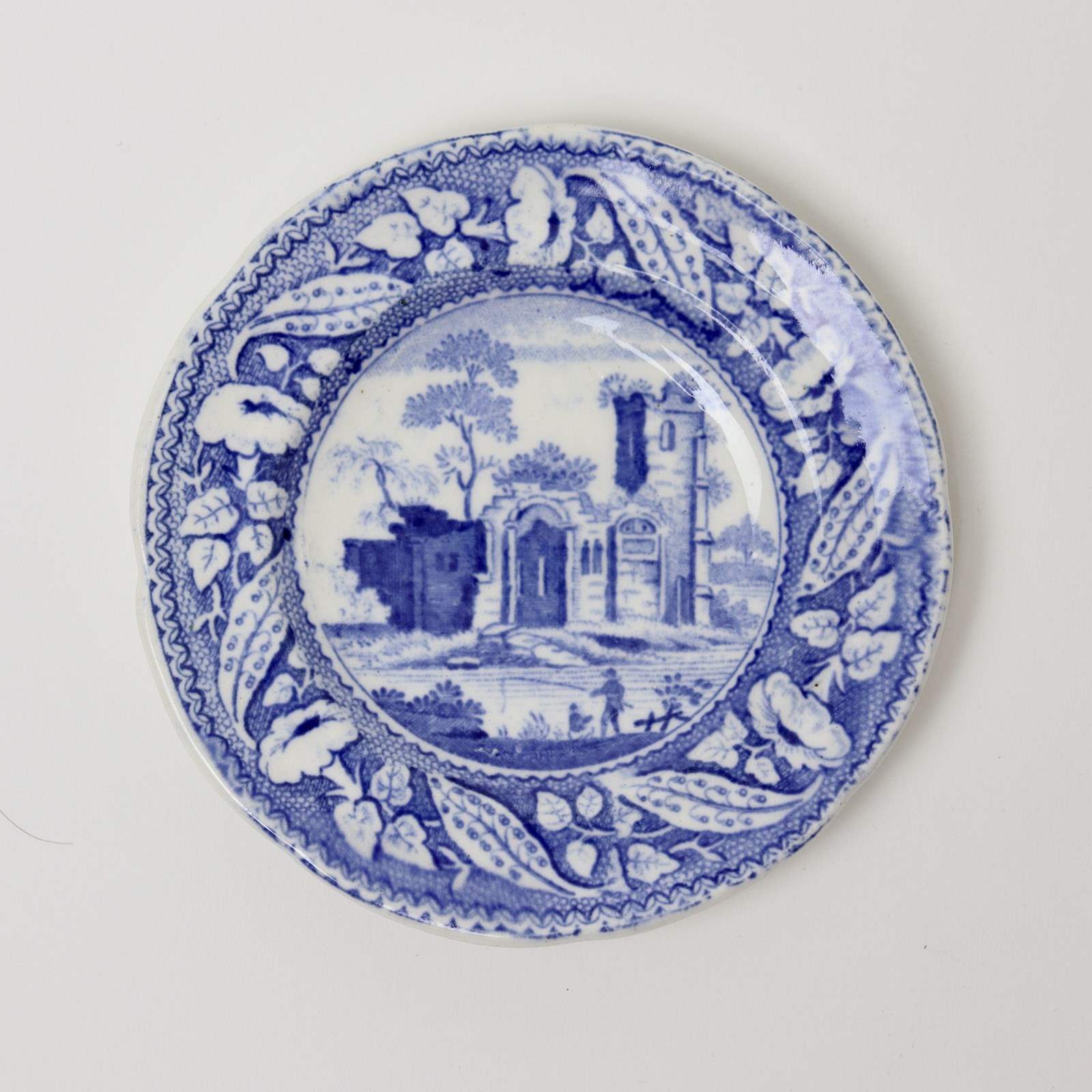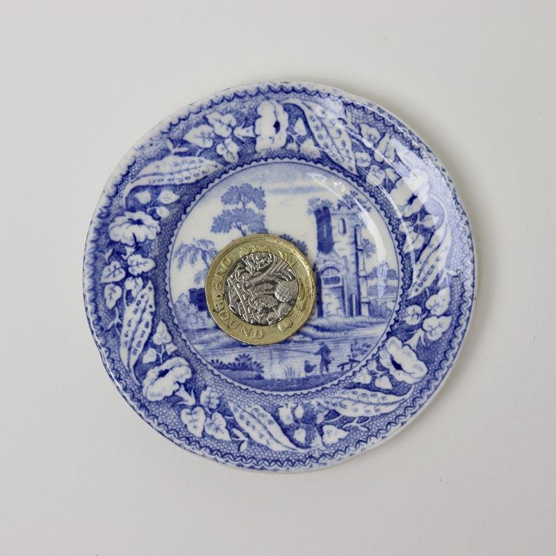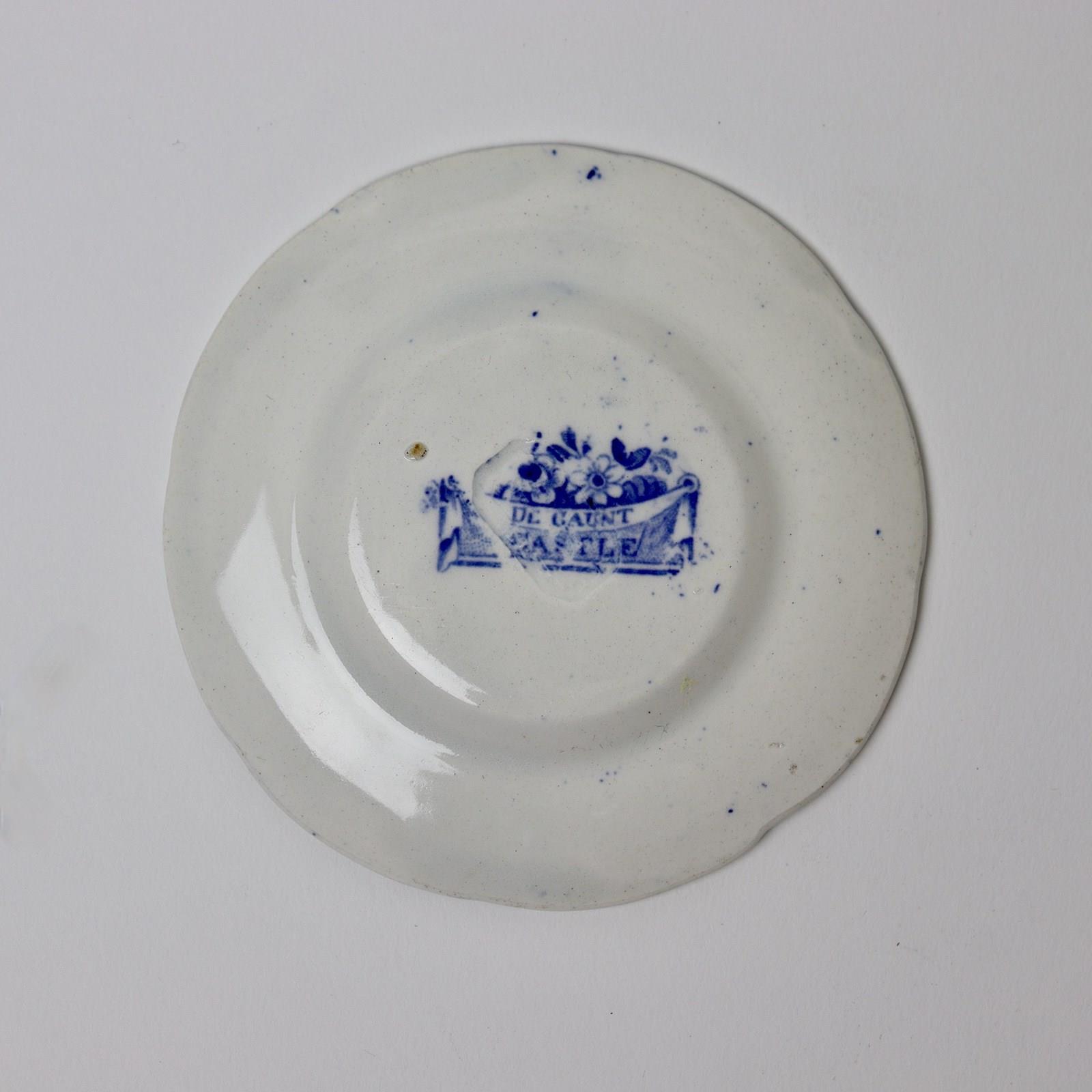 A miniature, blue and white transfer printed plate with a central print of a castle and a border of flowers and foliage. This has a blue transfer printed mark to the reverse which reads “DE GAUNT CASTLE”. It is from a series of miniature pottery which was made by Minton and it dates from c.1820. It is lightly potted and the transfer has good detail. It is in excellent condition.