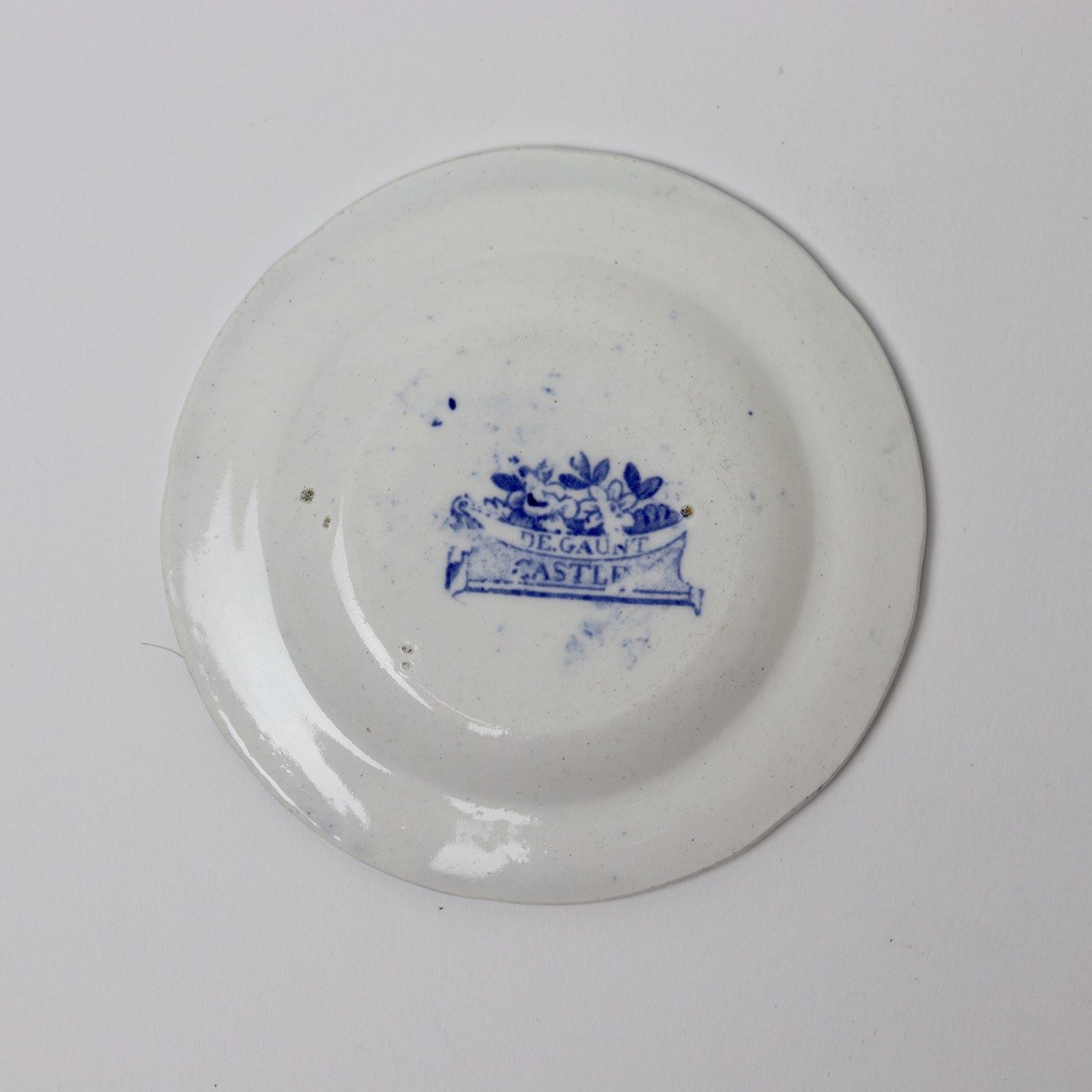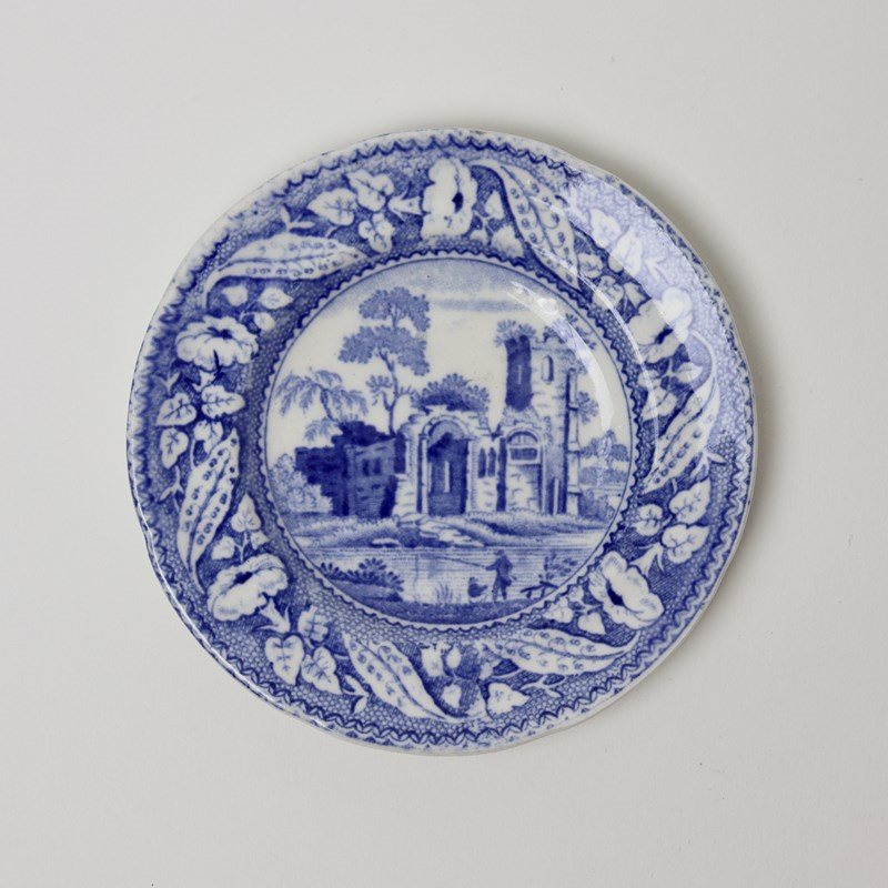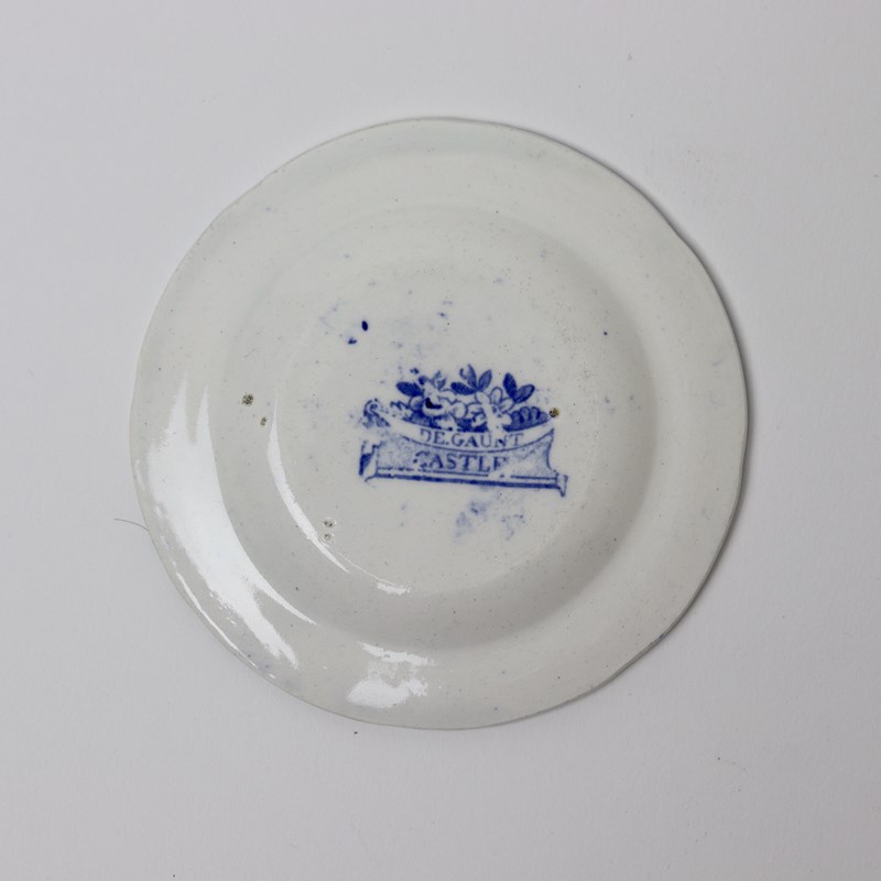 A miniature, blue and white transfer printed plate with a central print of a castle and a border of flowers and foliage. This has a blue transfer printed mark to the reverse which reads “DE GAUNT CASTLE”. It is from a series of miniature pottery which was made by Minton and it dates from c.1820. It is lightly potted and the transfer has good detail. It is in excellent condition.