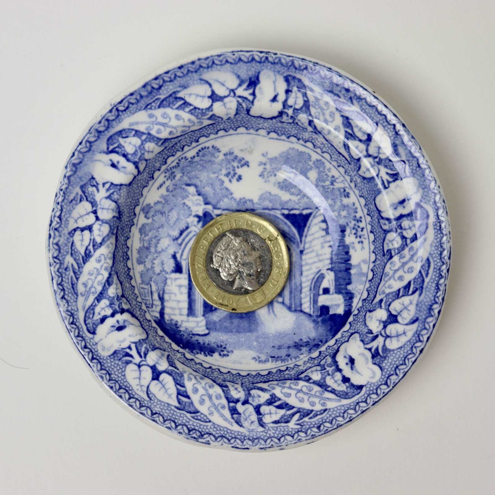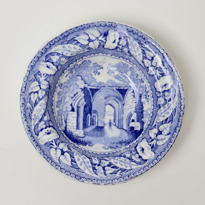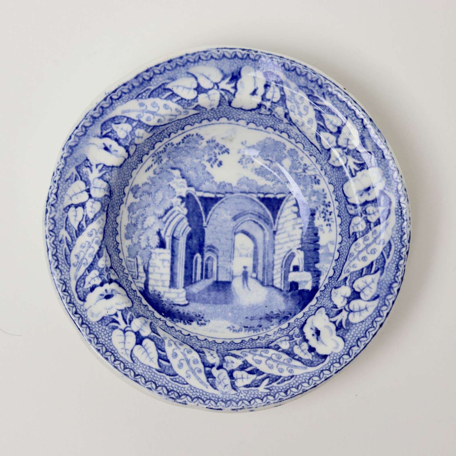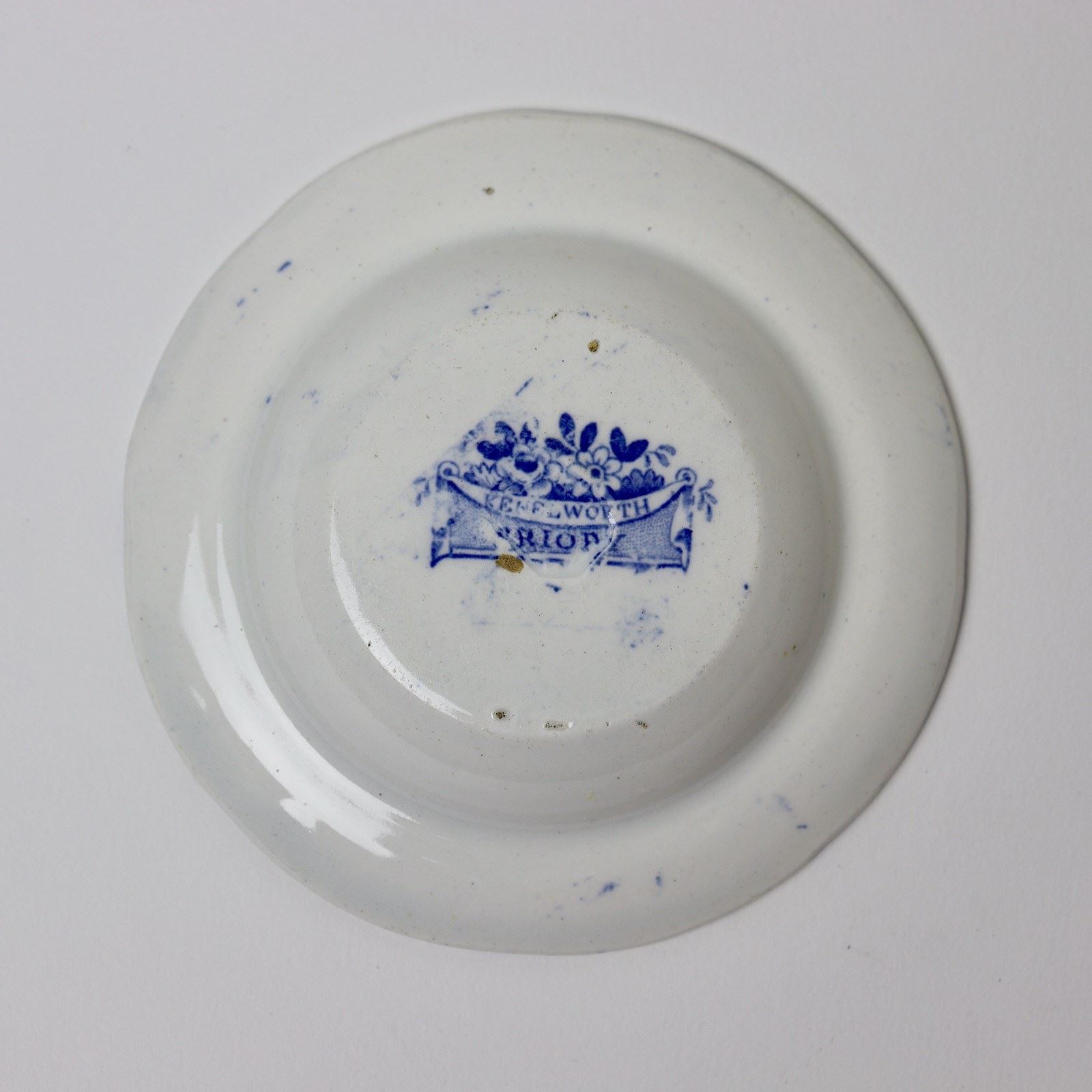 A miniature, blue and white transfer printed soup plate with a central print of a priory and a border of flowers and foliage. This has a blue transfer printed mark to the reverse which reads “KENILWORTH PRIORY”. It is from a series of miniature pottery which was made by Minton and it dates from c.1820. It is lightly potted and the transfer has good detail. It is in excellent condition.