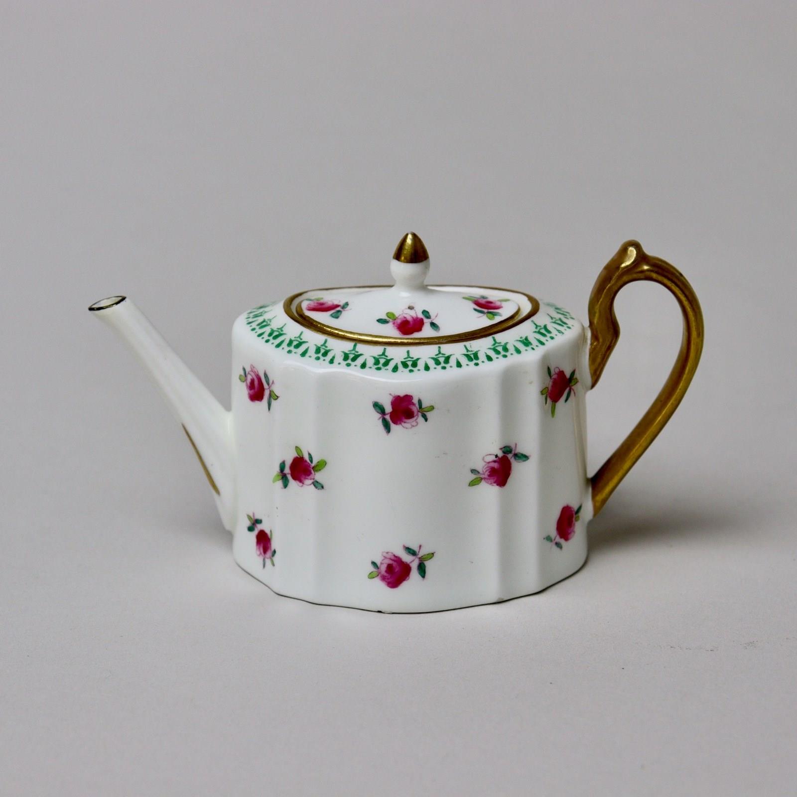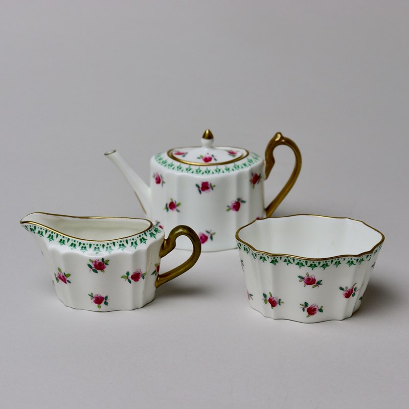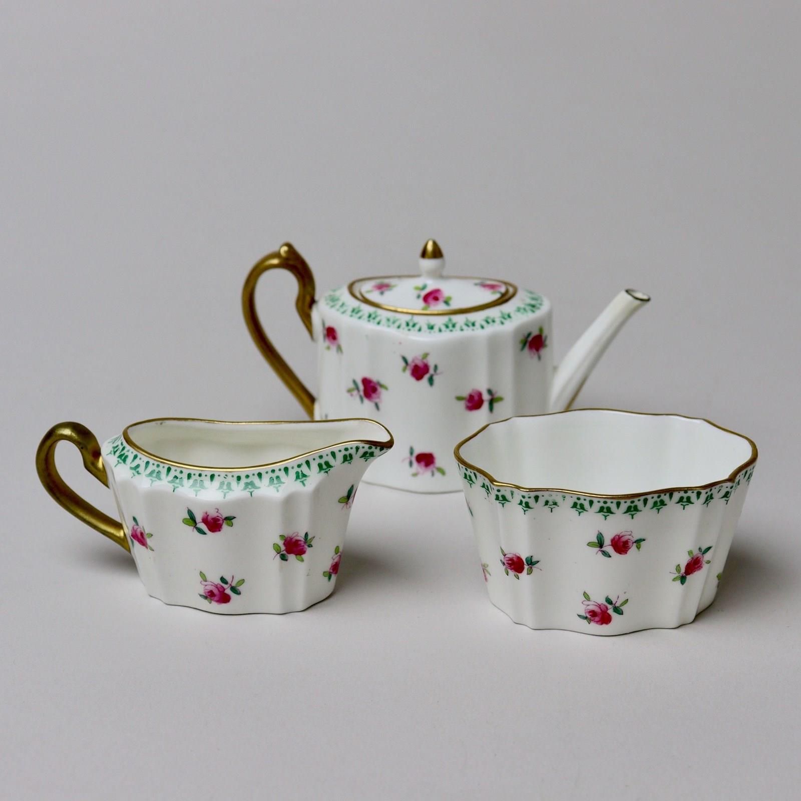 A miniature, Wedgwood, bone china tea set comprising teapot, jug and sucrier. Each piece is marked with a brown transfer printed mark showing the Portland vase above “WEDGWOOD ENGLAND” and it dates from c.1900. There is also a pattern number ”Z3604” painted in red enamel. Each piece is decorated with small, pink roses, which are hand coloured over an outlined transfer, and a green transfer printed border. There is gilding to the rims, handles and the finial on the teapot. It is all in excellent condition.