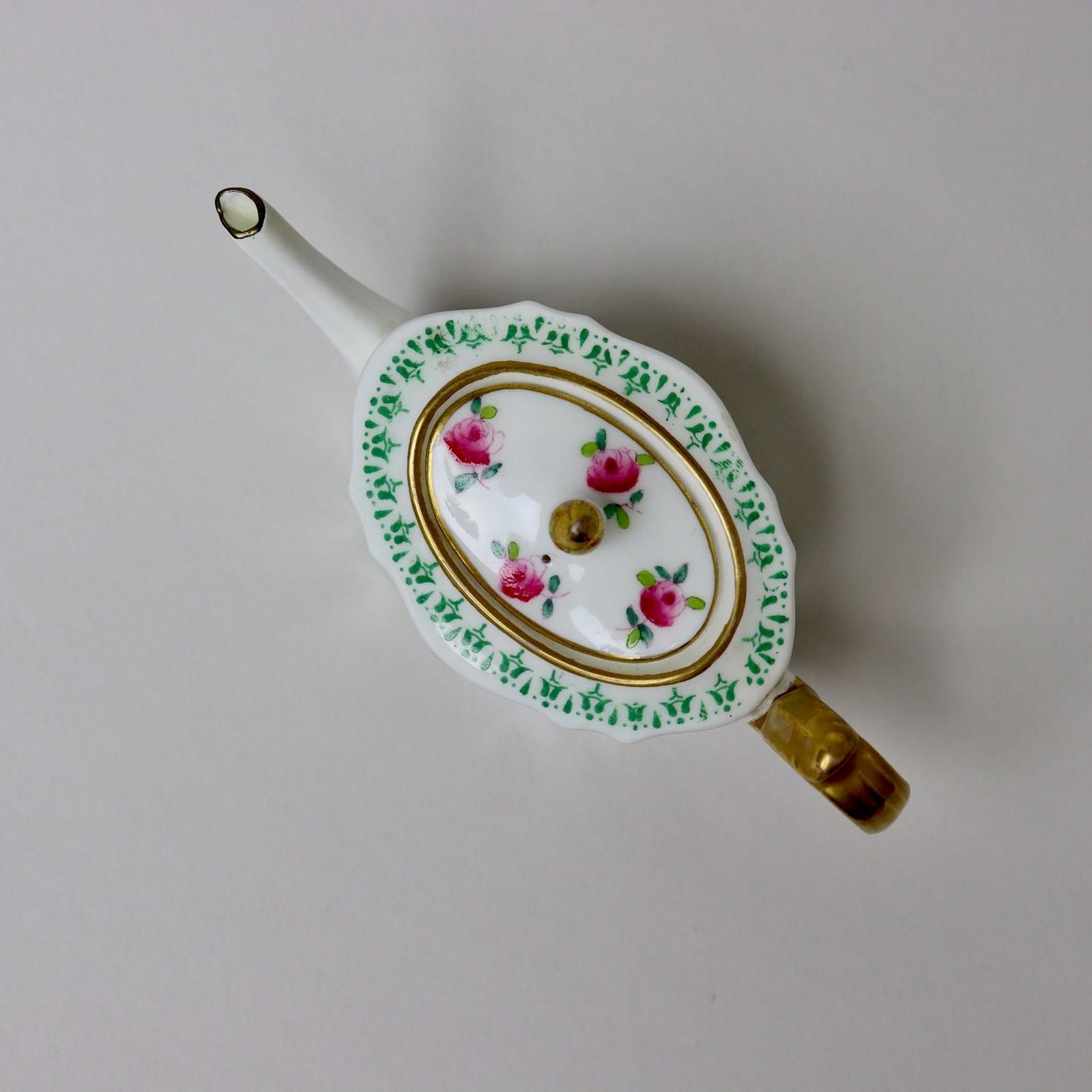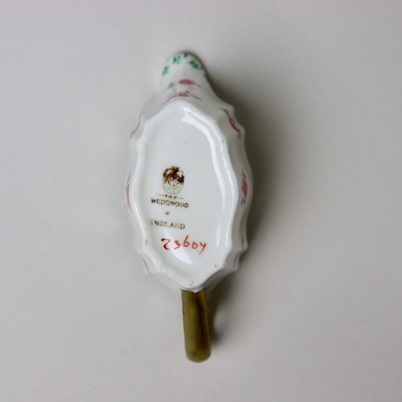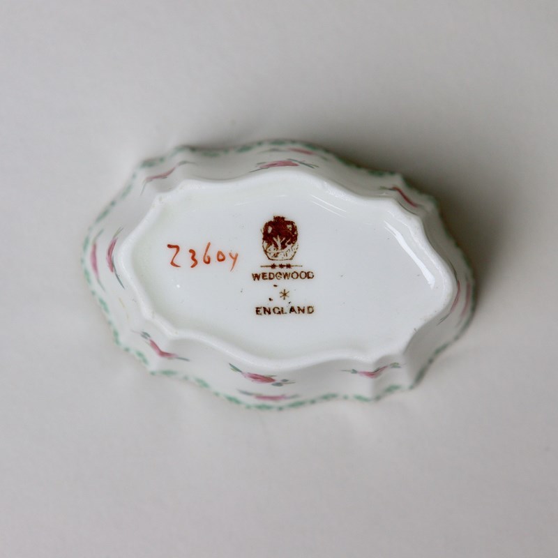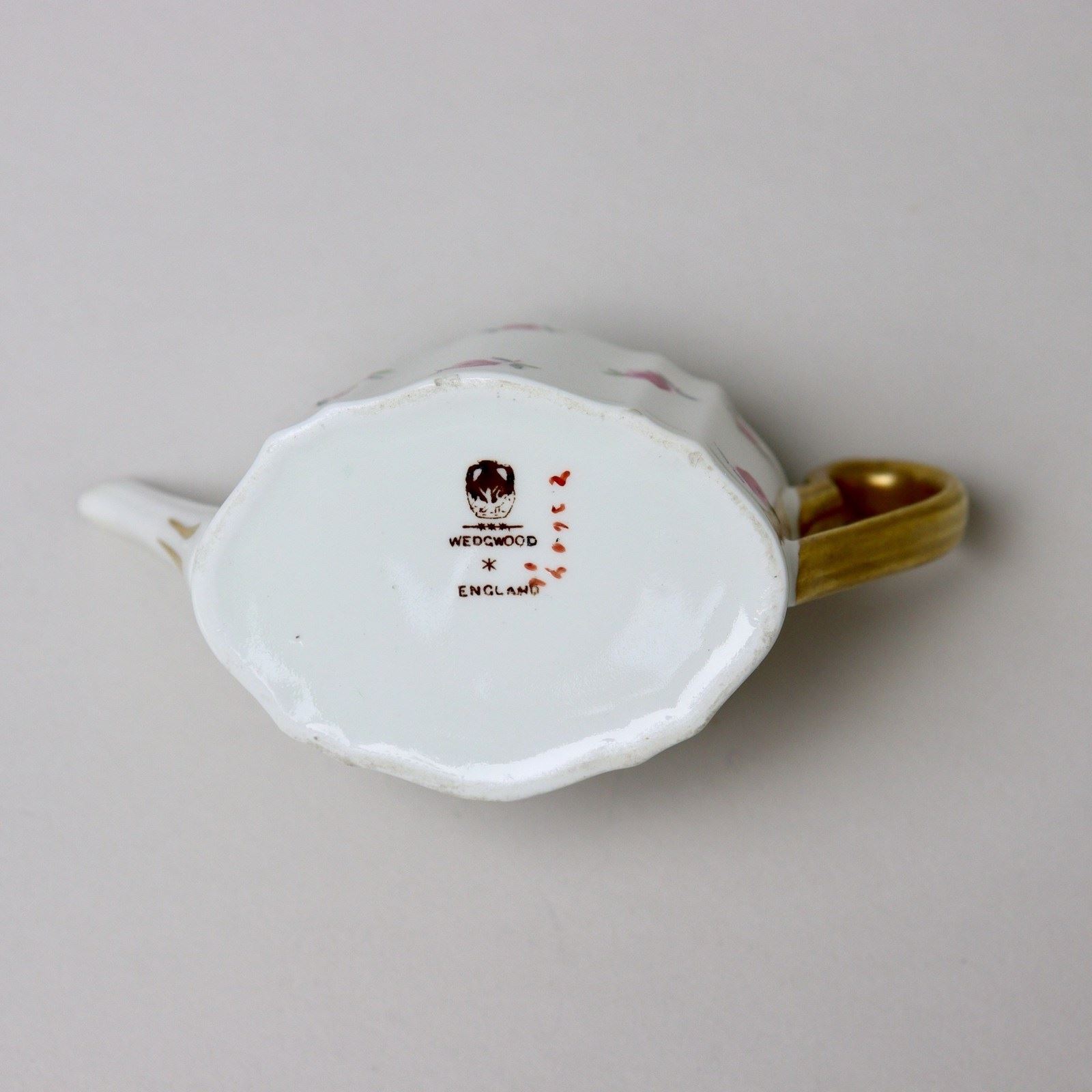 A miniature, Wedgwood, bone china tea set comprising teapot, jug and sucrier. Each piece is marked with a brown transfer printed mark showing the Portland vase above “WEDGWOOD ENGLAND” and it dates from c.1900. There is also a pattern number ”Z3604” painted in red enamel. Each piece is decorated with small, pink roses, which are hand coloured over an outlined transfer, and a green transfer printed border. There is gilding to the rims, handles and the finial on the teapot. It is all in excellent condition.