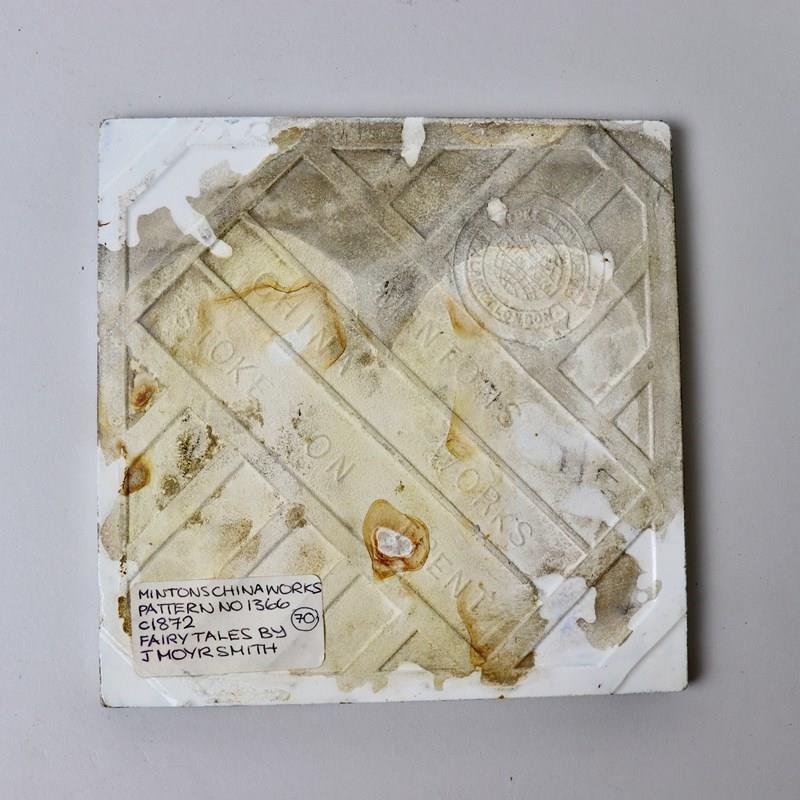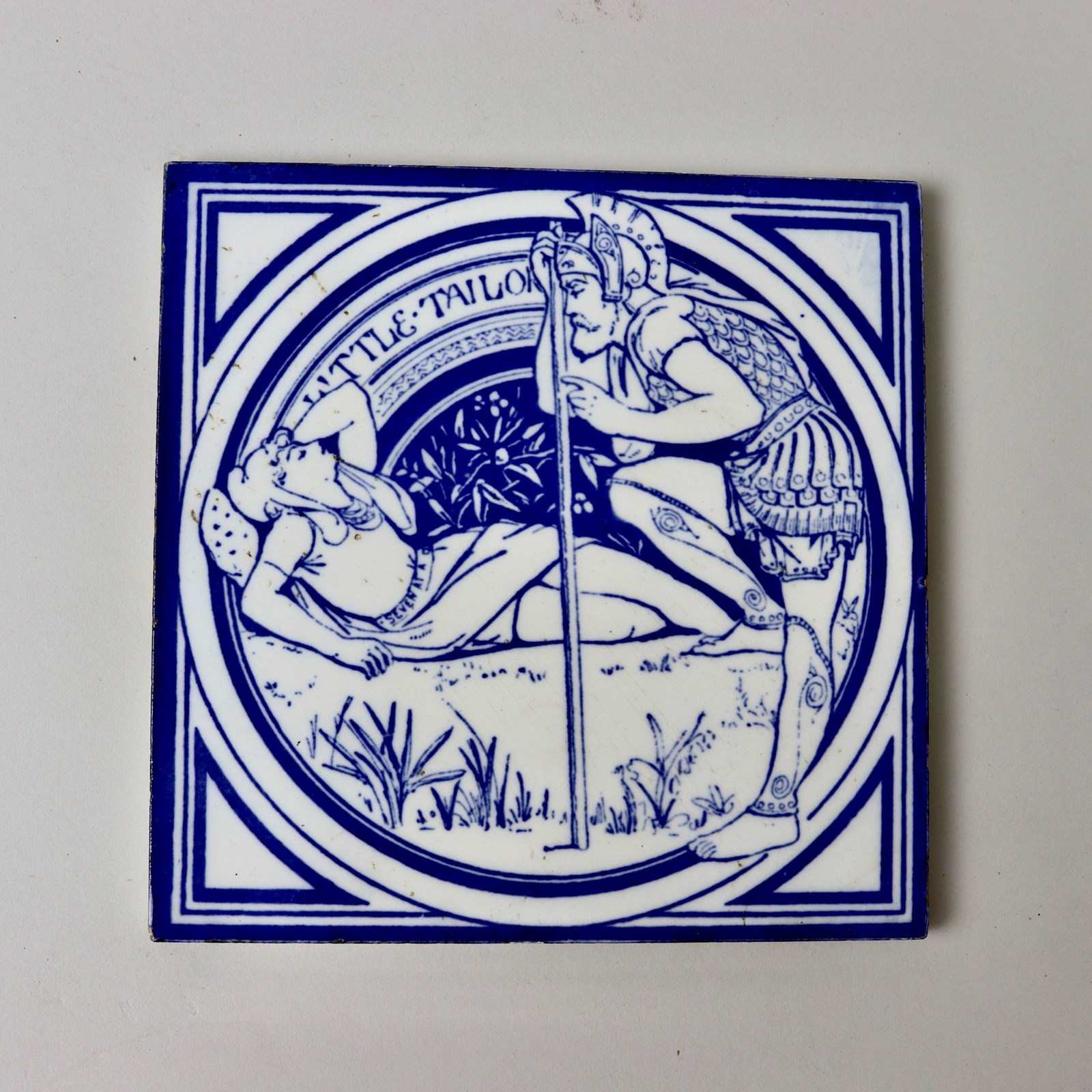A Minton, dust pressed tile from the Fairy Tale series. This is marked, in the casting, “MINTONS CHINA WORKS STOKE IN TRENT” beneath the globe mark with “MINTON” across the centre, surrounded by “STOKE UPON TRENT WALBROOK LONDON”. This series was designed by Moyr Smith and the tile dates from c.1880. It is printed, in blue, and titled “LITTLE TAYLOR” and it is signed “M S”. There is very slight chipping to the rim but otherwise it is in good condition.