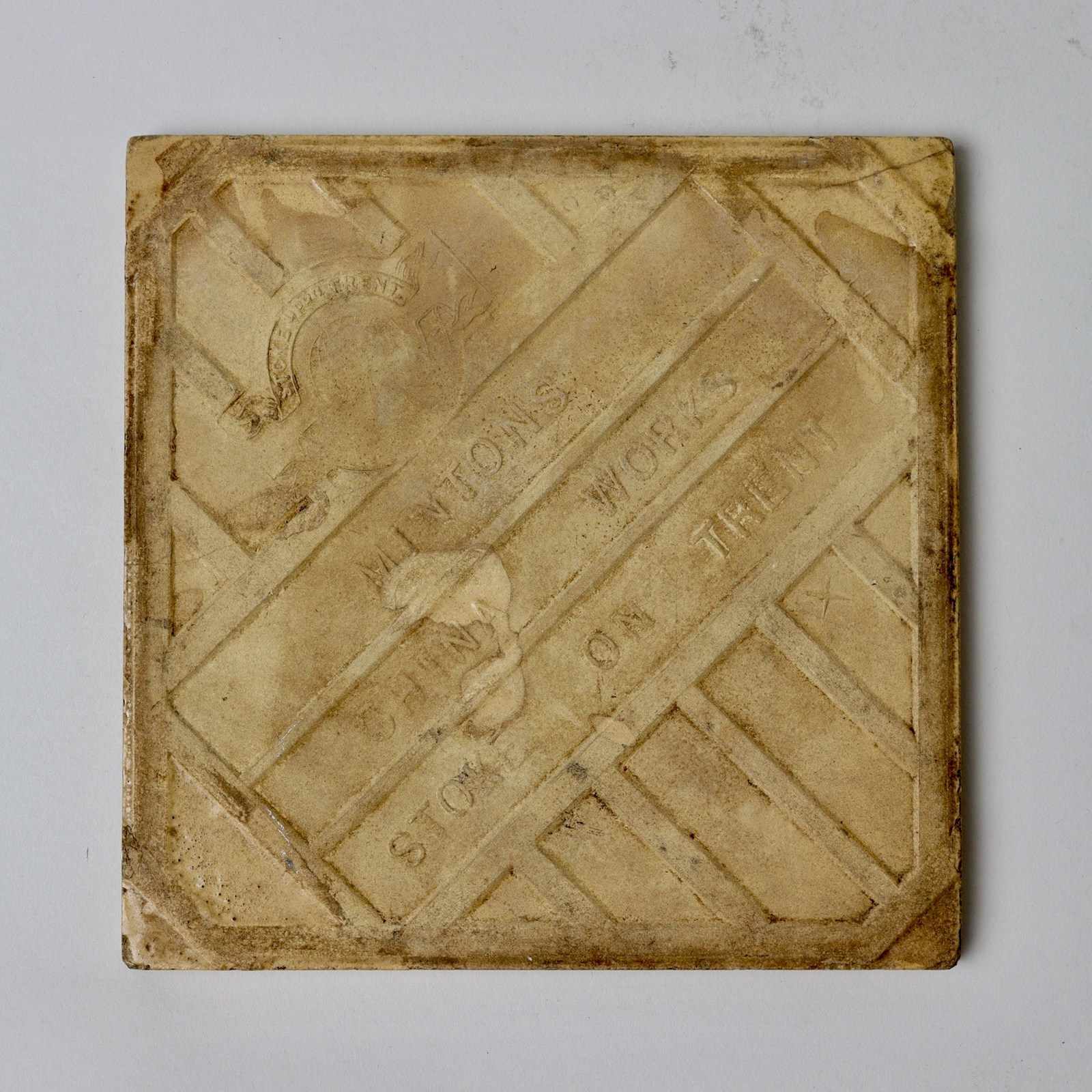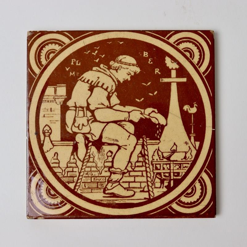 A nineteenth century, Minton, dust pressed tile from a series depicting the trades. This tile is marked “MINTONS CHINA WORKS STOKE ON TRENT” in the moulding and it is also marked “MINTON” across a globe, surrounded by STOKE UPON TRENT WALBROOK LONDON”. This series was designed by Moyr Smith and was produced in many different colours. This example is block printed in brown, on a buff background, with “PLUMBER”. It dates from c.1880. There are a few very small chips to the rim and a crack to one side which runs part way across the tile.