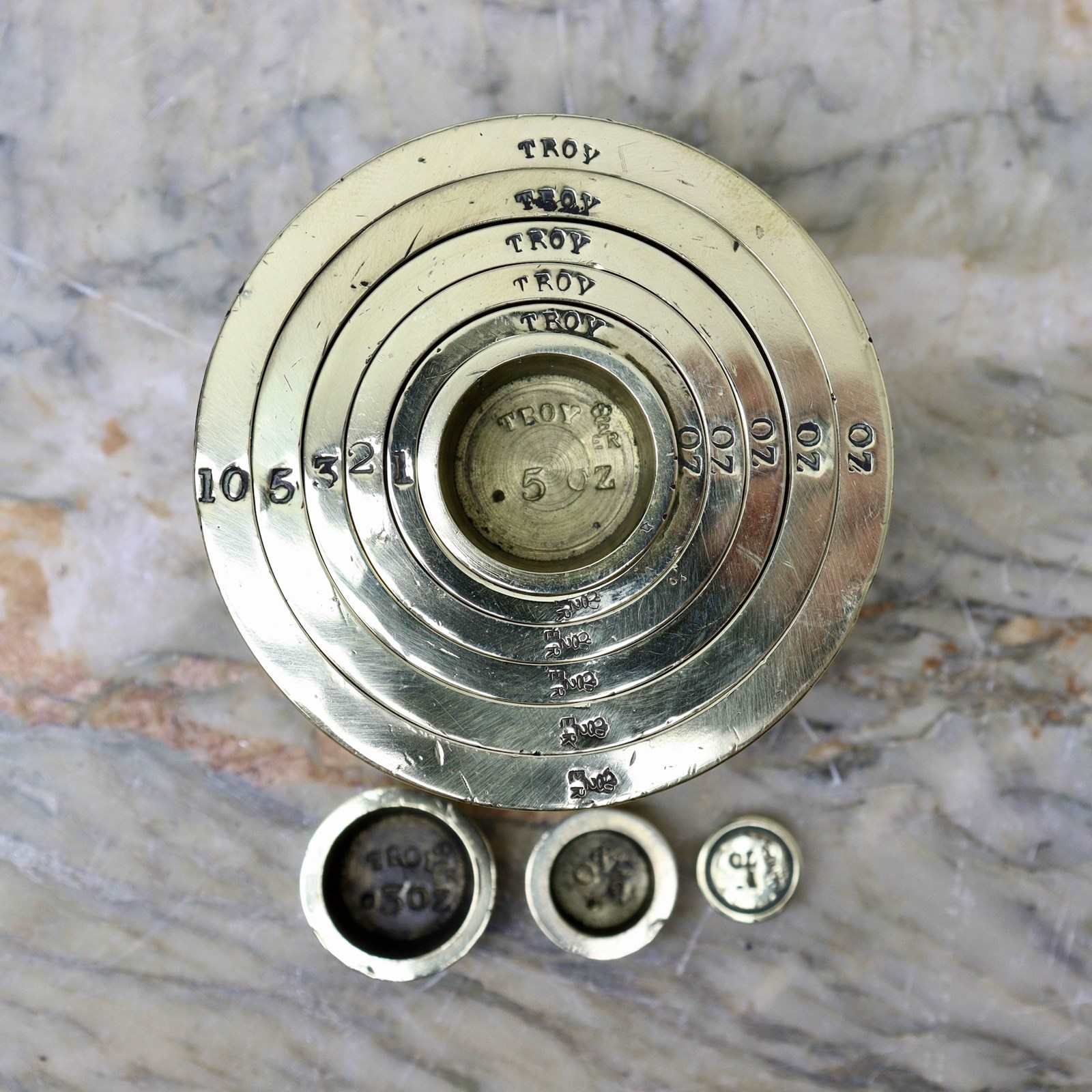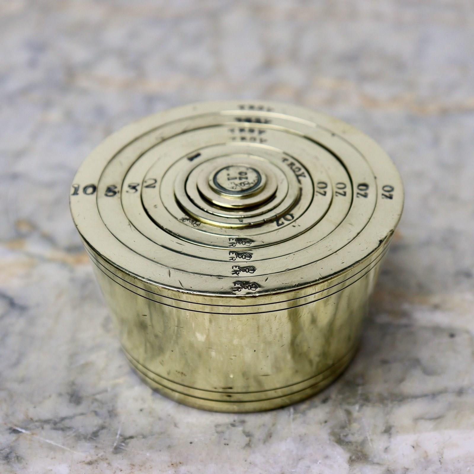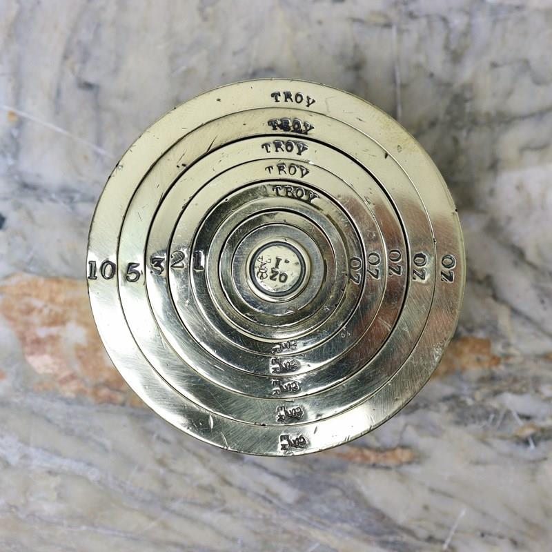 A nest of brass weights. These are marked with Elizabeth the Second’s assay mark of “ER 2” beneath a crown and they date from c.1960. They are also marked with the weights in Troy ounces which range from 10 ounces down to 0.1 of an ounce. They are in good condition but, originally, there would have been an outer container.