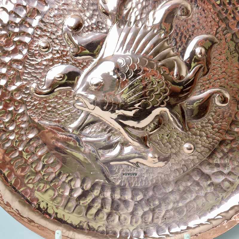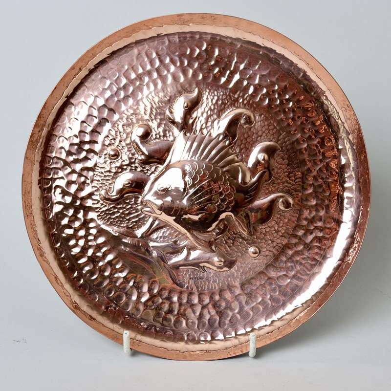 A small, Newlyn Copper tray. This is marked “NEWLYN” just under the design on the face of the tray, and it dates from c.1900. The design depicts a fish and is typical of the designs produced by the Newlyn Copper works from their inception in 1890 to when they closed about 30 years later. It is in excellent condition. The face has been polished but the reverse has not and it retains its original patina.