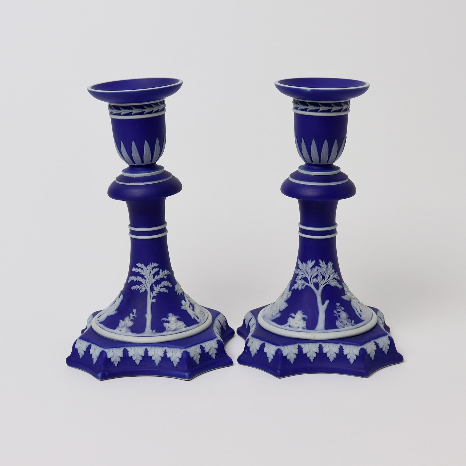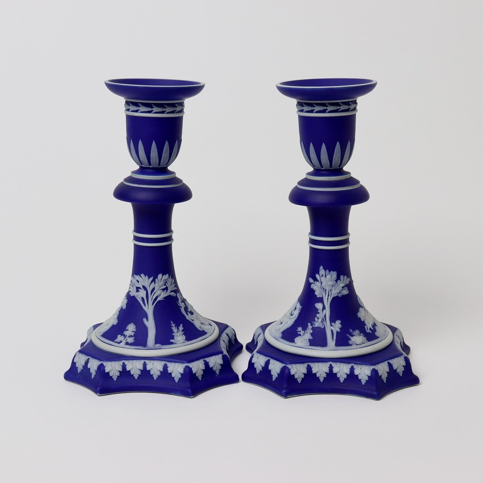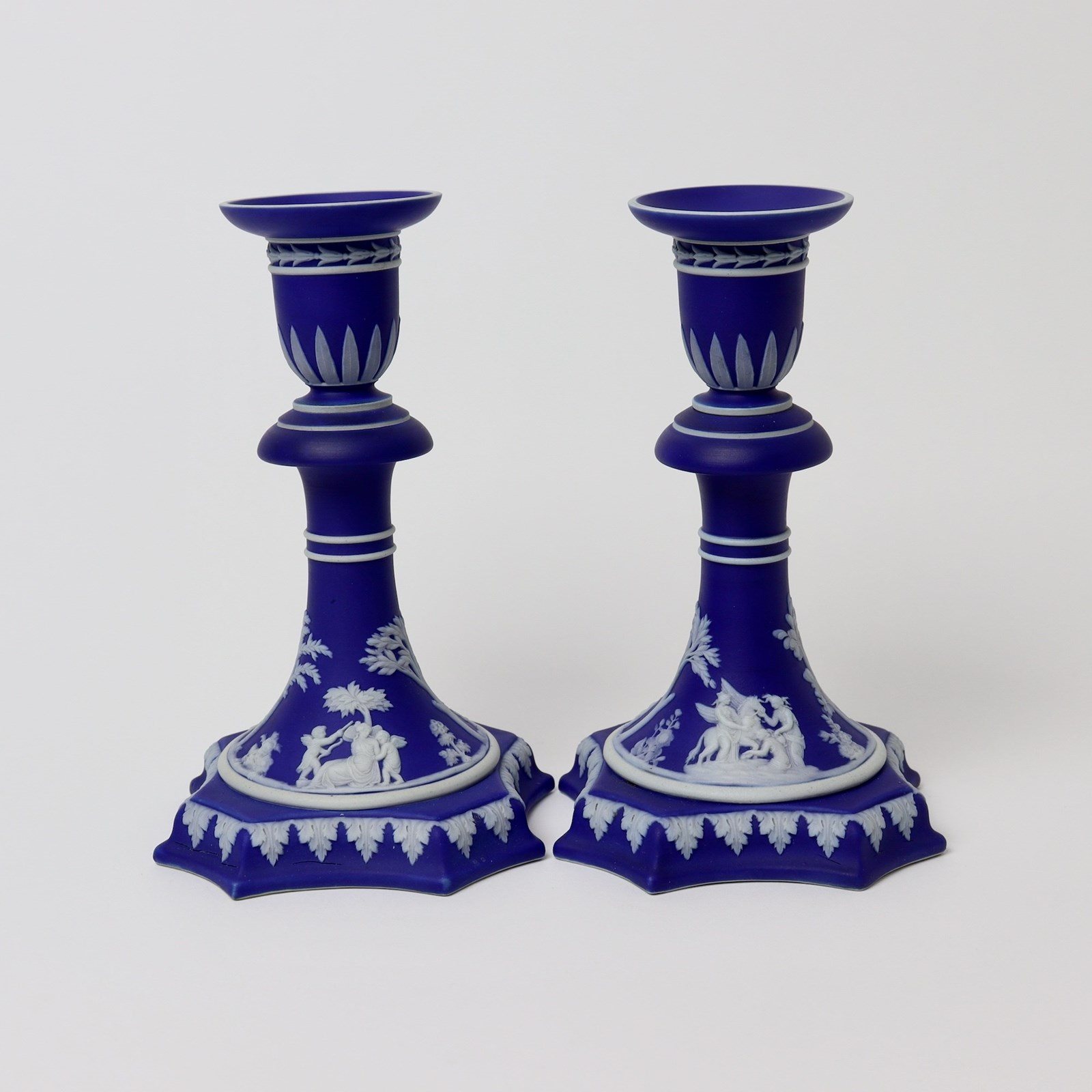 A good quality, pair of Wedgwood, dark blue jasper dip candlesticks. These are both marked “WEDGWOOD” and they date from c.1840. Each stick is decorated, in white relief, with classical subjects, trees and foliage and they also have a variety of leaf borders. The reliefs are all very good quality. This shape of candlestick was made in much more limited production than the simple stick form with circular bases. These are in very good condition, with no cracks, chips or restoration. However, one of the sticks has sagged in the kiln and this gives it a slight lean which you can see in the images. There is also a very small patch, on the rim of one, where the dip colour has not covered fully and this is also from the manufacture.