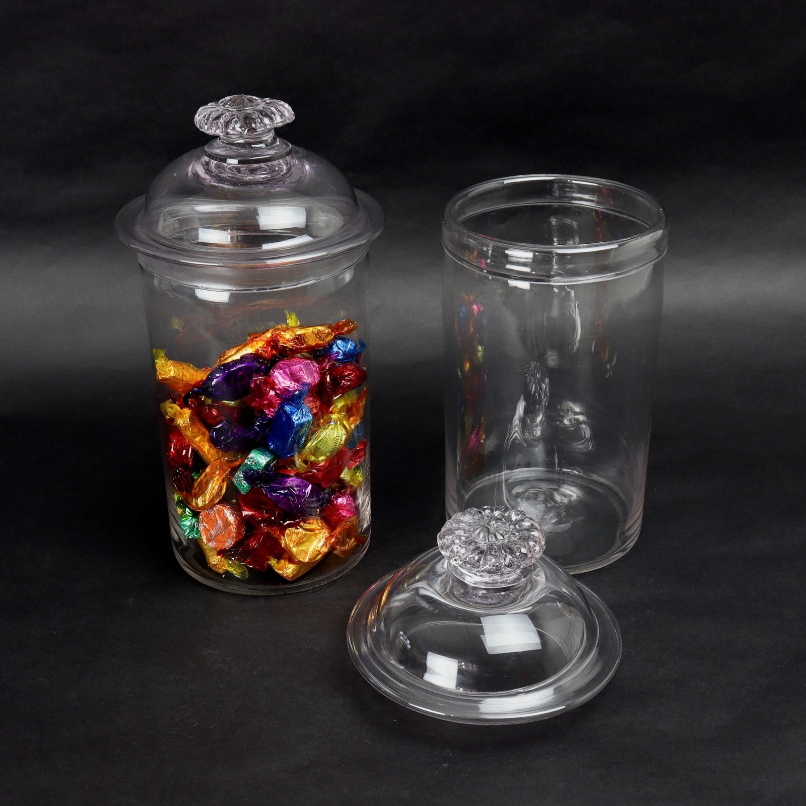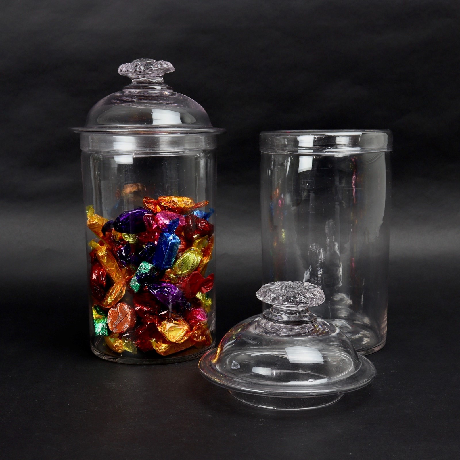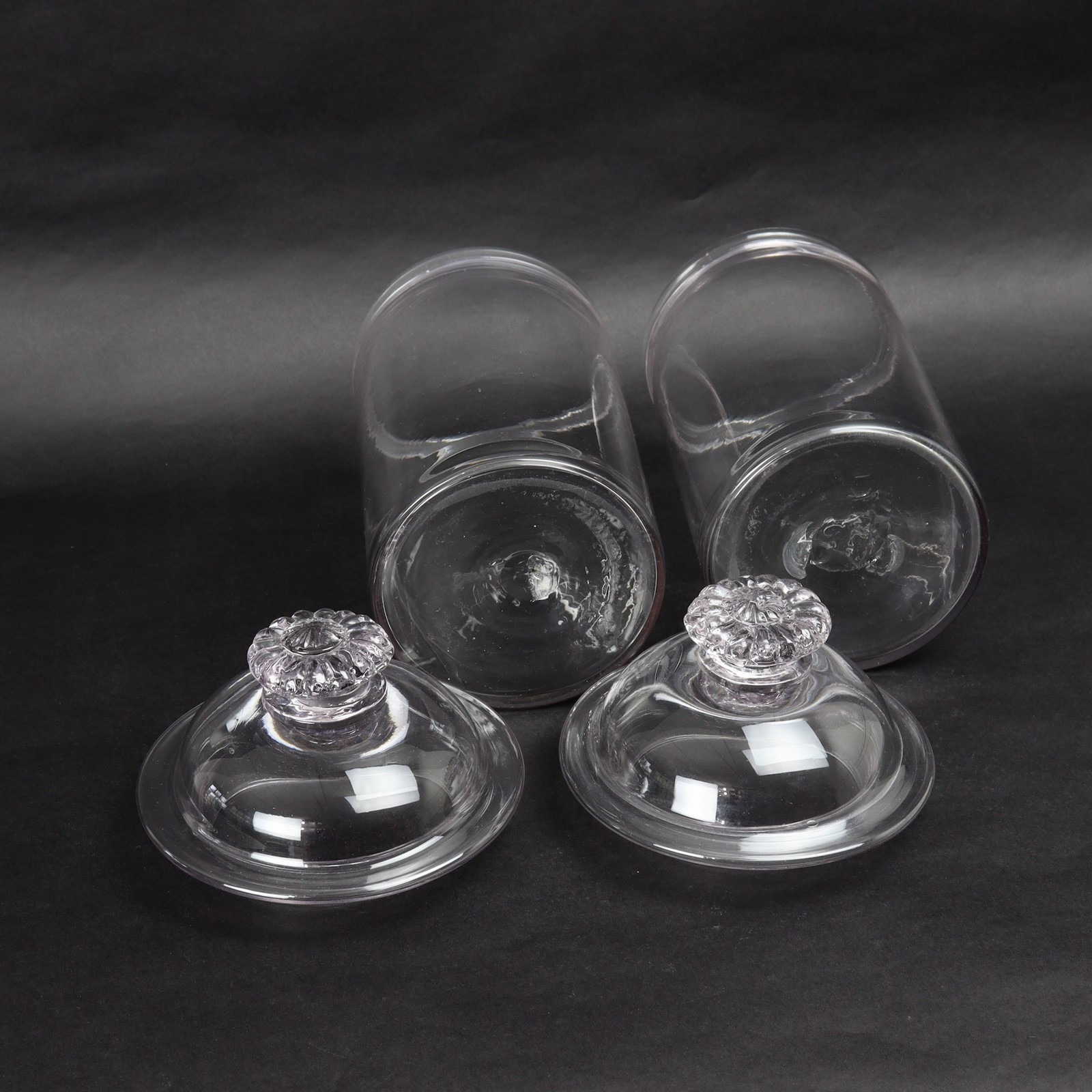 A super quality, pair of 19th century, French crystal storage jars. Although simple in shape these jars are nicely made. They have folded rims and flower shaped finials to the lids. They are made from a lovely quality crystal and they date from c.1840. They are in excellent condition. Dimensions: Height 29.4cm. Diameter 15.4cm. There are slight variations in the pair as they are hand blown and there has been an element of sagging in the kiln. This is why the finials are not quite level and lean slightly to one side. Price includes postage within the U.K. Shipping to the U.S.A. add £40. Most of Western Europe add £20.