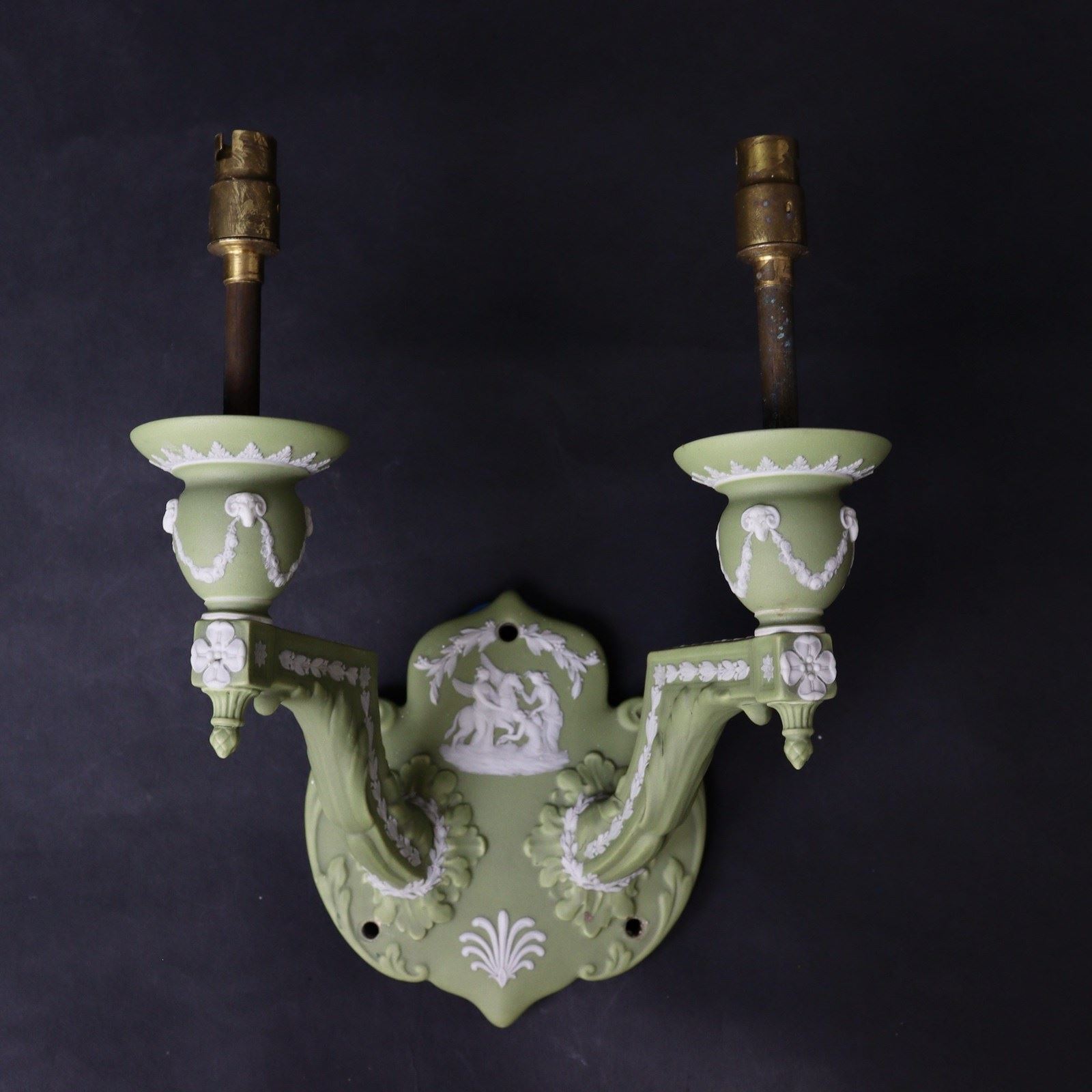 A rare pair of Wedgwood, pale green, jasper dip wall lights. One of these is marked “WEDGWOOD” but the other has escaped the marking process. They date from c.1895, when electric lighting was still in its early stages of use in houses and few could afford it. They were made, to special order, for a small stately home on the Norfolk/Lincolnshire border. We had a pair or these last year which had come from the same source. They are a charming shade of green and they are decorated, in white relief, with a scene depicting Pegasus, the winged horse, and various border designs and garlands. The reliefs are all very good quality. Due to the shape they would have been particularly difficult to fire without firing faults occurring and this is probably why Wedgwood didn’t continue with their production other than for the special order.