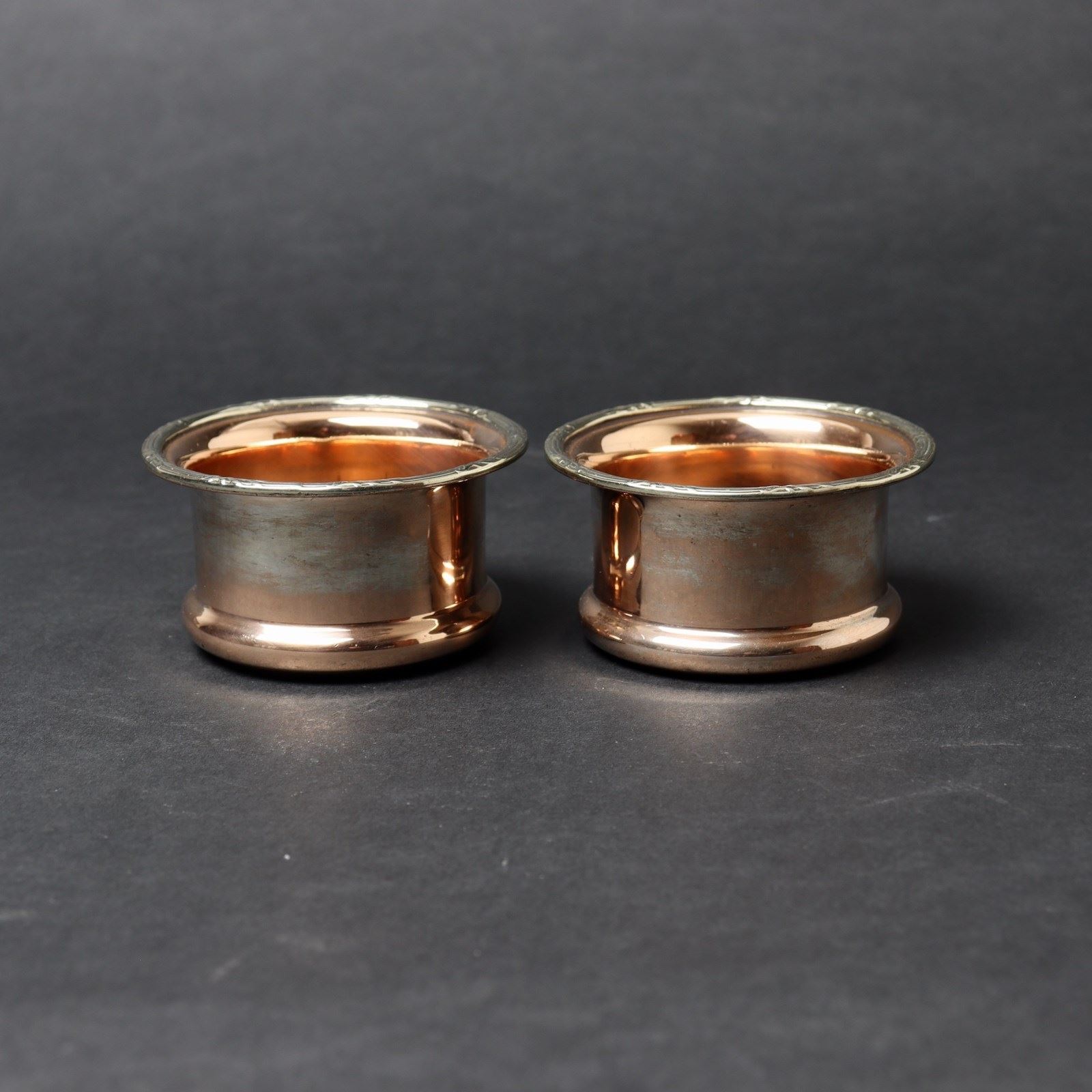 A pair of early 19th century, Sheffield Plate glass coasters. These are quite a simple, but pleasing design and they date from c.1830. It is common, with Sheffield Plate, for the plating to wear, which reveals the copper beneath. This gives it character, and desirability, and it should not be replated as this destroys the character. This pair are in good condition, with both revealing a lot of the copper. This can be seen in the images.