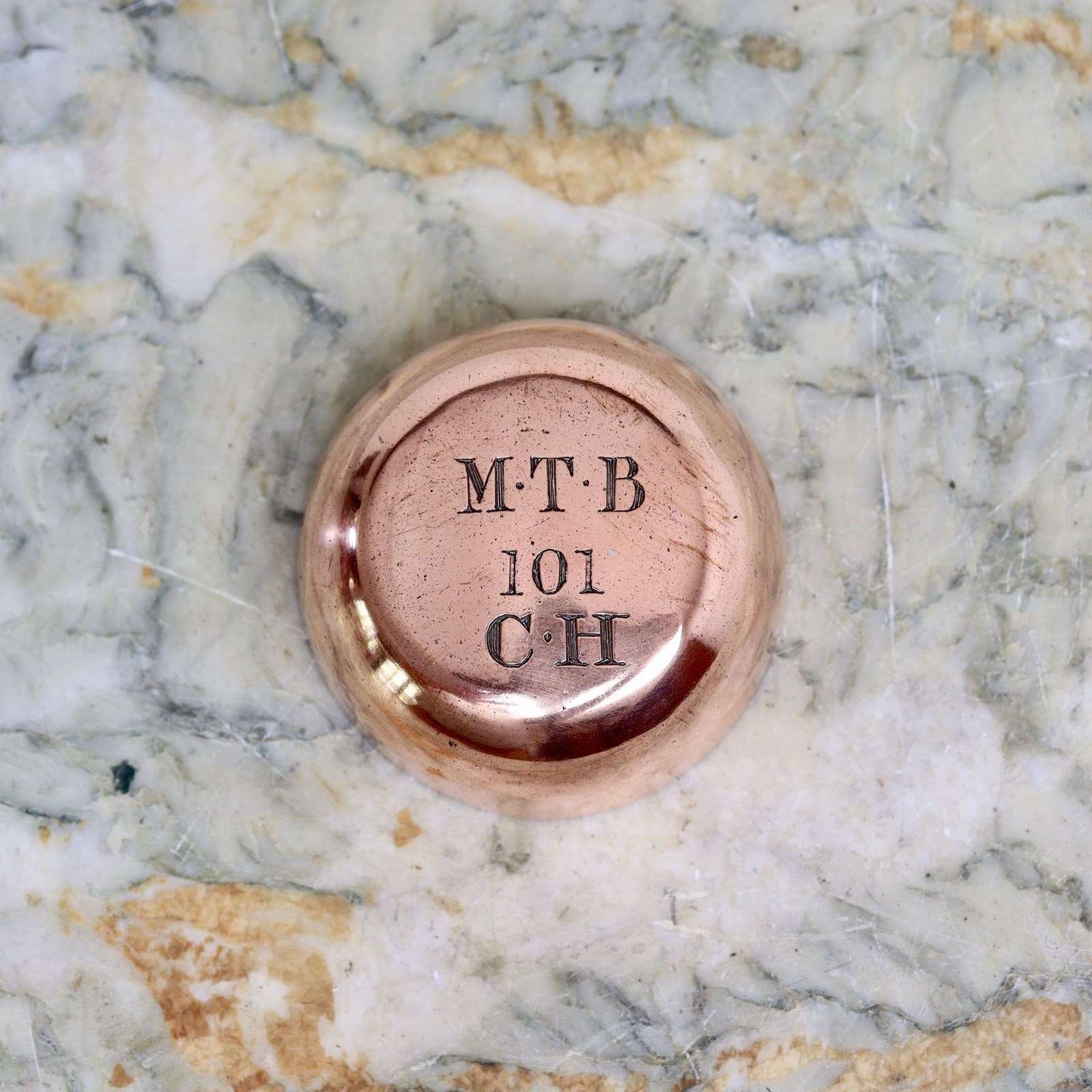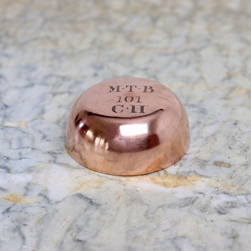 A miniature copper patty pan mould. This is engraved with the initials “M.T.B” above “101” above “C.H”. The initials would be those of the original owner. It is English and it dates from c.1880. It is in excellent condition and the tinning, to the interior, is still in usable condition.
