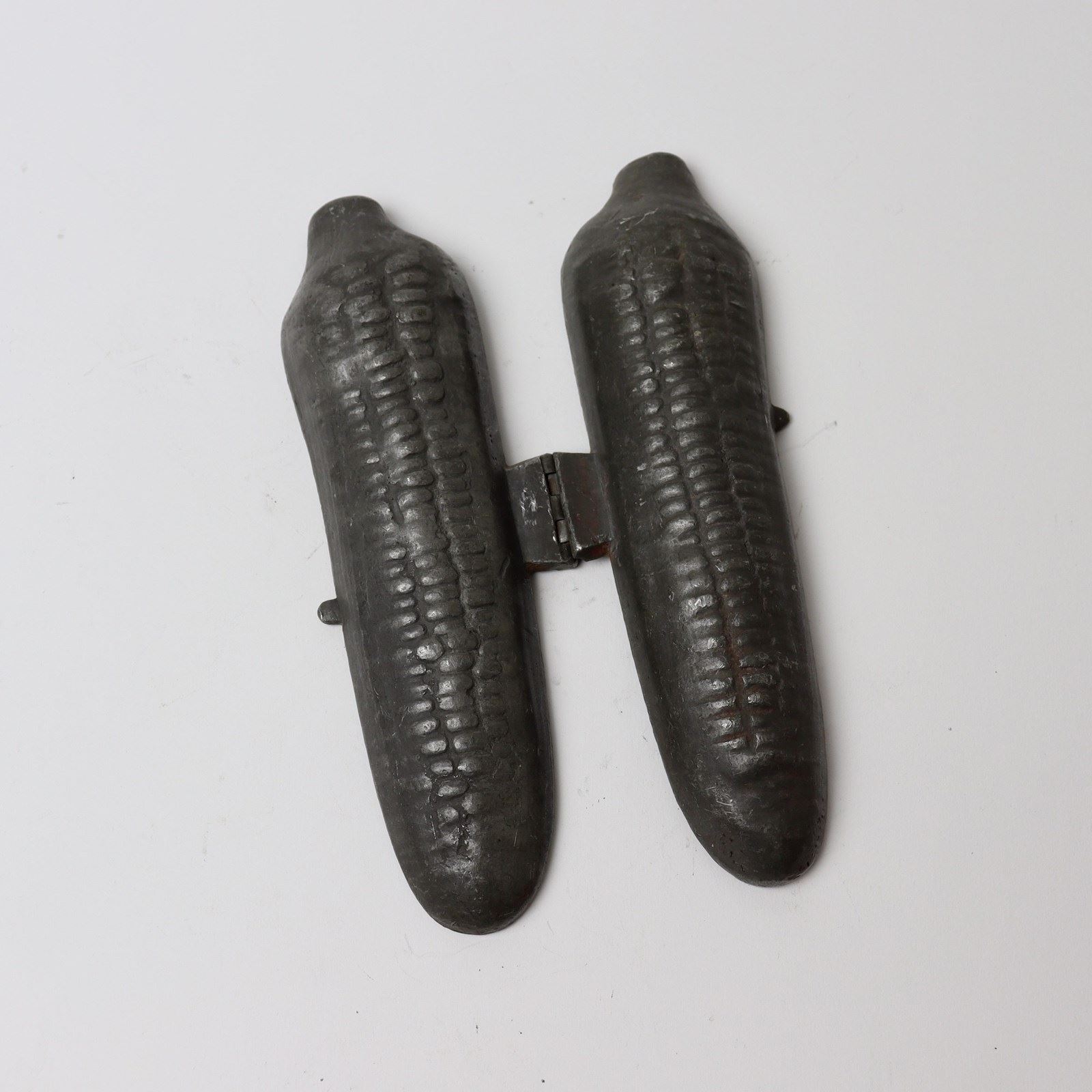 A pewter ice cream mould in the shape of a corn on the cob. This size of ice cream mould, which would turn out a life-size corn on the cob, is uncommon and hard to find compared to the small versions. This example, which has excellent detail in the design, is unmarked and it dates from c.1870. The hinge is a little loose but otherwise it is in good condition. The interior, although quite dark, is still in usable condition and the exterior has a dark patina.