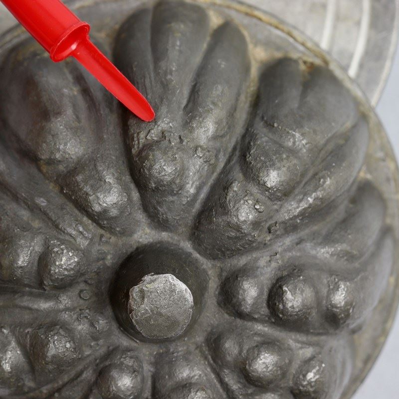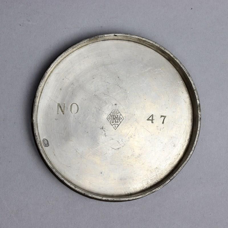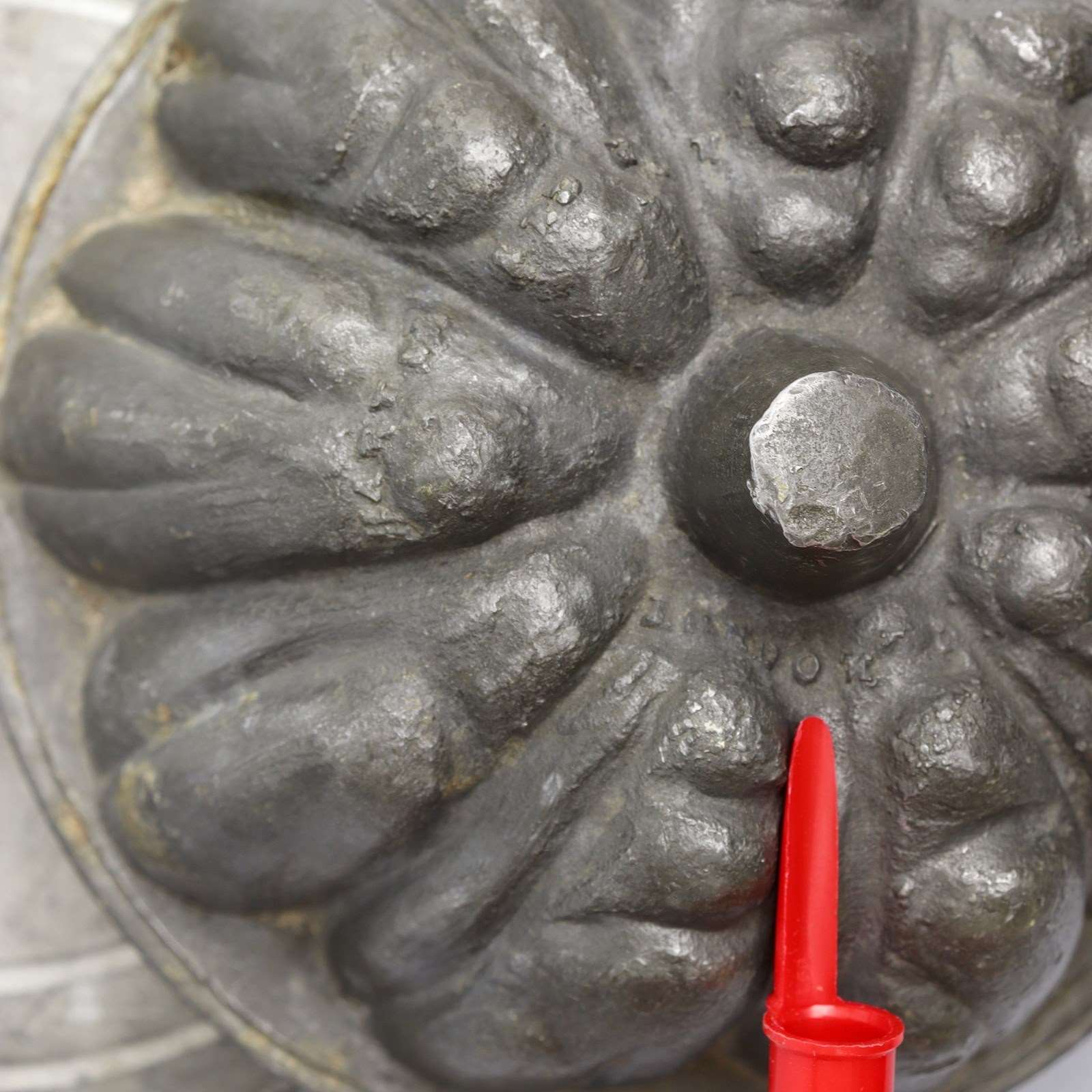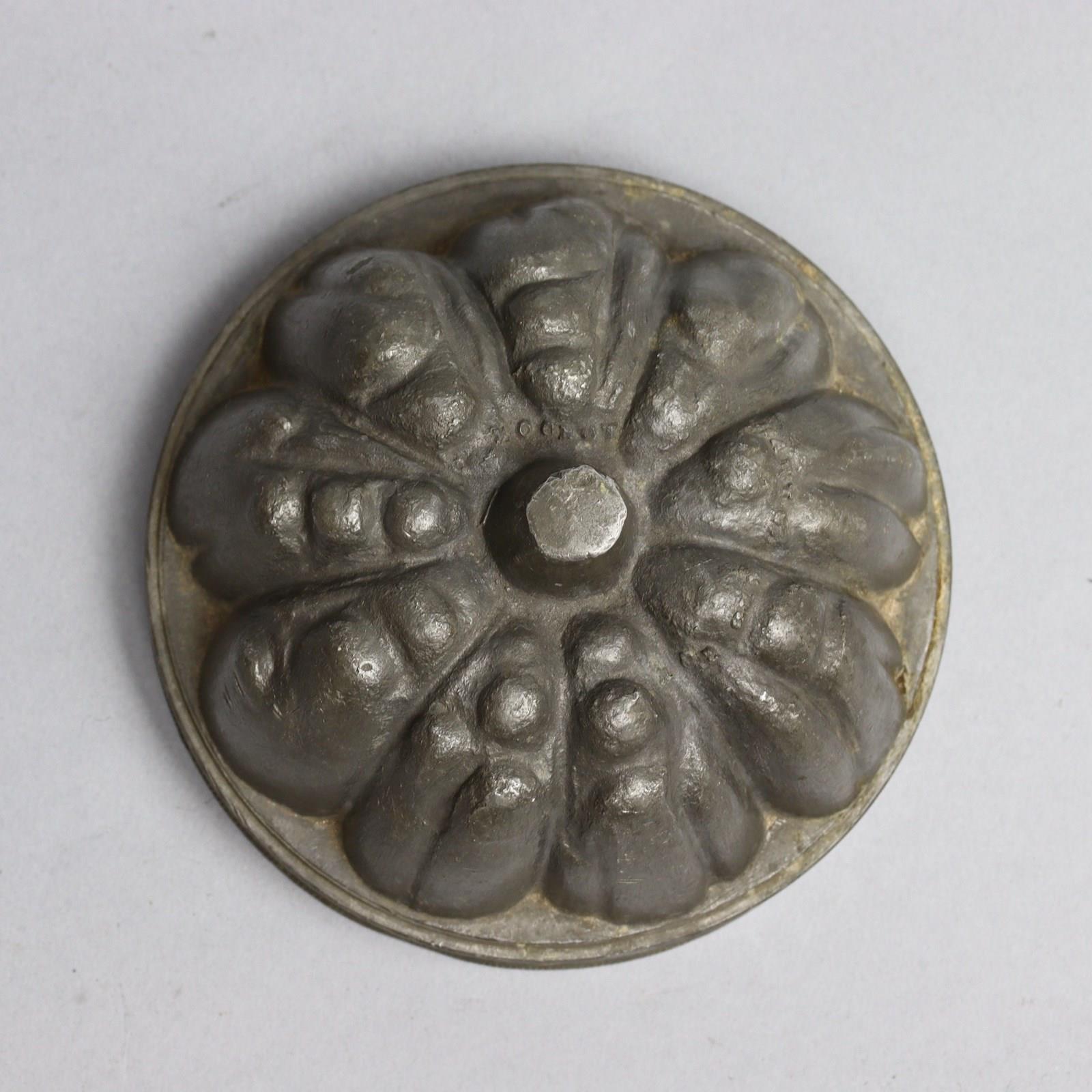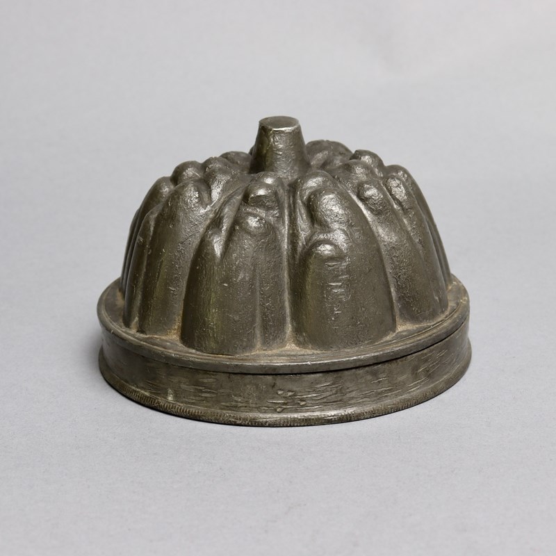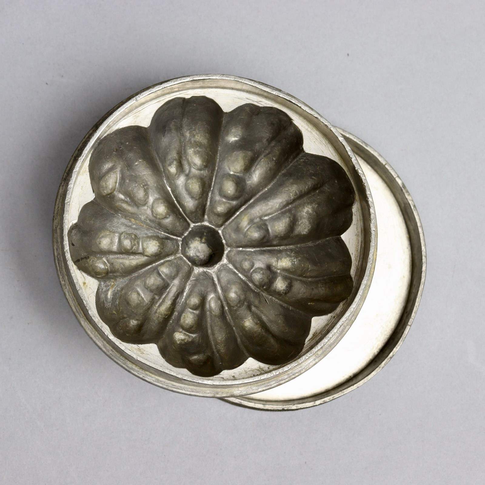 A pewter ice cream mould in the shape of half a gourd. This is marked, in the casting to the top of the mould, “HARTON LTD LONDON”. Harton and sons were pewterers in London from 1860 until 1890. To the interior of the base of the mould is a registered design kite mark which dates the registration of the design to the 22nd of July 1868 and it is also stamped with “NO 47” which would be a pattern number. The gourd is very naturalistically modelled and the mould is in very good condition. The interior is still in good, bright, usable condition and the exterior has a dark patina.