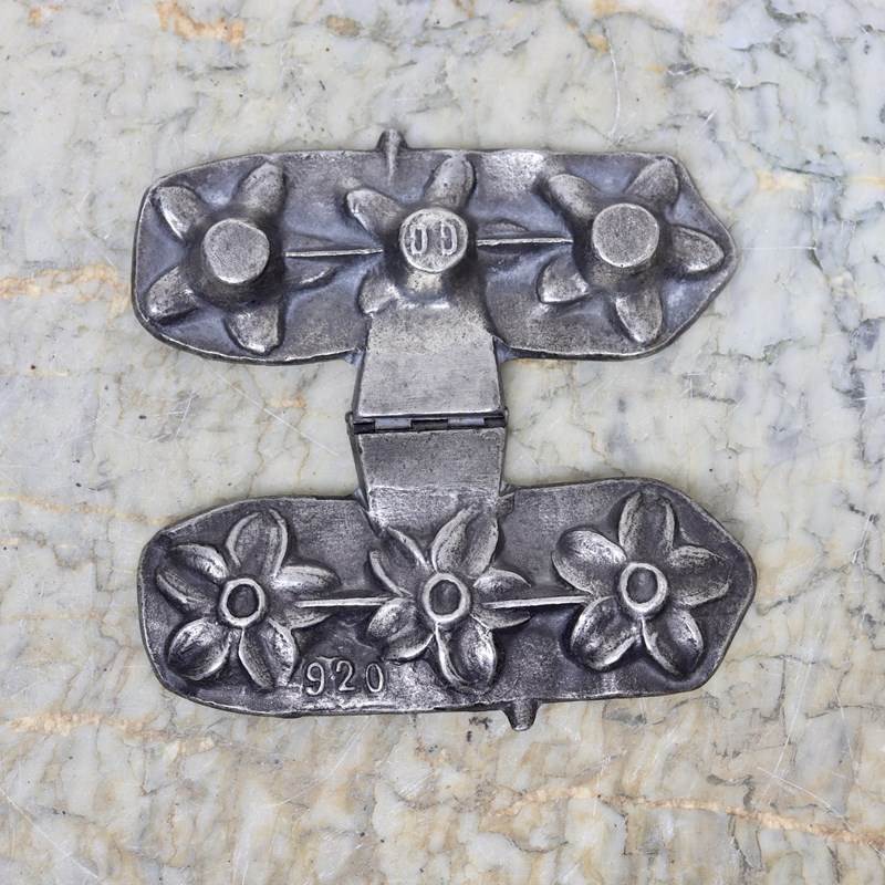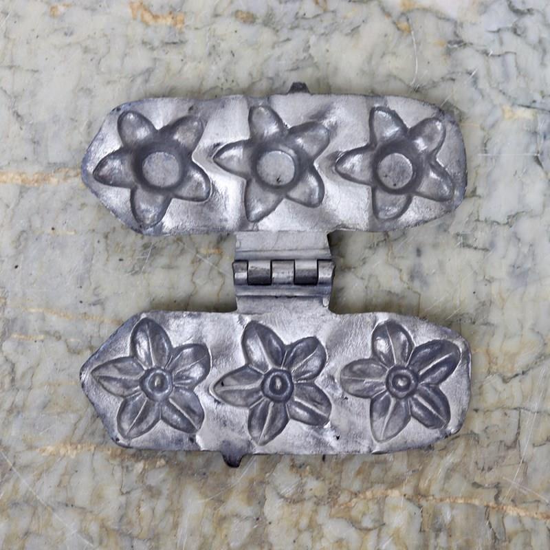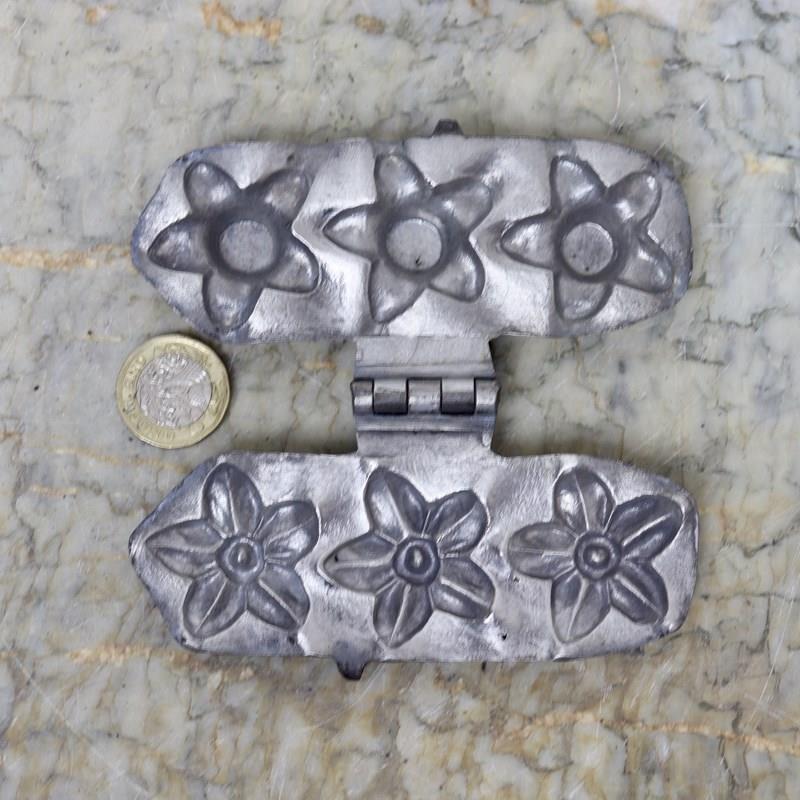 A small, pewter ice cream mould which would turn out three small flowers. This is marked, in the casting, “C.C” and “920”. C.C is the mark of the French company Cadot and 920 is the pattern number. The mould dates from c.1880. The flowers are well detailed and the mould is in good condition. The interior is in very good, bright, usable condition and the exterior has quite a dark patina.