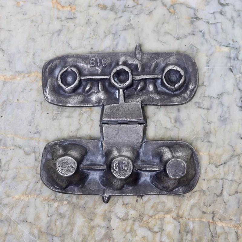 A small, pewter ice cream mould which would turn out three small roses. This is marked, in the casting, “C.C” and “919”. C.C is the mark of the French company Cadot and 919 is the pattern number. The mould dates from c.1880. The roses are well detailed and the mould is in good condition. The interior is in good, bright, usable condition and the exterior has a dark patina.