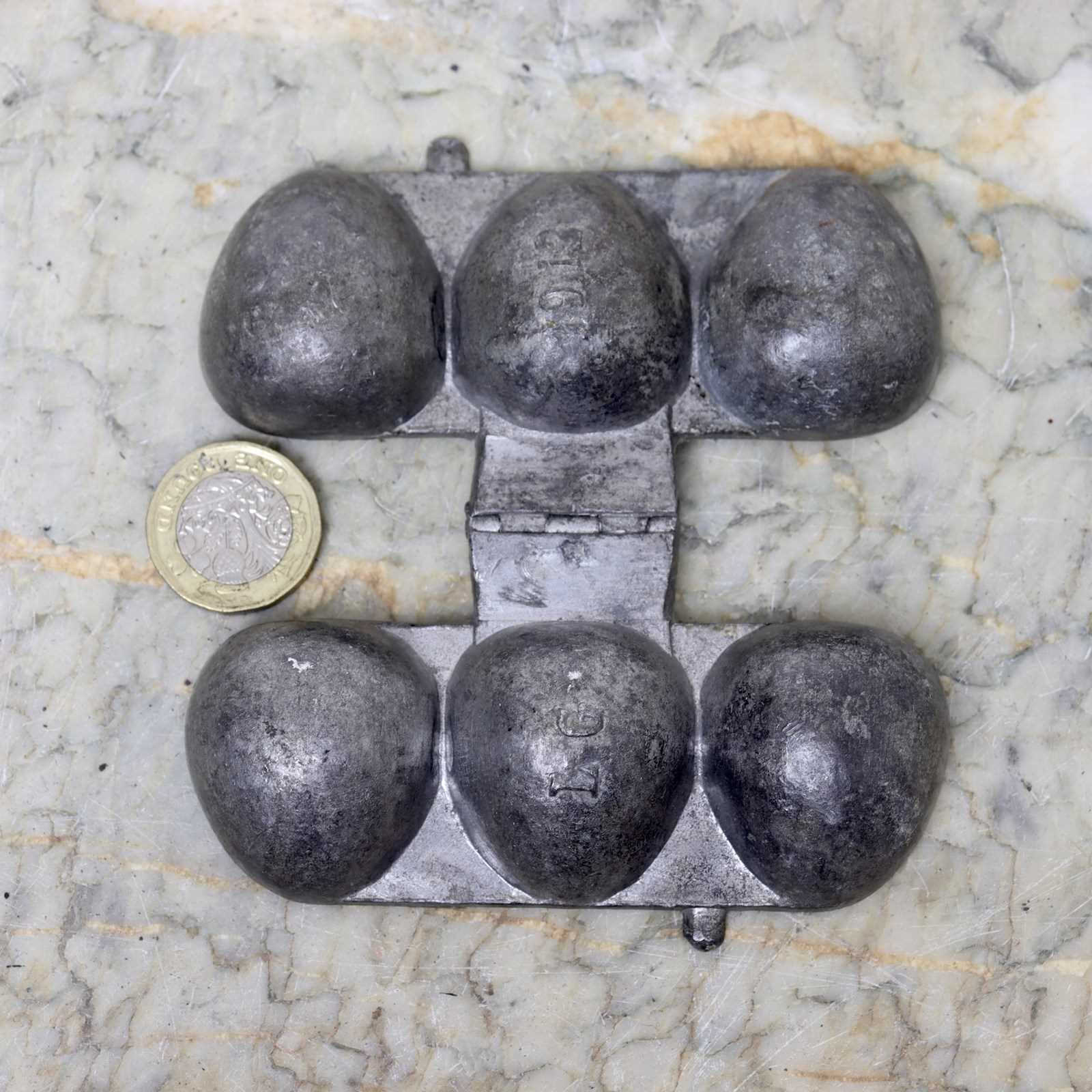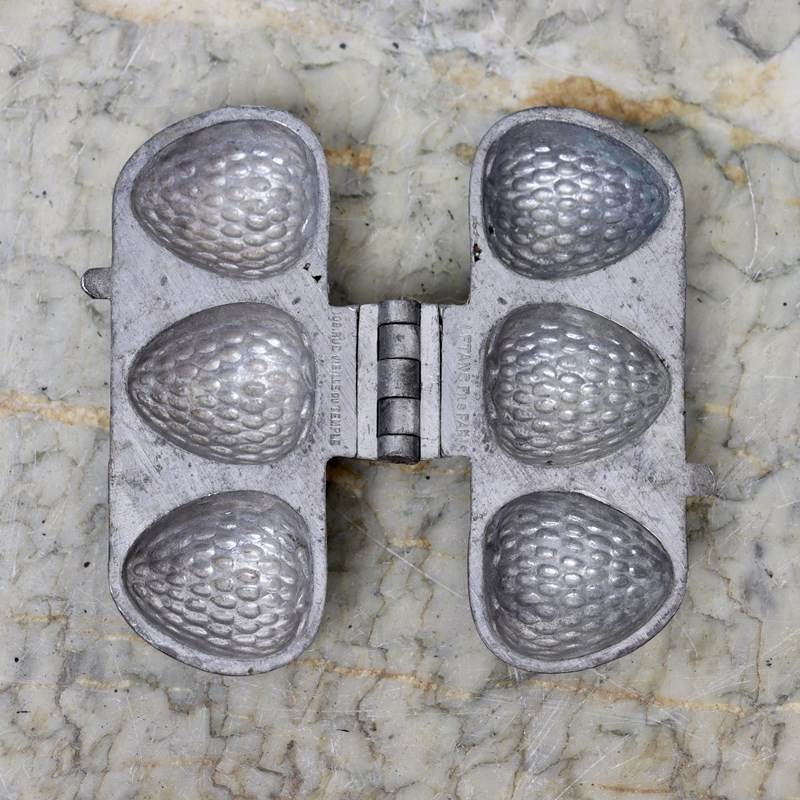 A small, pewter ice cream mould which would turn out three small strawberries. This is marked, in the casting, “L.G” and “1912”. L.G is the mark of the French company Letang and 1912 is the pattern number. It is also marked, on the interior of the hinge, “LETANG FILS PARIS 108 RUE VIELLE DU TEMPLE”. The mould dates from c.1880. The strawberries are extremely well detailed and the mould is in good condition. The interior is in very good, bright, usable condition and the exterior has quite a dark patina.