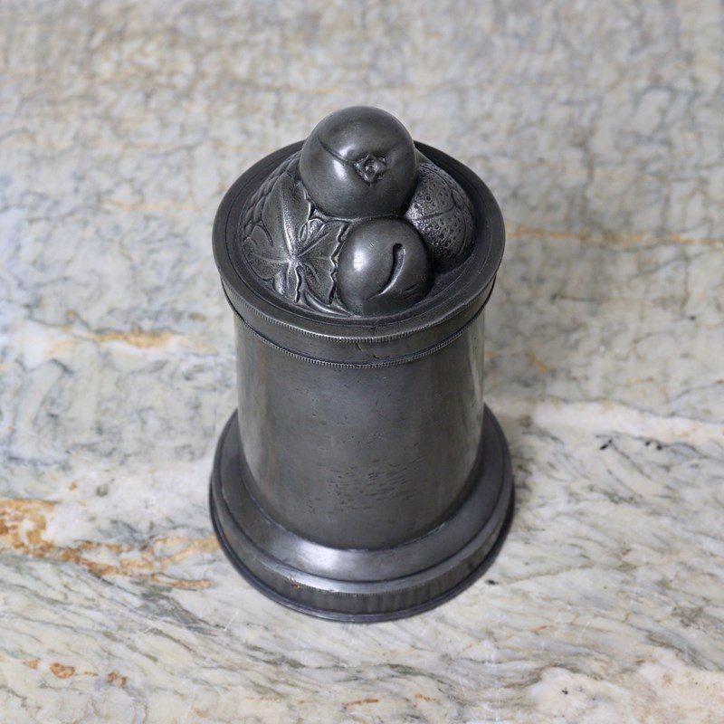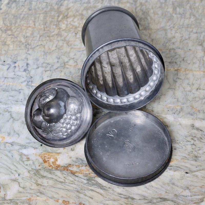 A three part, Victorian, pewter, ice cream banquet or pillar mould. This is stamped with the pattern number “No 8” above the registered design kite mark, which dates the year of registration of the mould to 1868, and “QUART” which is the capacity. It dates from c.1880. The top section is moulded with a group of fruits and this sits above fluted sides. The design is very well detailed and would turn out well. The mould is in excellent condition. The interior is in very good, bright, usable condition and the exterior has a dark patina.