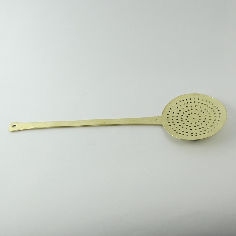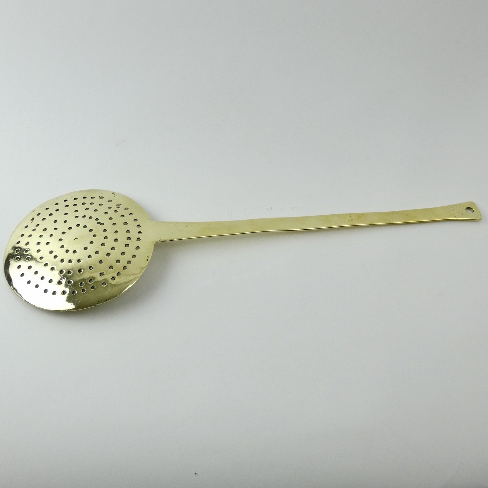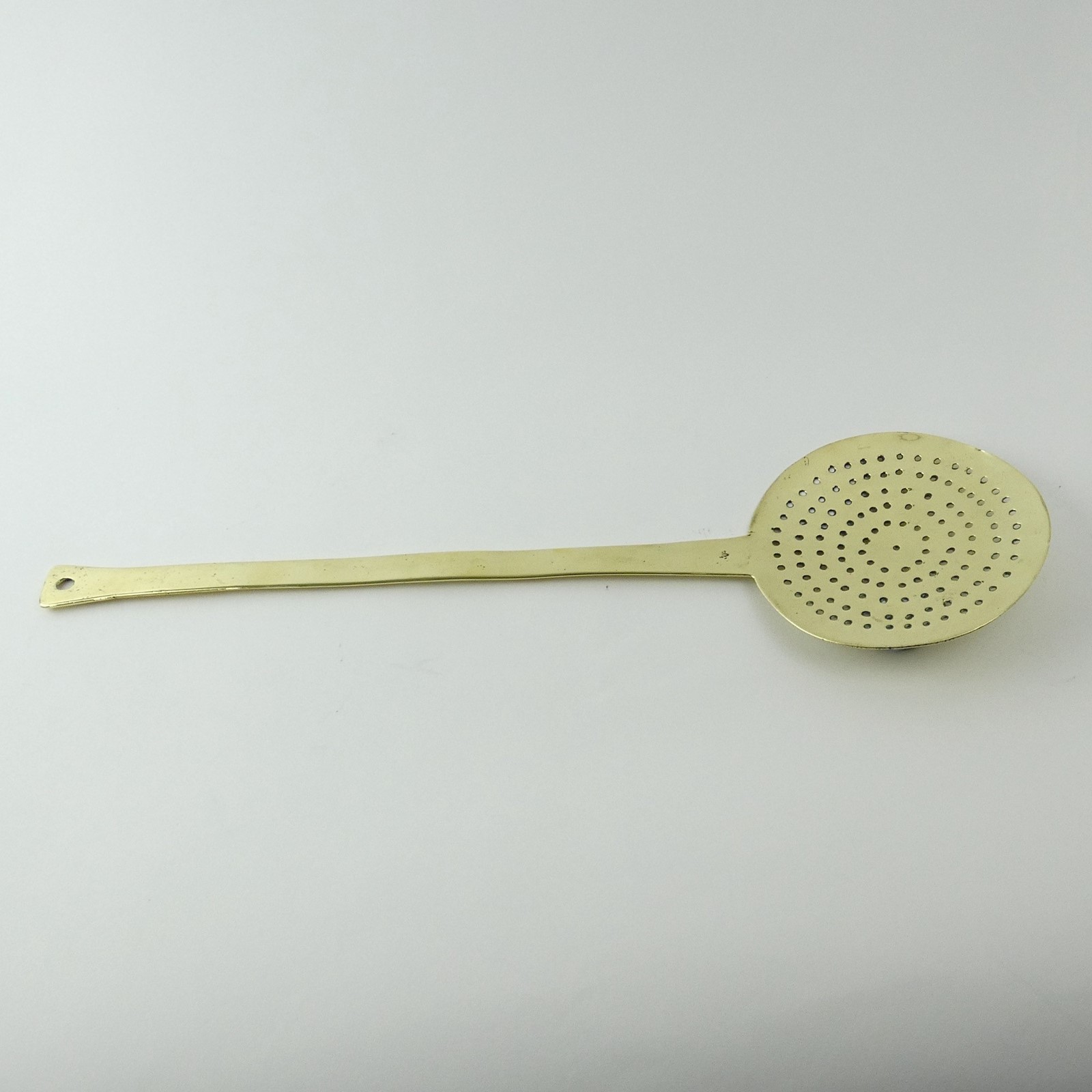 A late 17th century, cast brass, pierced skimmer with fishtail end to handle. This type of skimmer was used in the kitchens, for skimming stocks and preserves, and also in the dairy for skimming cream. This example is cast in one piece and has a worn makers mark, resembling a Fleur de Lys, at the end of the handle near to the skimmer.