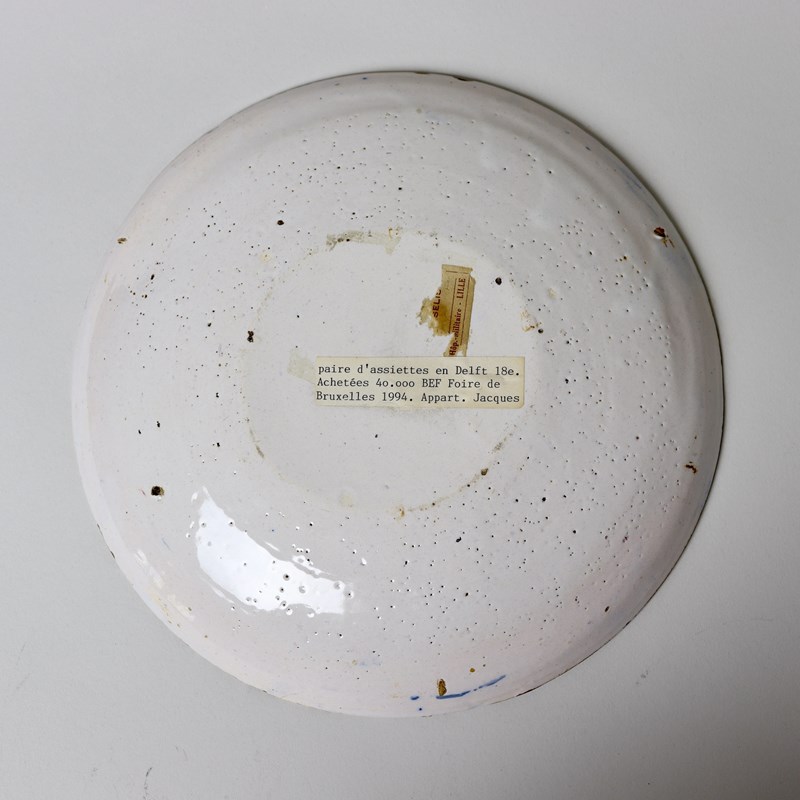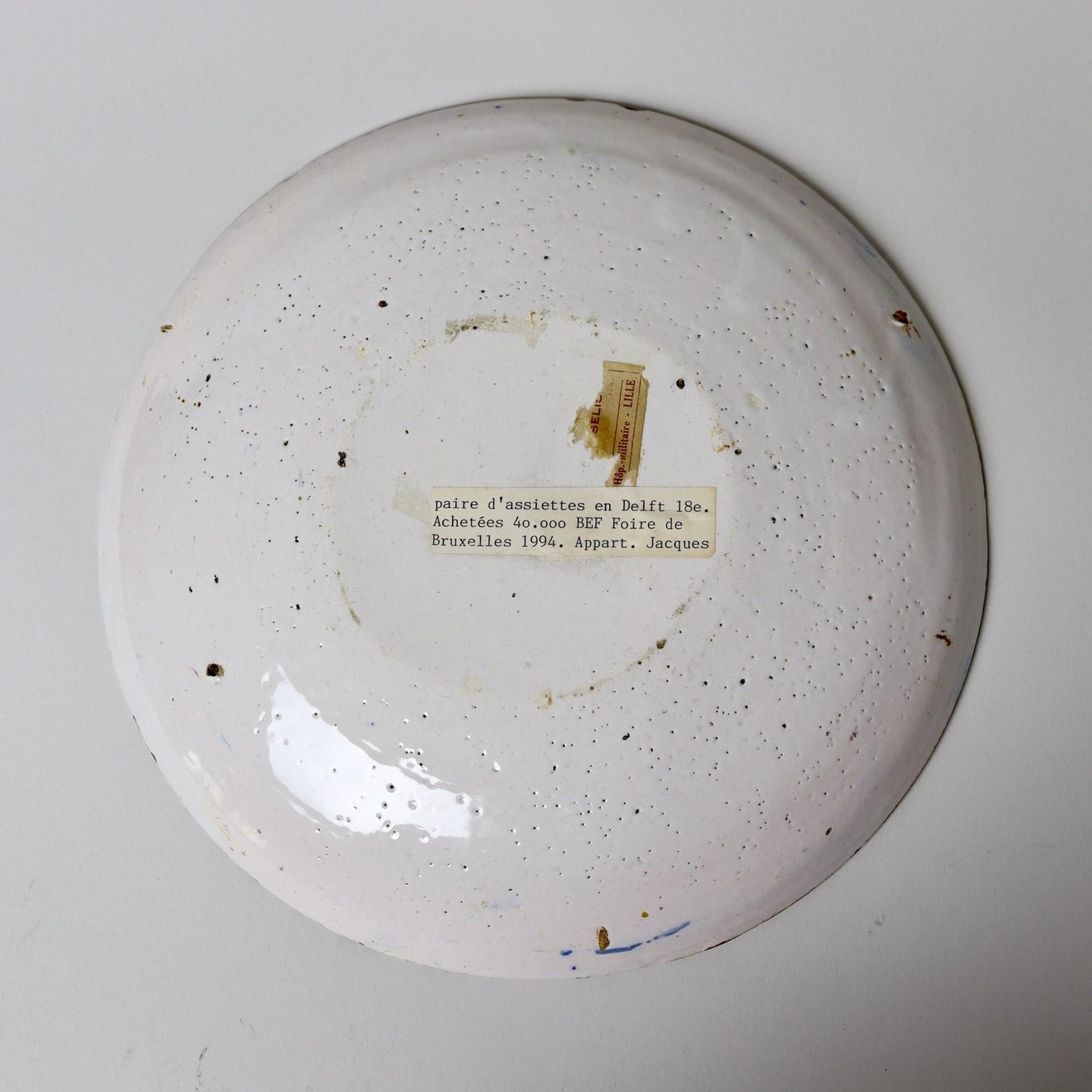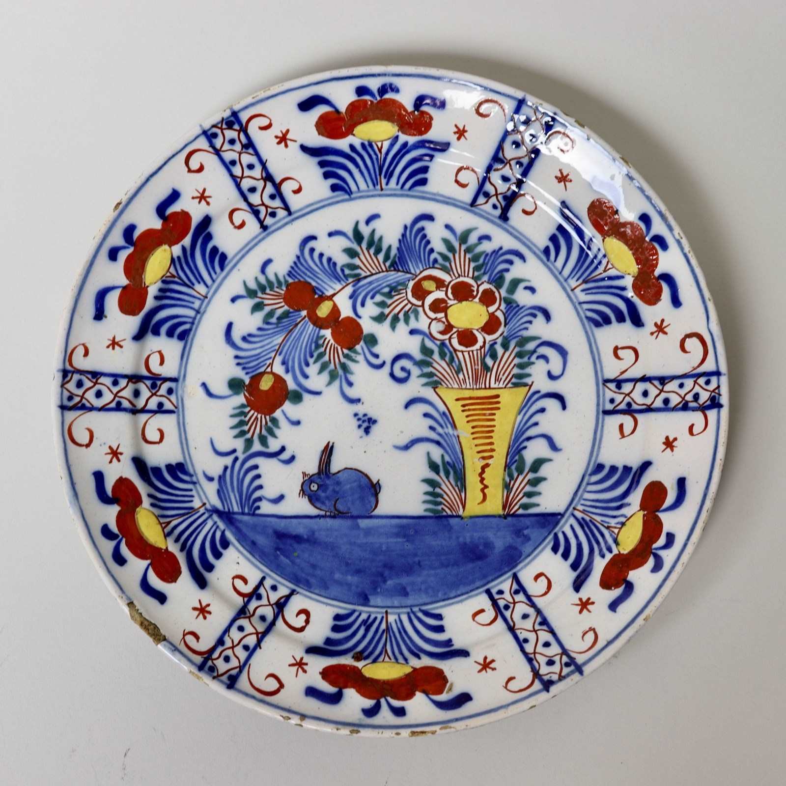 A boldly decorated, 18th century, polychrome Dutch Delft plate. This dates from c.1760. The centre is painted, in blue, green, ochre and iron red, with a rabbit in a garden. To the rim is a wide border of flowers in panels. The decoration is primitive is style and quite charming. There is one chip to the rim, along with minor flaking to the glaze.