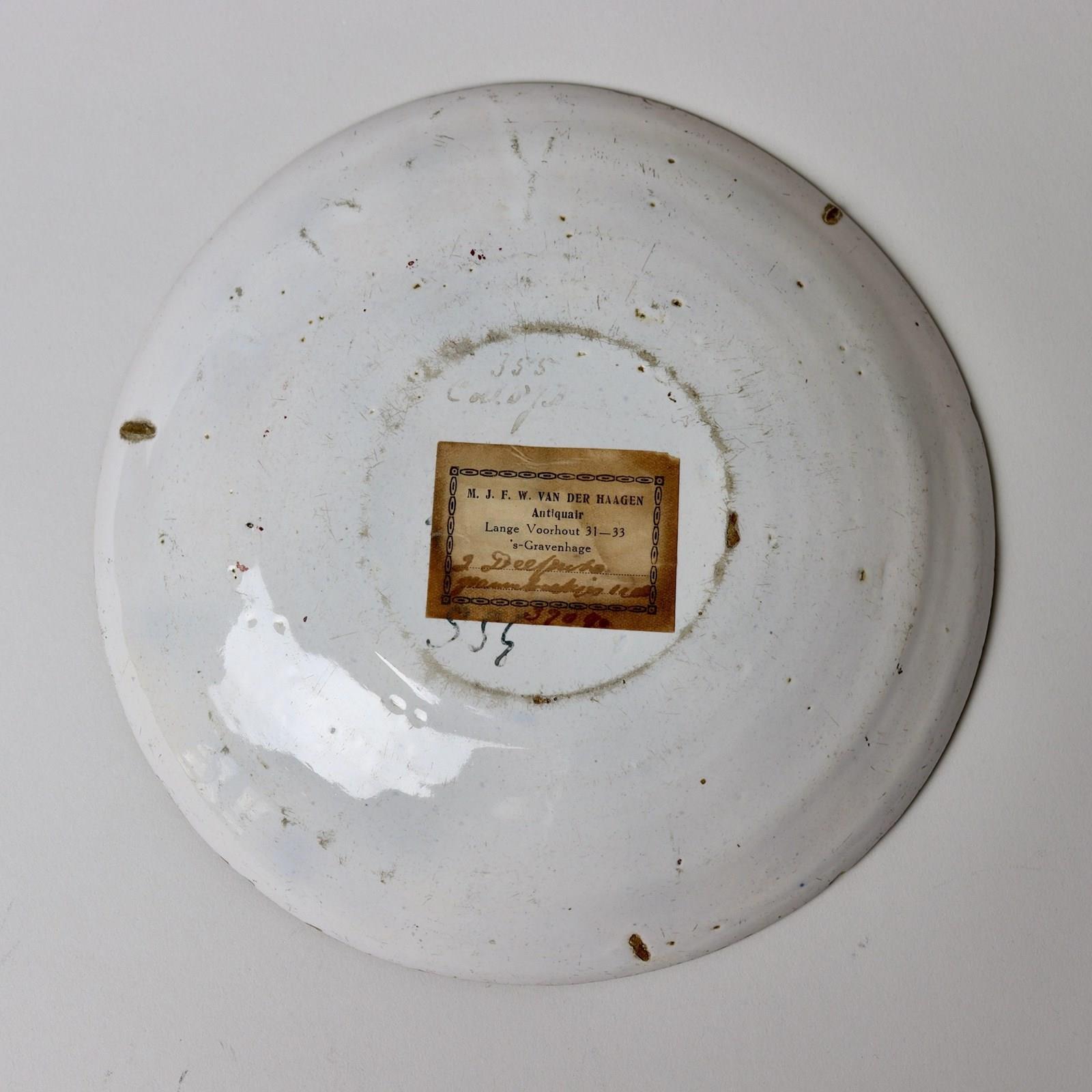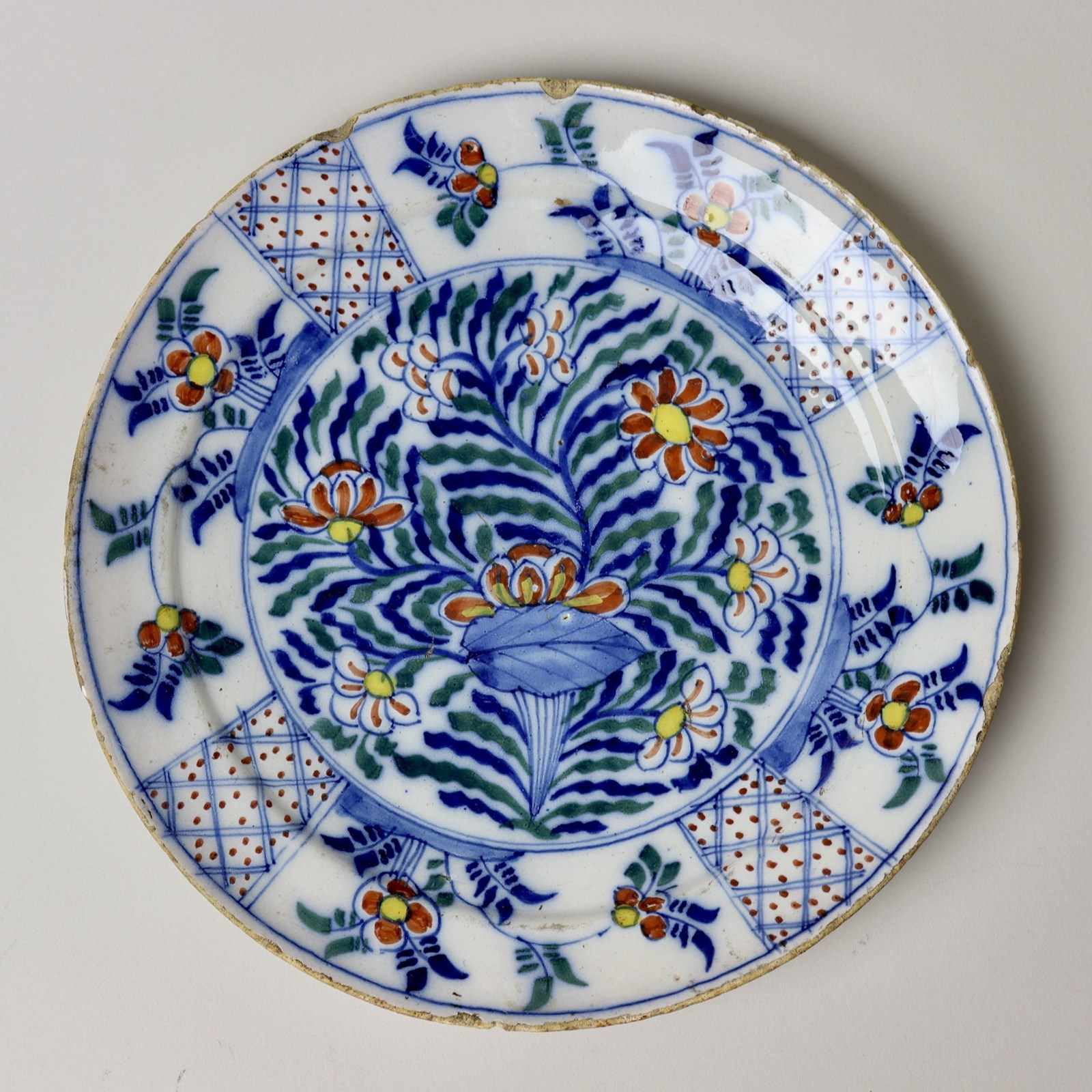An 18th century, polychrome Dutch Delft plate. This is painted predominantly in blue and green, with a small amount of ochre and iron red, with a very random floral design. To the rim is a wide border of alternating flower and geometric panels. The plate dates from c.1760. There are a few small chips to the rim, which can be seen in the image, and there is minor flaking to the glaze, as one would expect with Delft of this period.