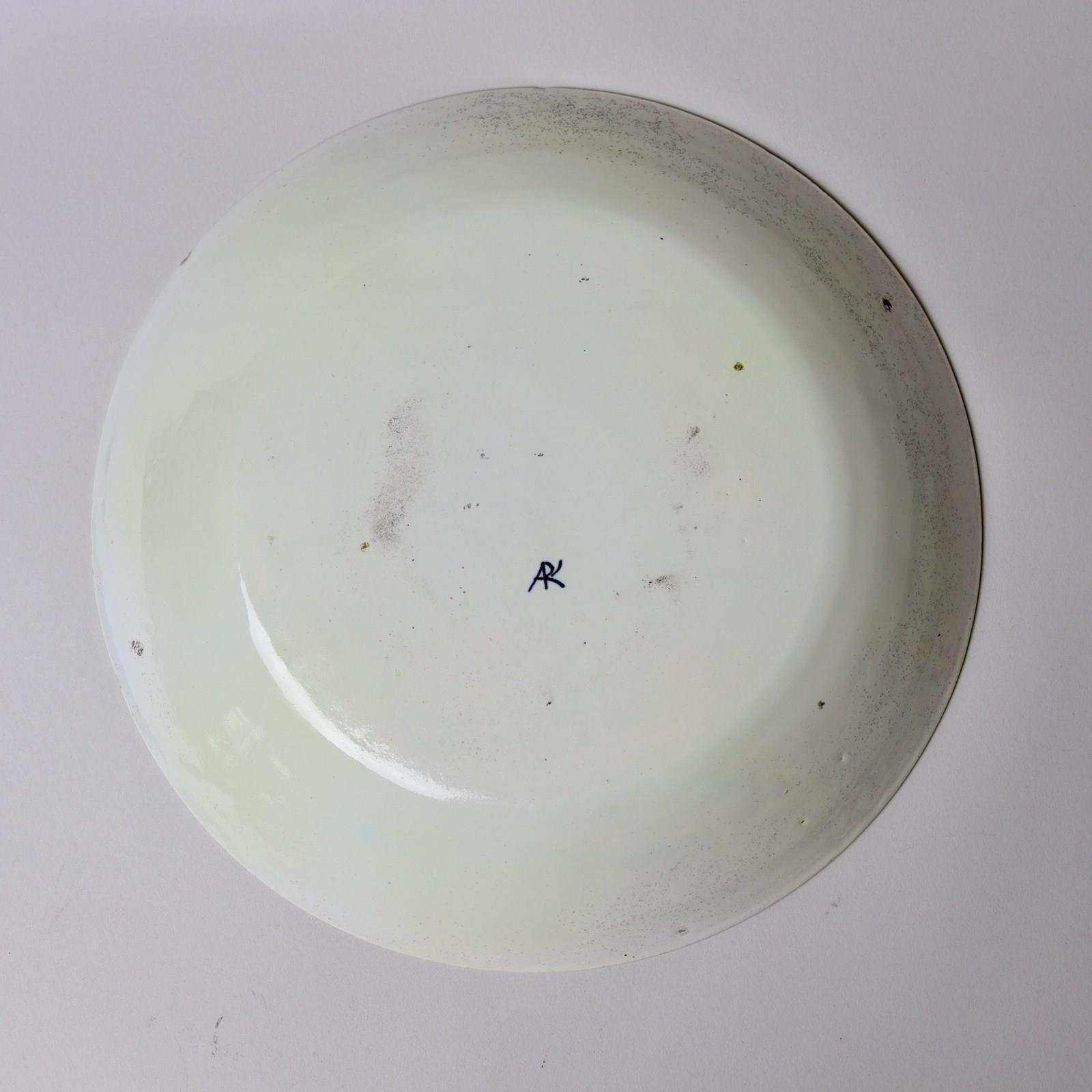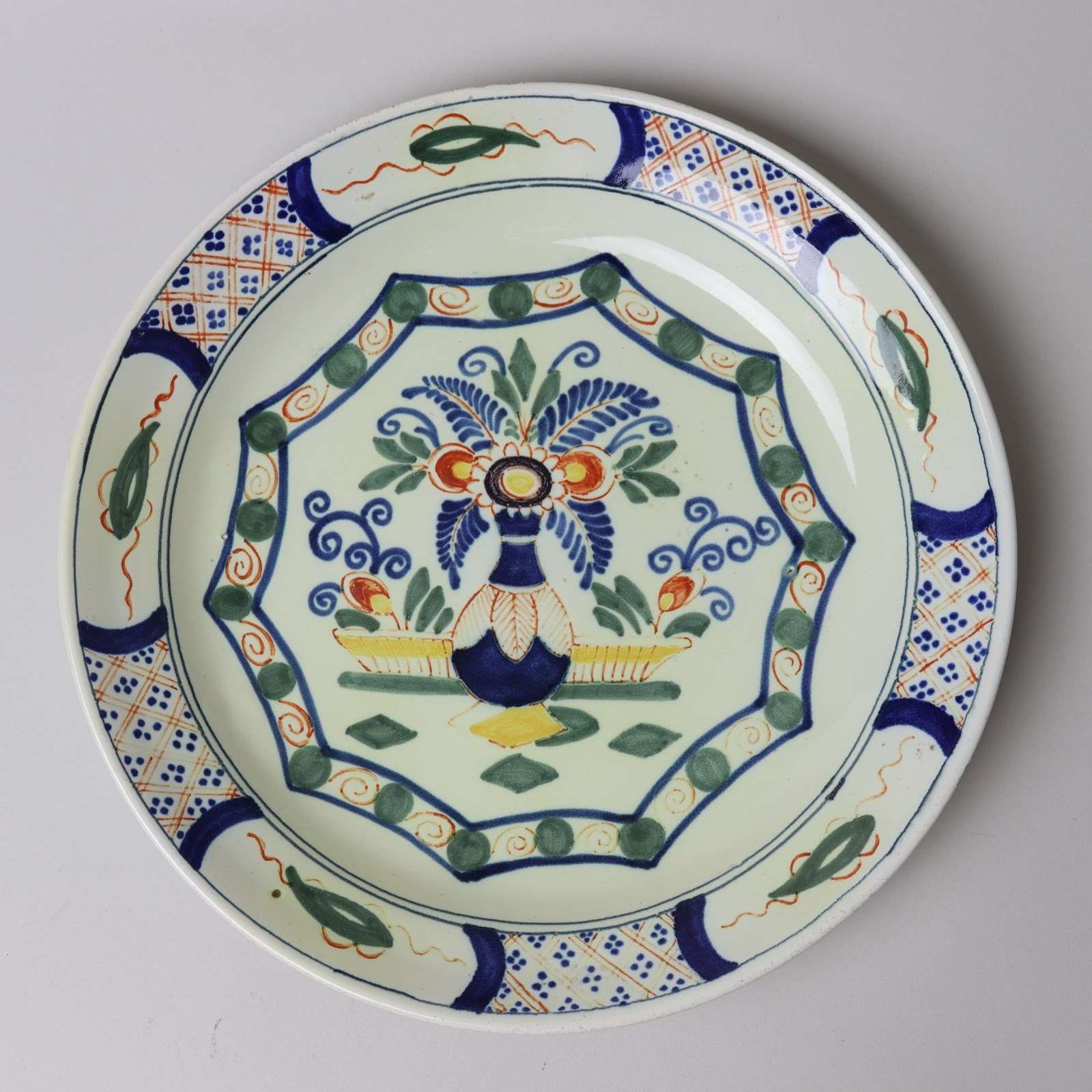 A boldly decorated, 18th century, polychrome Dutch Delft plate. This has a painted factory mark to the rear, which is a monogram of the letters APK, and it dates from c.1780. The centre is painted, in blue, green, ochre and iron red, with a vase of flowers and this is within a scalloped surround. To the rim is a border of oriental style symbols in cartouches and these are divided by geometric panels. There is very minimal wear to the glaze on the rim of the plate. It is in excellent condition.