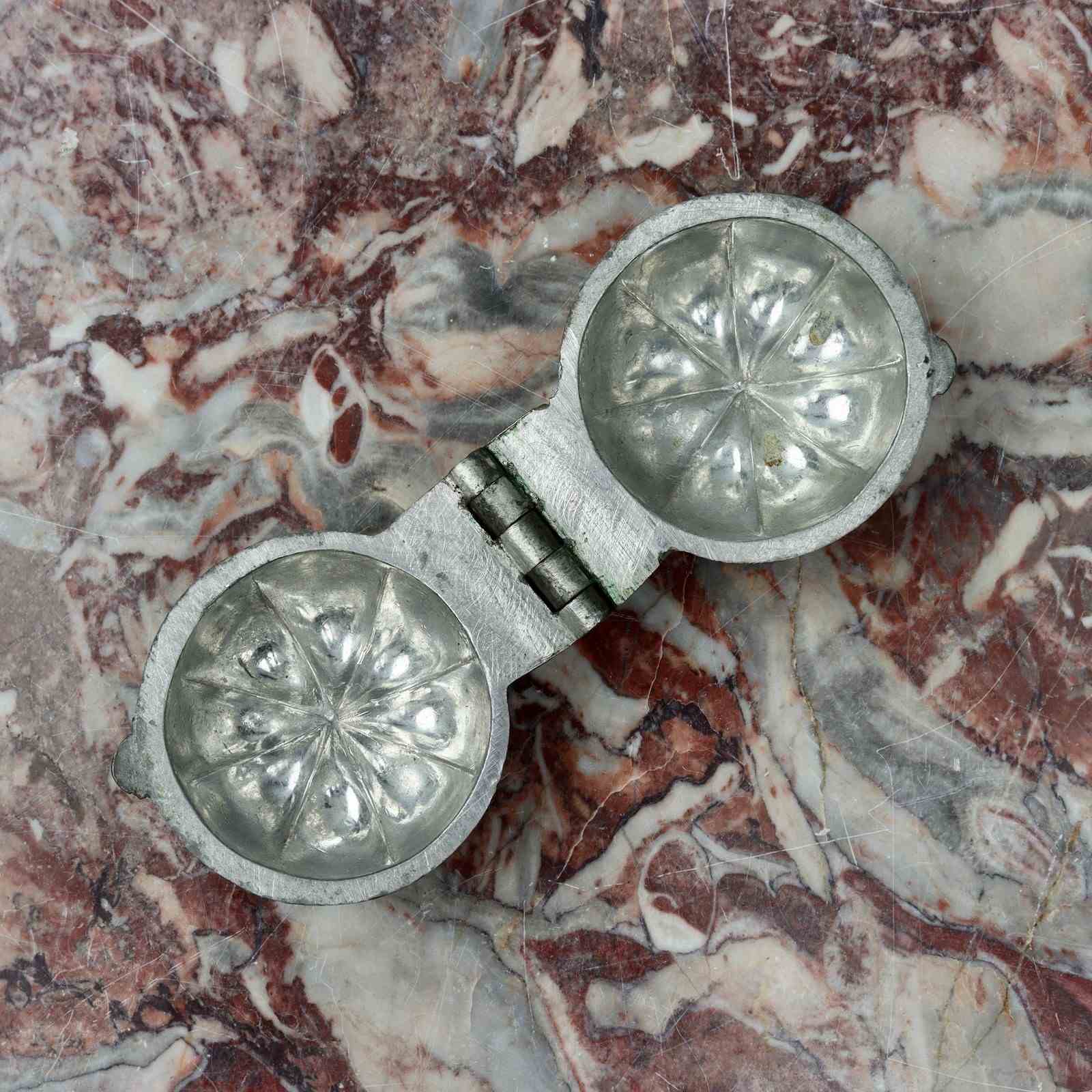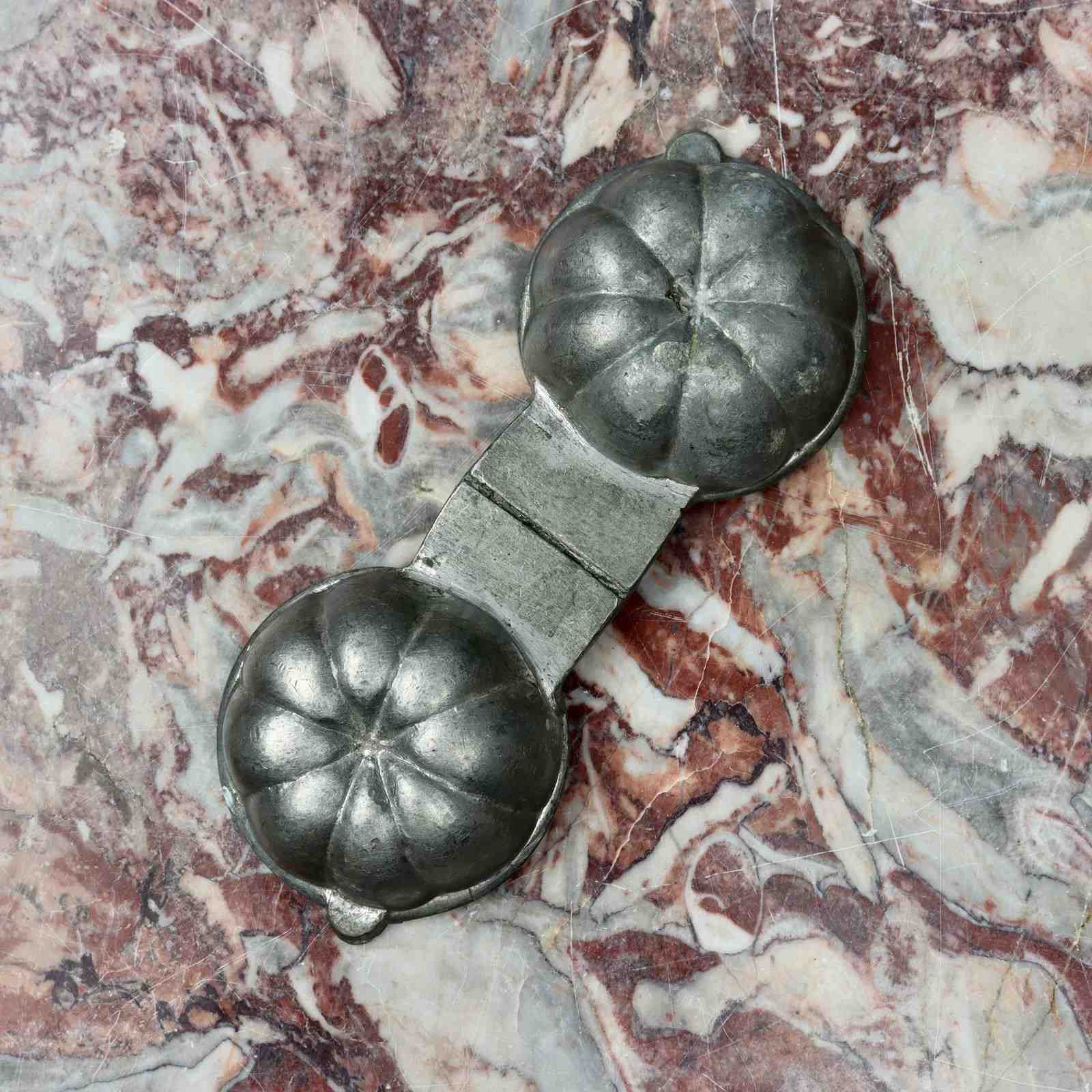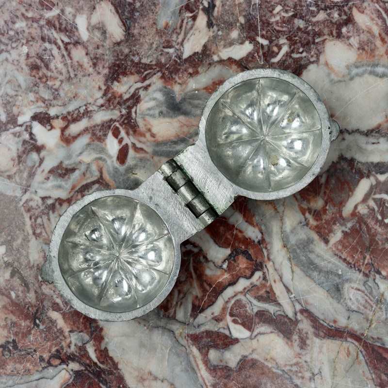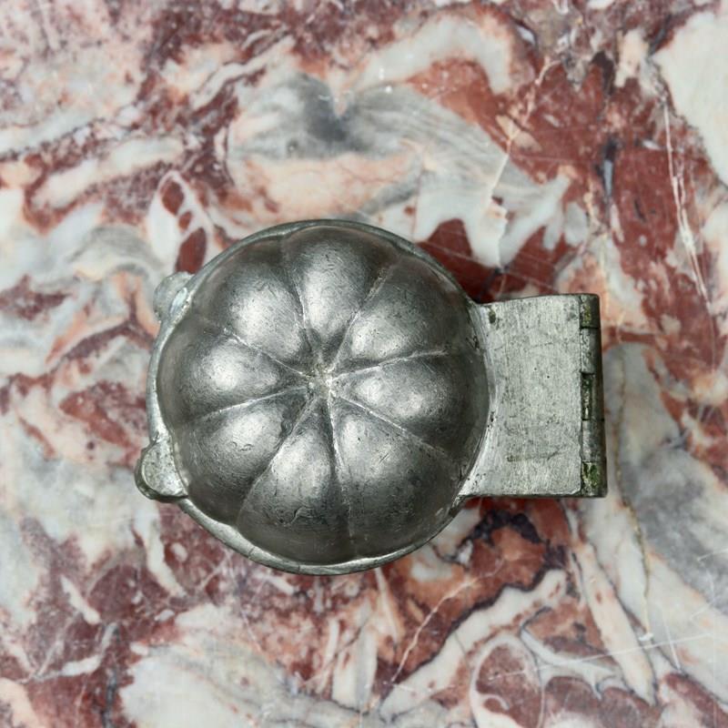 A small, pewter ice cream mould in the shape of a pumpkin. This is well detailed and naturalistic. It is probably French and it dates from c.1890. It is in excellent condition. The exterior has a dark patina and the interior is in very good, bright, usable condition.