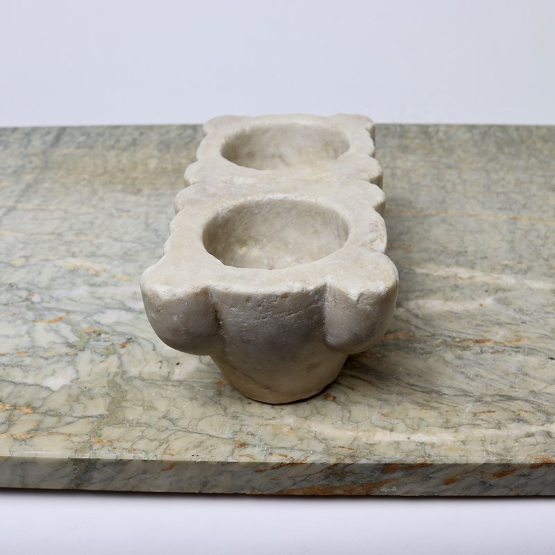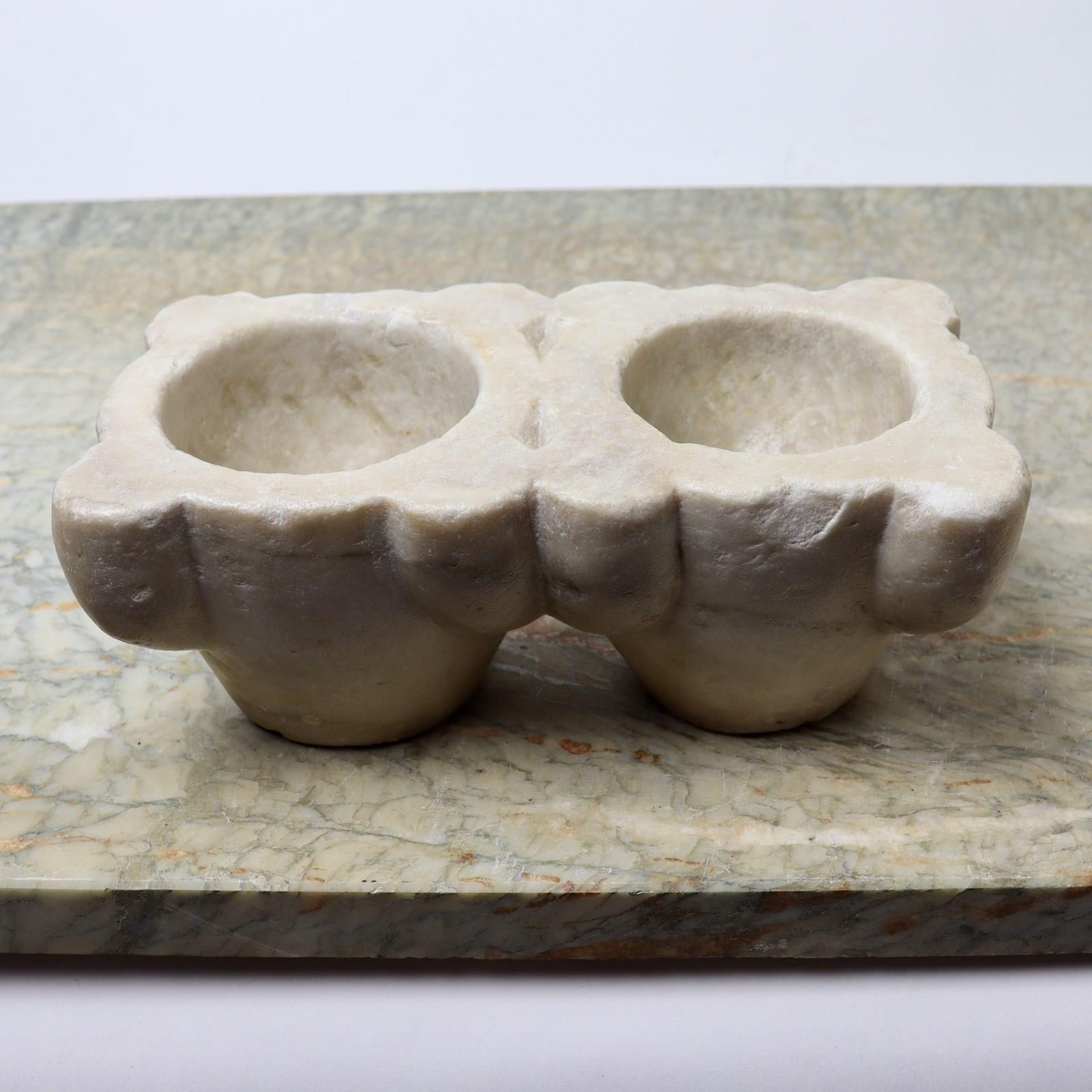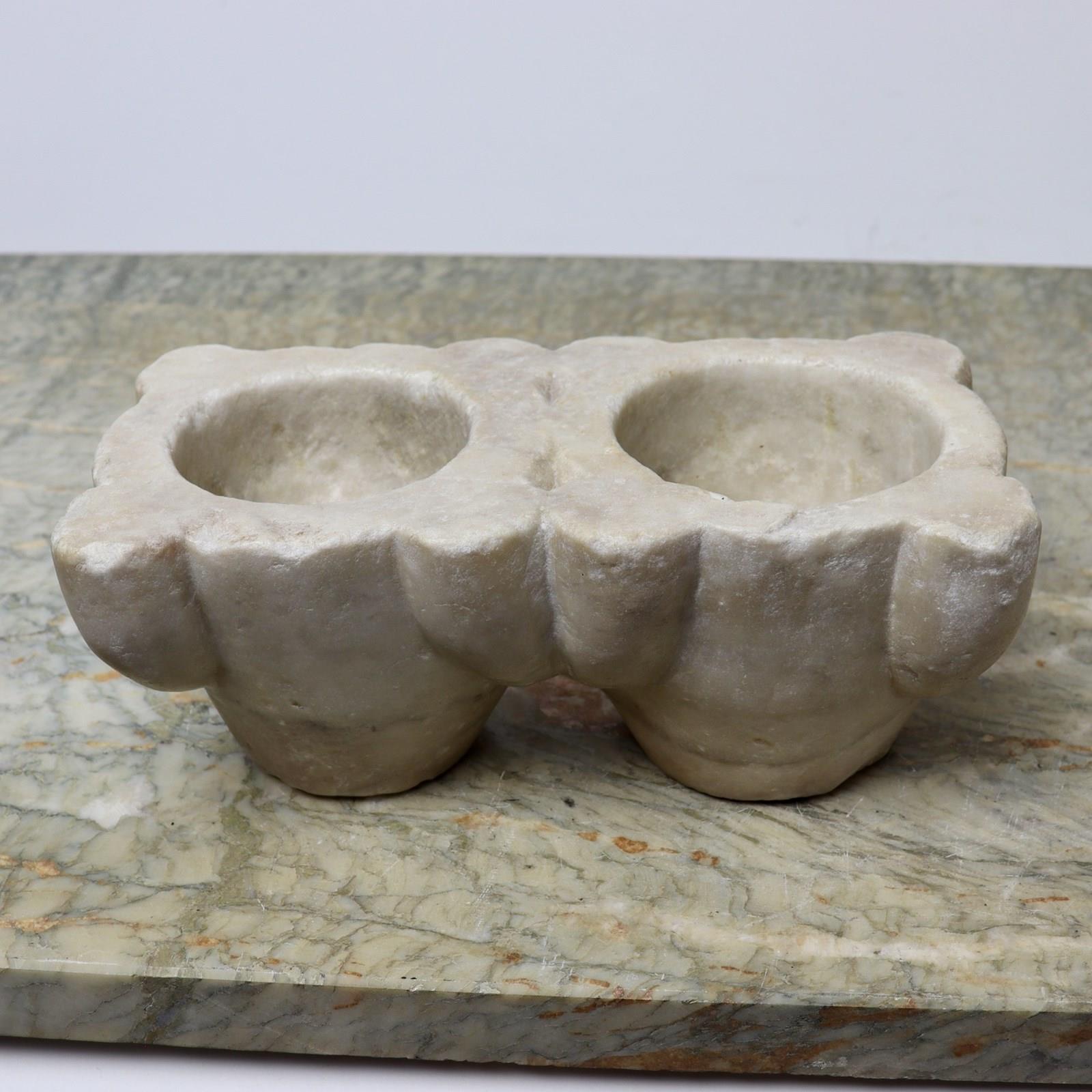 A rare, 18th century double mortar. This is carved from a white marble which has grey veining. The marble is typical of Carrara marble from Northern Italy and the mortar dates from c.1780. We have never seen a double mortar like this before and it was probably made for use in an apothecary. There is some chipping to the marble, around the rim, but there are no cracks, so it could still be used.