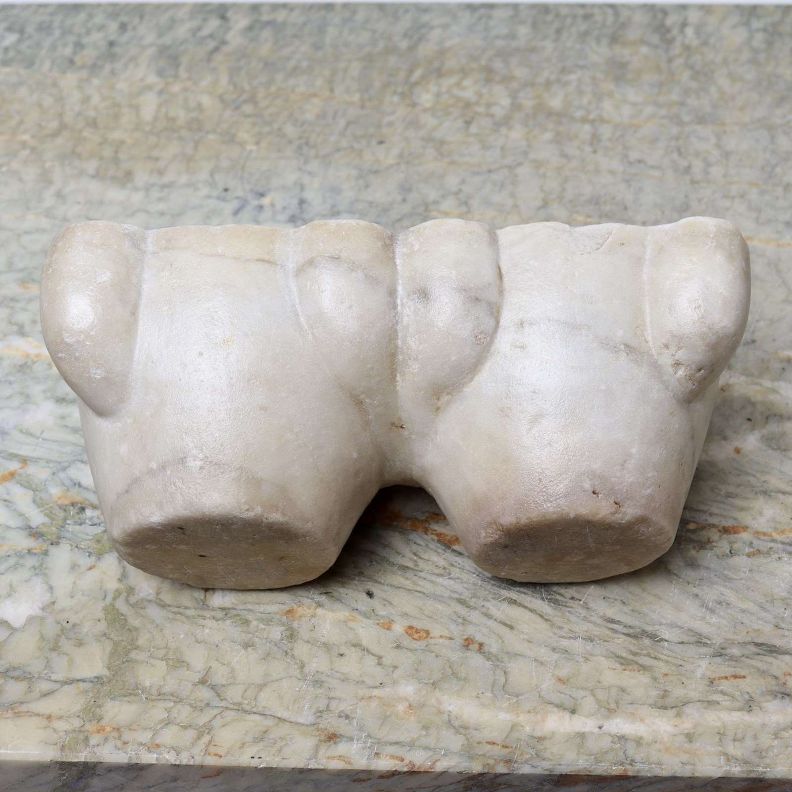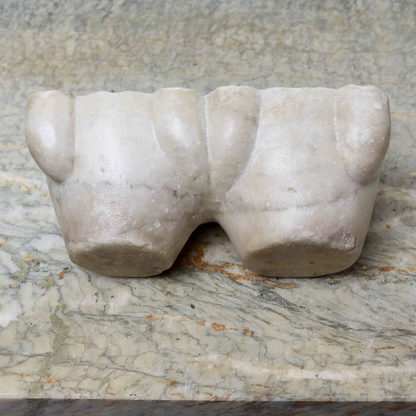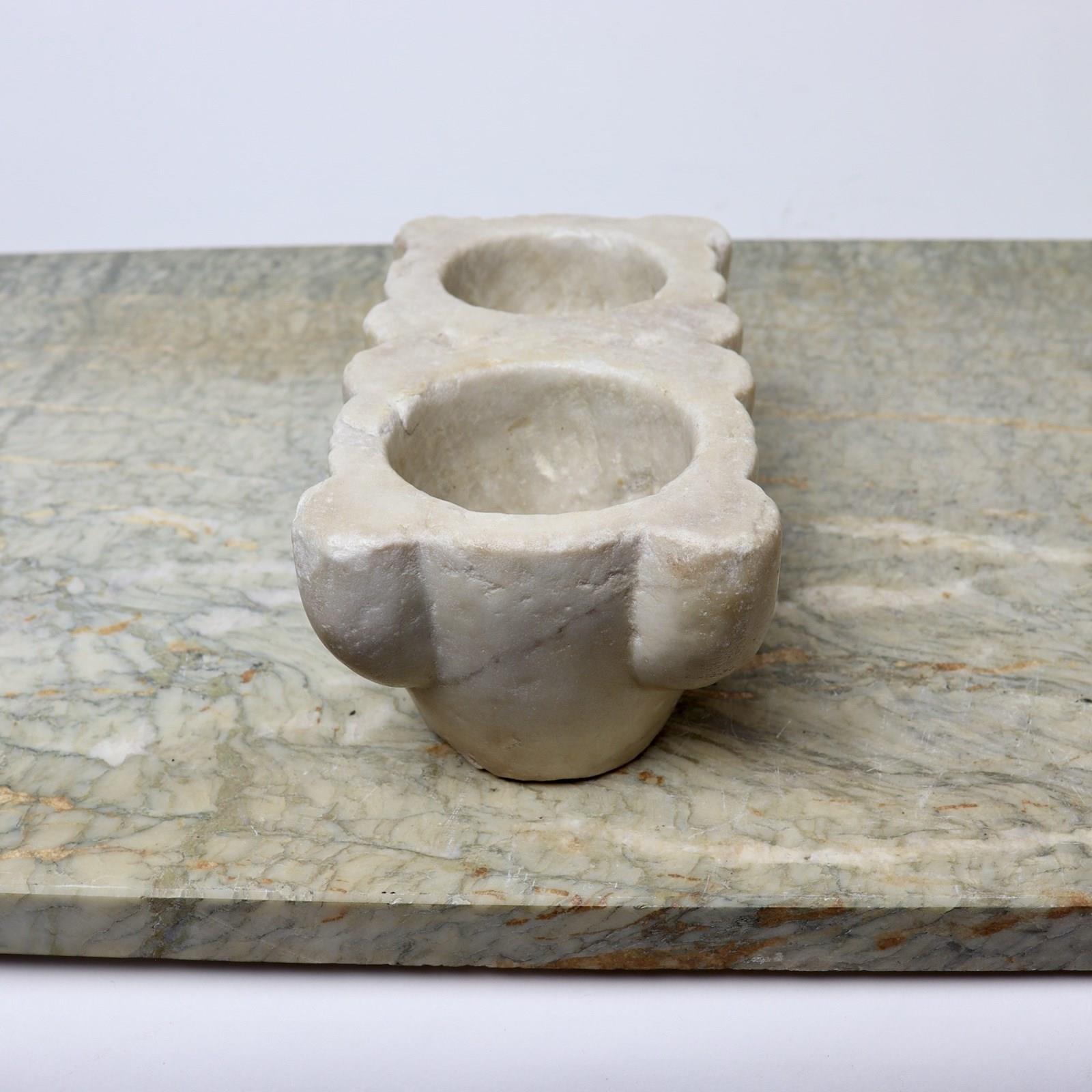 A rare, 18th century double mortar. This is carved from a white marble which has grey veining. The marble is typical of Carrara marble from Northern Italy and the mortar dates from c.1780. We have never seen a double mortar like this before and it was probably made for use in an apothecary. There is some chipping to the marble, around the rim, but there are no cracks, so it could still be used.