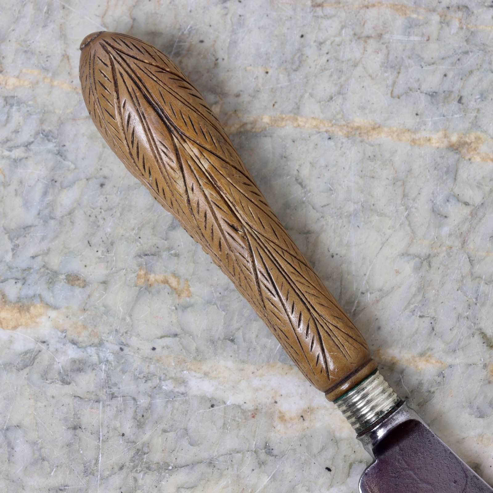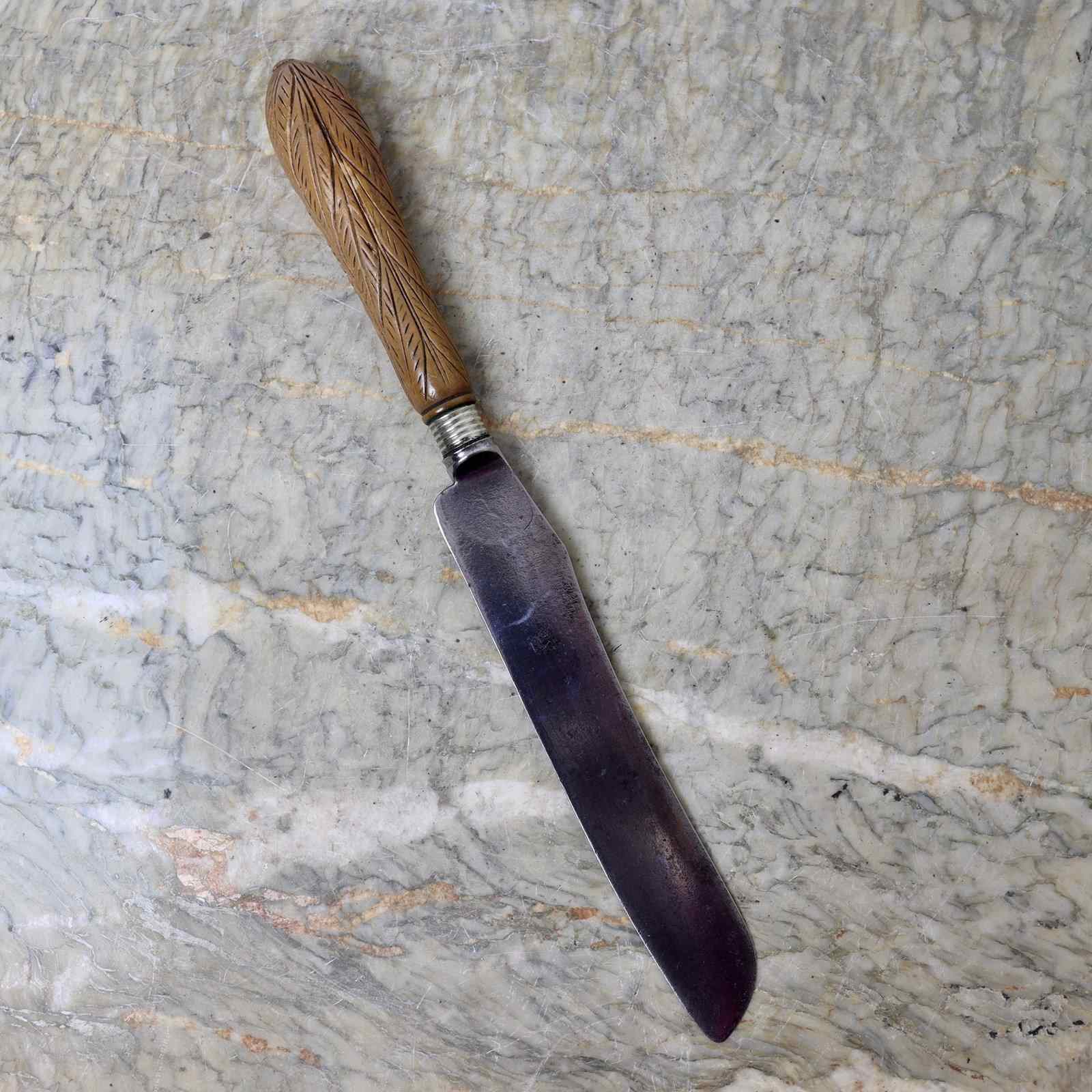 A rare 19th century, steel bread knife with a carved wooden handle. The steel blade is marked “JAMES TIDMARSH” and has “LONDON MADE” in a circle. James Tidmarsh was listed in the London Street Directory of 1843 as being a wholesale cutler at 13 Eyre Street Hill, Hatton Garden. This knife dates from c.1860.