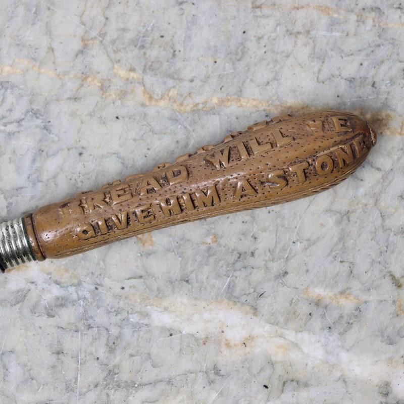 The carving of the handle is very unusual and it reads “IF HE ASK FOR BREAD WILL YE GIVE HIM A STONE”. The piece is in very good condition with just a little pitting to the steel blade.