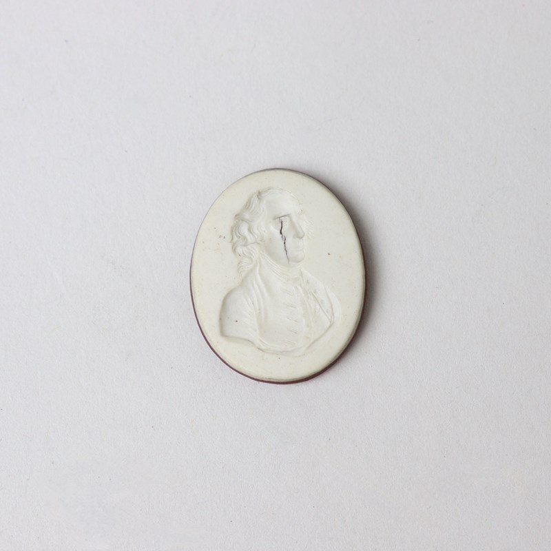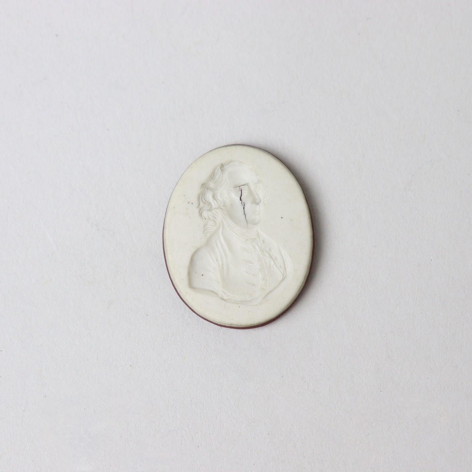 Rare, Wedgwood and Bentley, brown and white jasper intaglio impressed with the bust of an 18th century gentleman. Marked “Wedgwood & Bentley” with a catalogue number “275” . Date c.1775. Firing fault across the face.