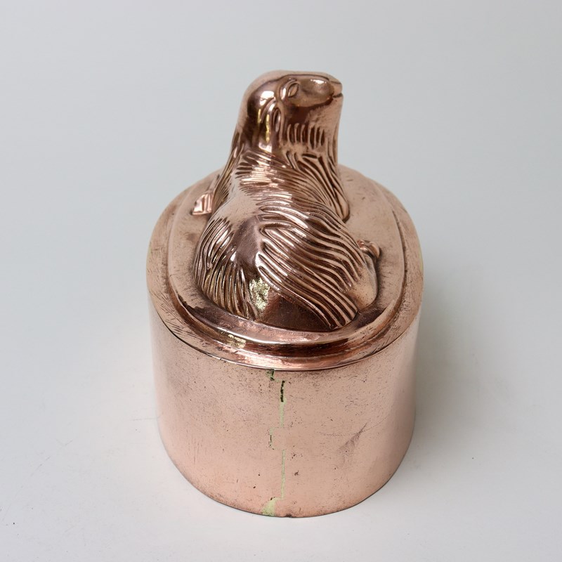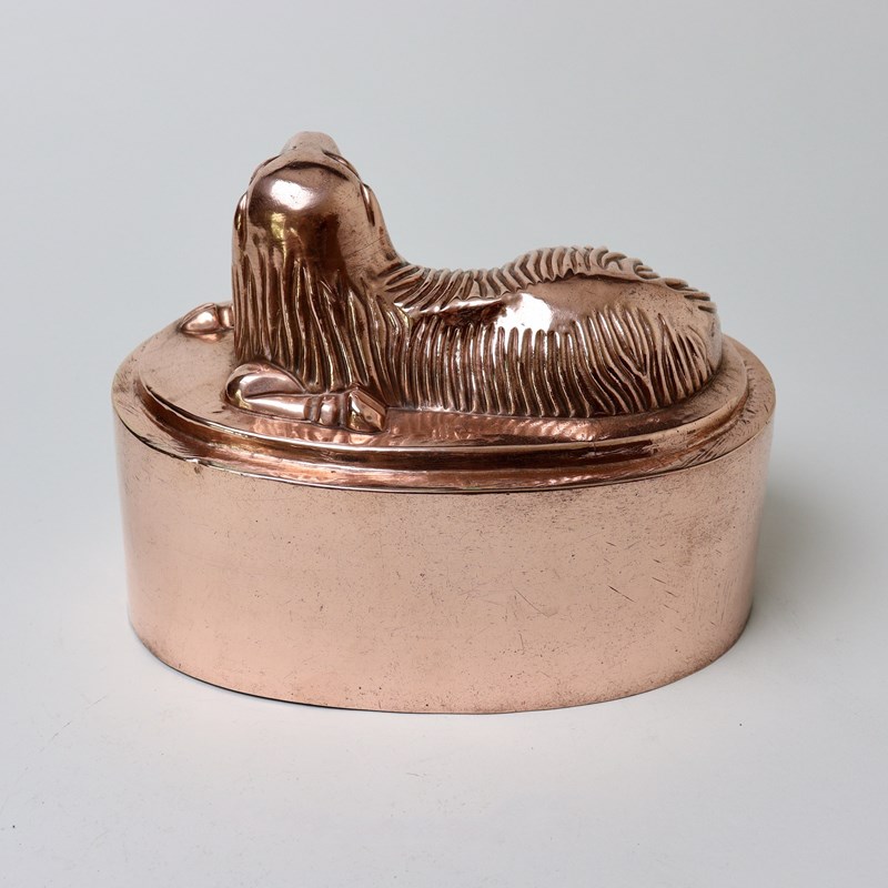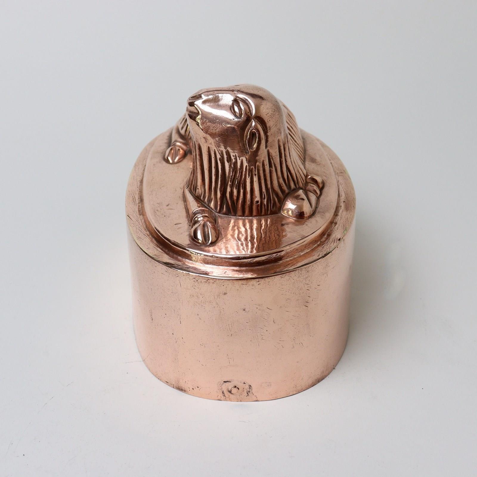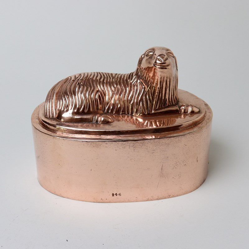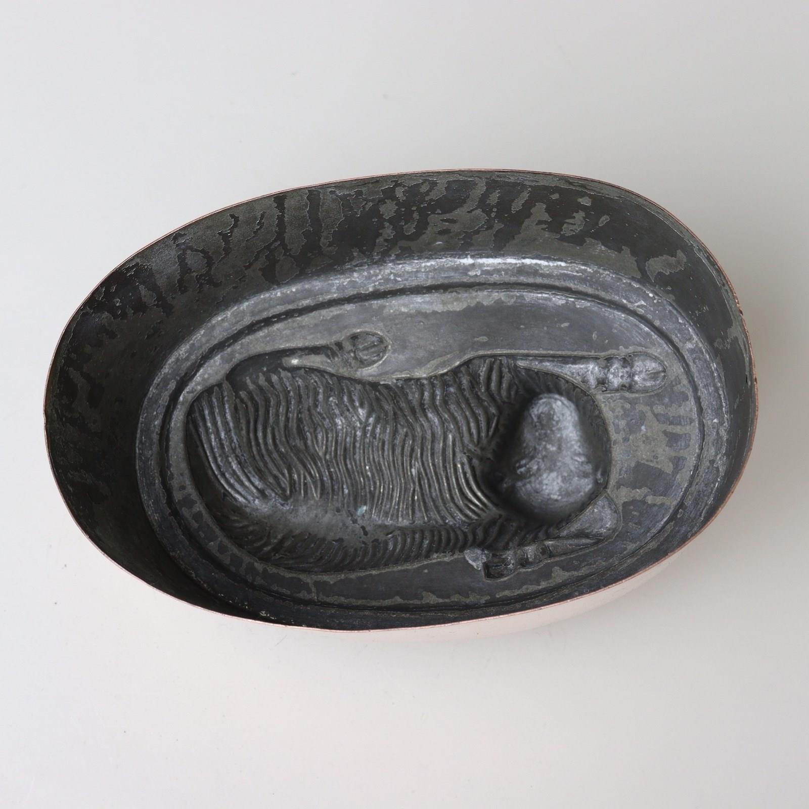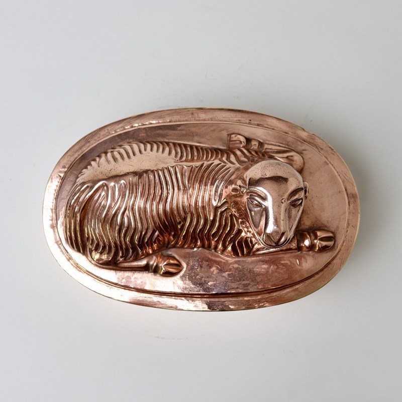 A rare and large, 19th century, French copper mould with the full form of a sheep to the top. This is well made, from a heavy gauge of copper, and it has a castellated seam up the side. It is stamped with a pattern number “146” and it dates from c.1860. The sheep is well modelled, but very primitive in style. There was a hanging loop attached to the rim. This has been removed but you can still see where it has been taken from. The mould is in excellent condition but the tinning, to the interior, is worn.