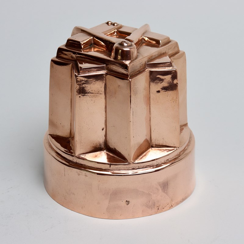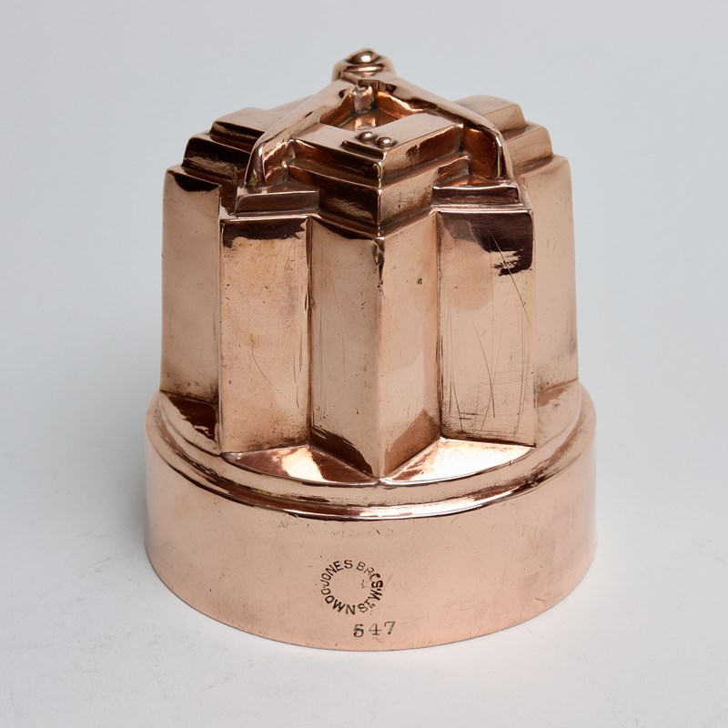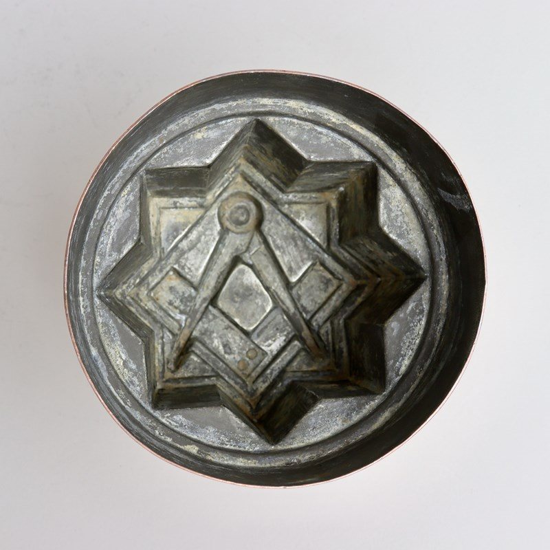 A rare, 19th century, Masonic, copper jelly mould. This would originally have been made for use in a Masonic lodge. It is marked with the orb and cross symbol used by Benhams above a pattern number ’547’ but the orb and cross is barely discernible as it has been over stamped with “JONES BROS DOWN ST. W.”. To the opposite side is a workman’s mark in the shape of a heart. The mould would have been made by Benhams for retail by Jones Brothers. It is made from quite a heavy gauge of copper and it dates from c.1880. To the top is the Masonic symbol of the square and compass and the sides are angular, following the shape of the top. There is slight denting to some of the high points of the design, on the corners, but otherwise the mould is in very good condition.