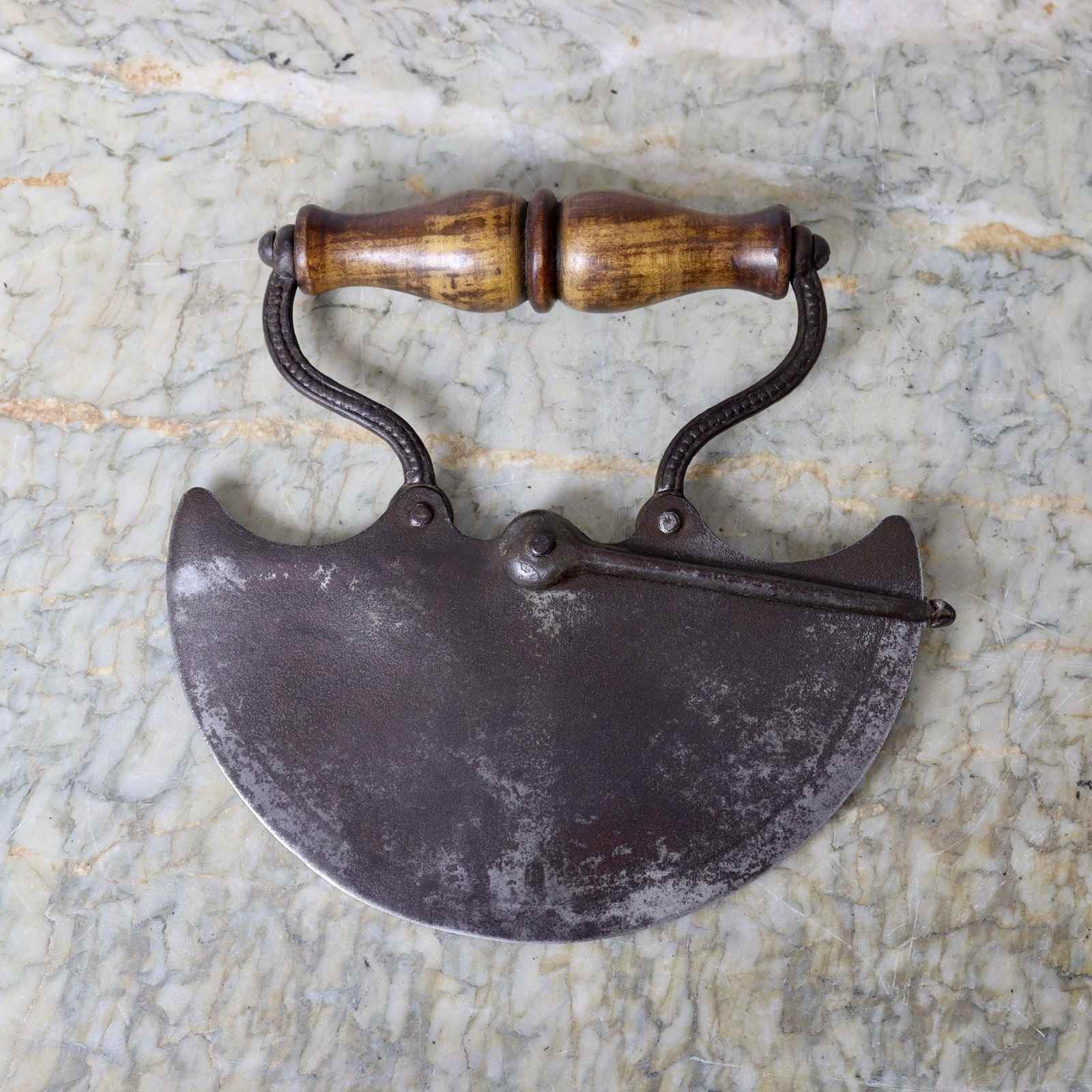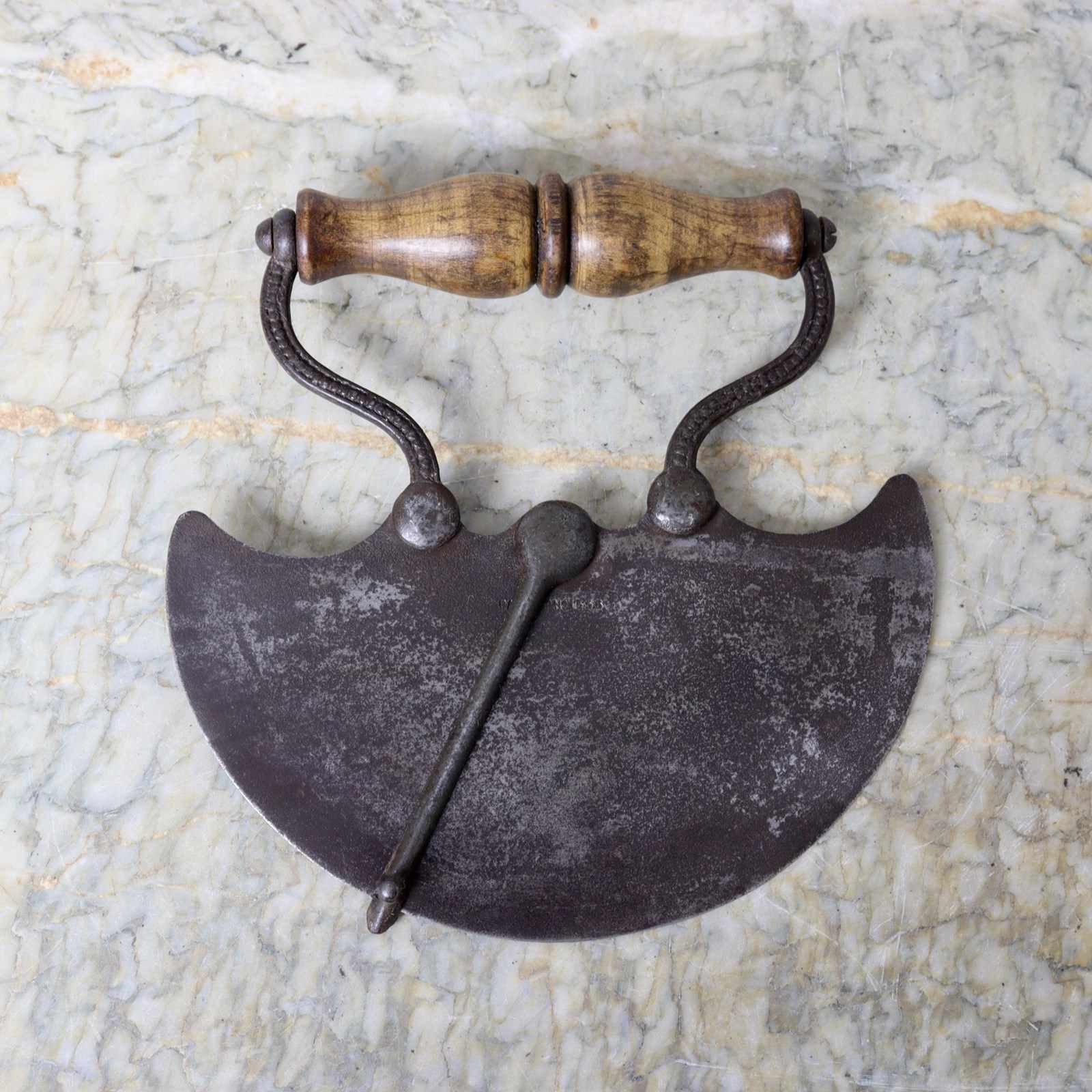 A very unusual, steel herb of vegetable chopper with cleaning slider. This is stamped “PATENT No 1556”. It is English and dates from c.1880. The slider enables one to remove any food from the blade which has stuck during the chopping process. This would work very efficiently and save you from having to scrap the blade with a knife, particularly useful when chopping herbs. It is well made, with cast steel fittings and a turned wooden handle, and it is in very good condition.
