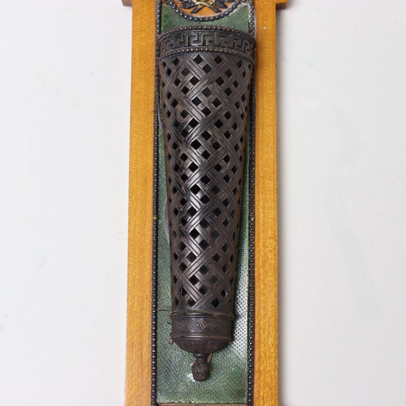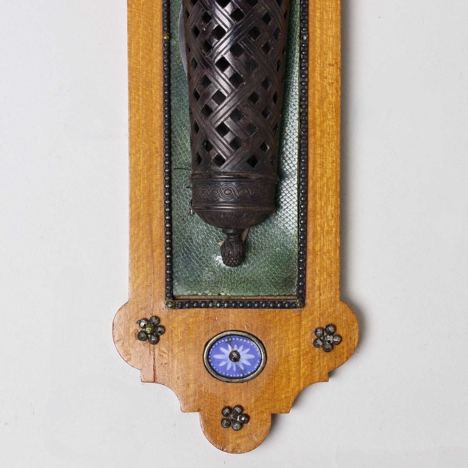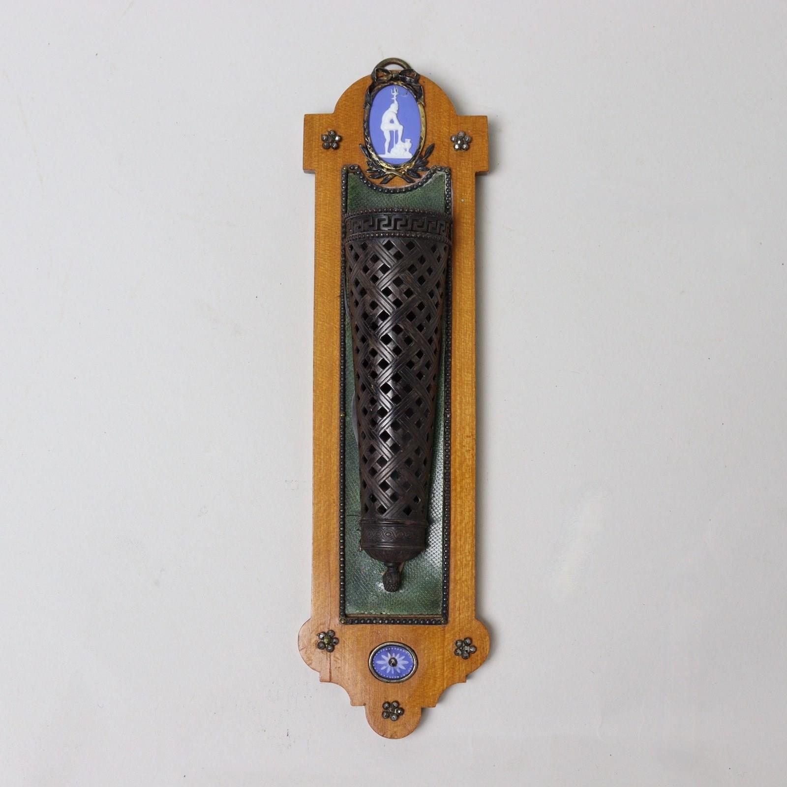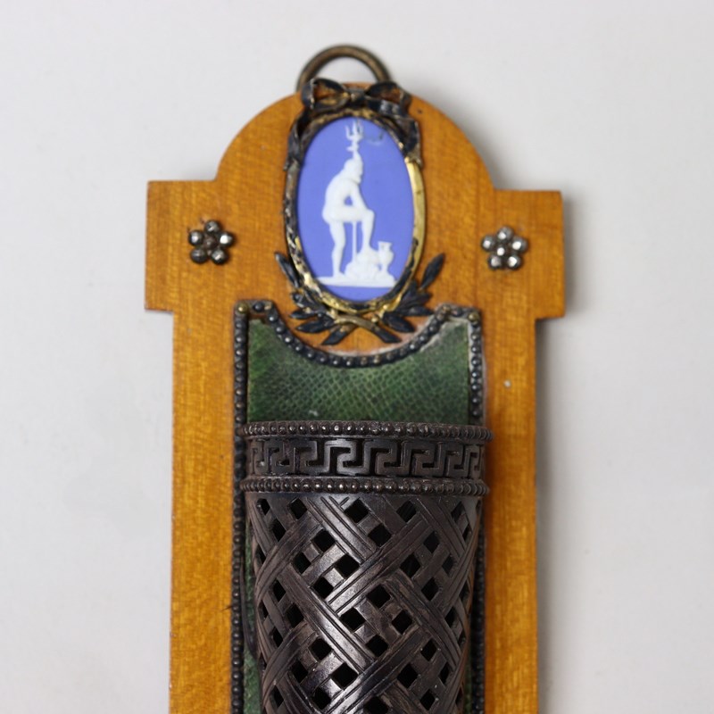 A rare, 18th century wall pocket inset with Wedgwood plaques and cut steel. This is a very unusual item and would probably have been made to hold a very small posy of flowers. It dates from c.1790. The metal posy holder is made from brass and this is set onto shagreen backing. To the top and base are small, Wedgwood, dark blue jasper plaques which are surrounded by ormolu mounts. Around these are small flowers which are formed with cut steel and the whole is on a shaped boxwood mount. This is quite a charming piece. The two plaques both have damage. The smaller one at the base is cracked and the larger one at the top, which depicts Neptune, has a chip to the top.