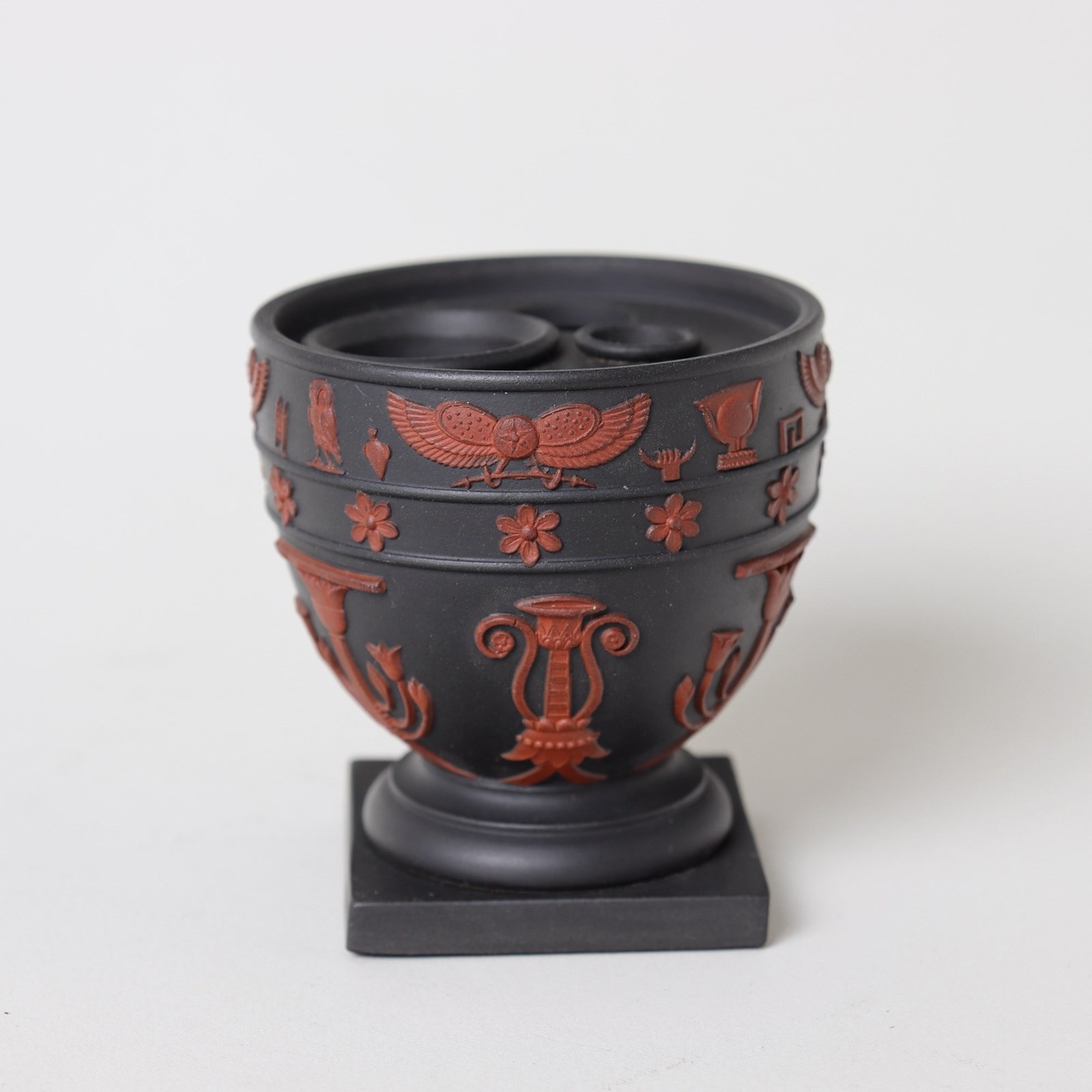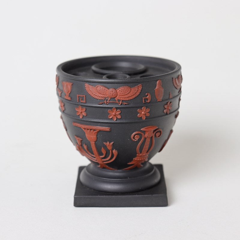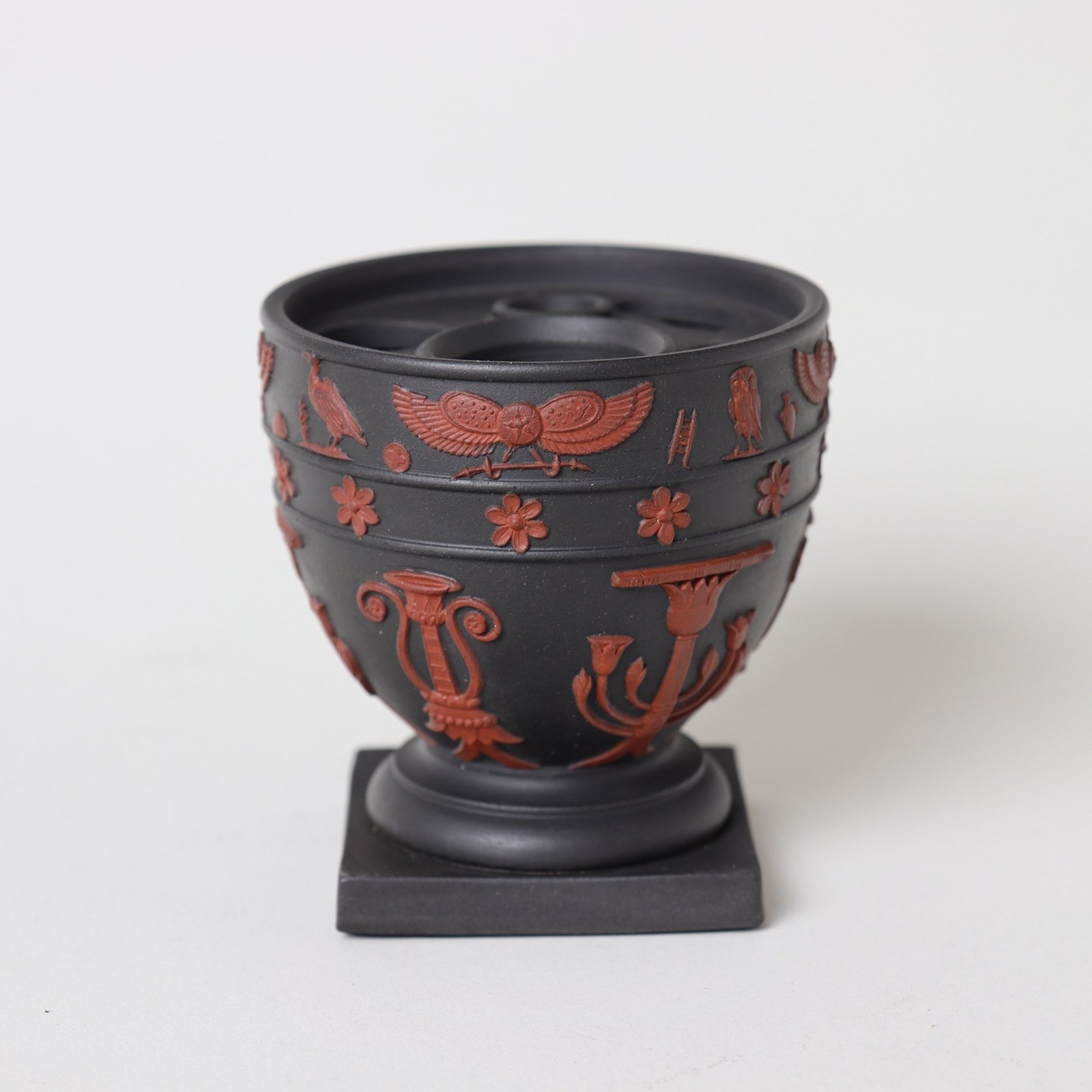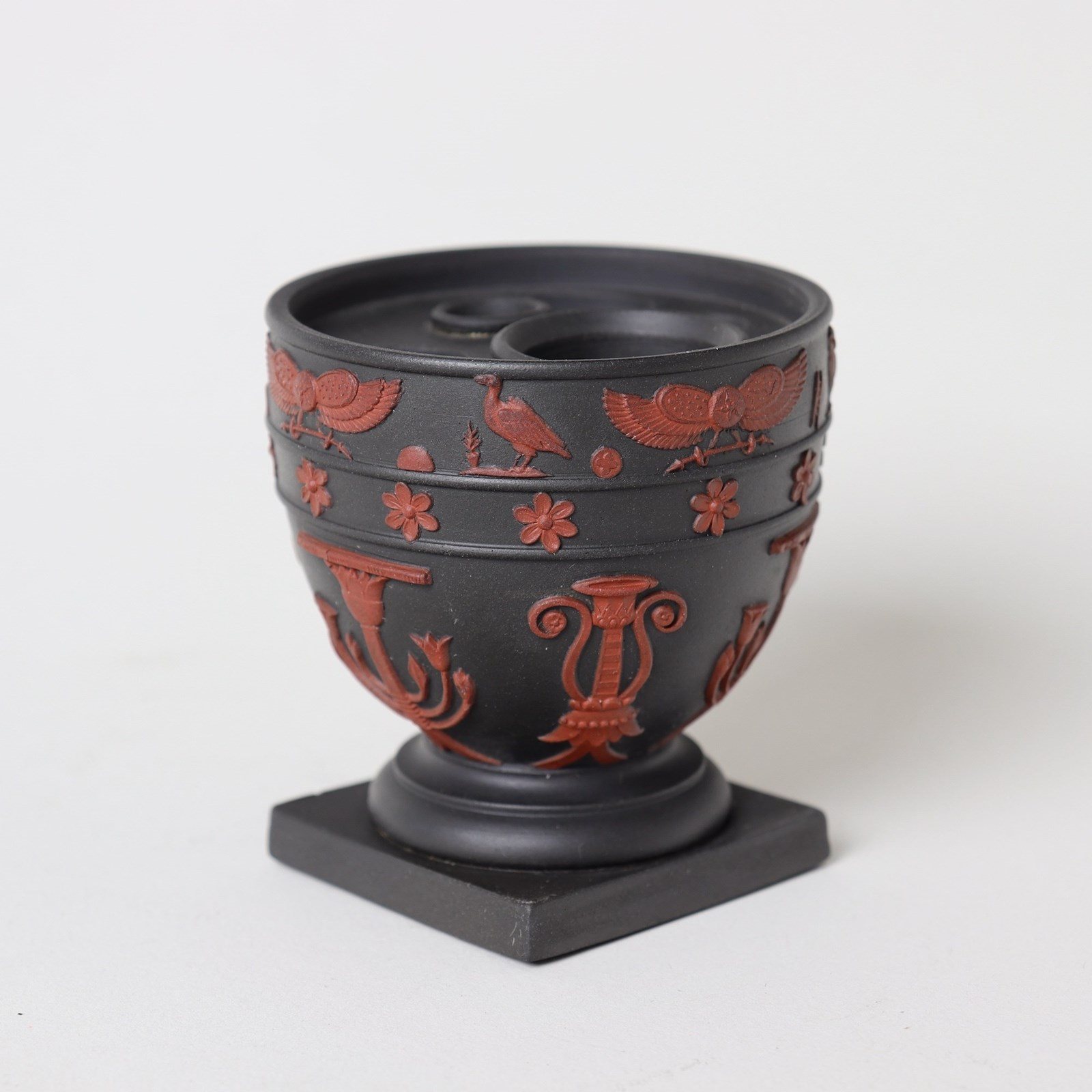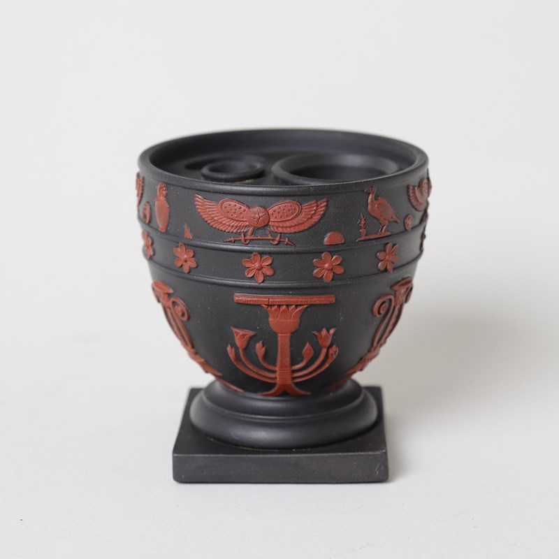 A rare, early 19th century, Wedgwood Rosso Antico pyrophorus vase. This is marked “WEDGWOOD” and it dates from c.1815. Pyrophorus vases were early 19th century, decorative ceramic pots which were designed to create an instant flame. They acted as early, sophisticated match holders. The main container held chemical tipped wooden splints and these were dipped into the acid which was kept in a separate container within the vase. Very few were made and, due to their use, they were often damaged as they were in the habit of exploding. This example is beautifully decorated with Egyptian reliefs in terracotta against a basalt ground. The reliefs are super quality and, remarkably, the piece is still in excellent condition.