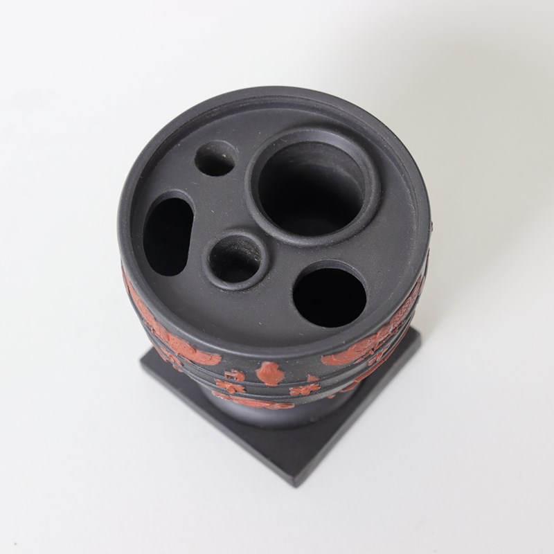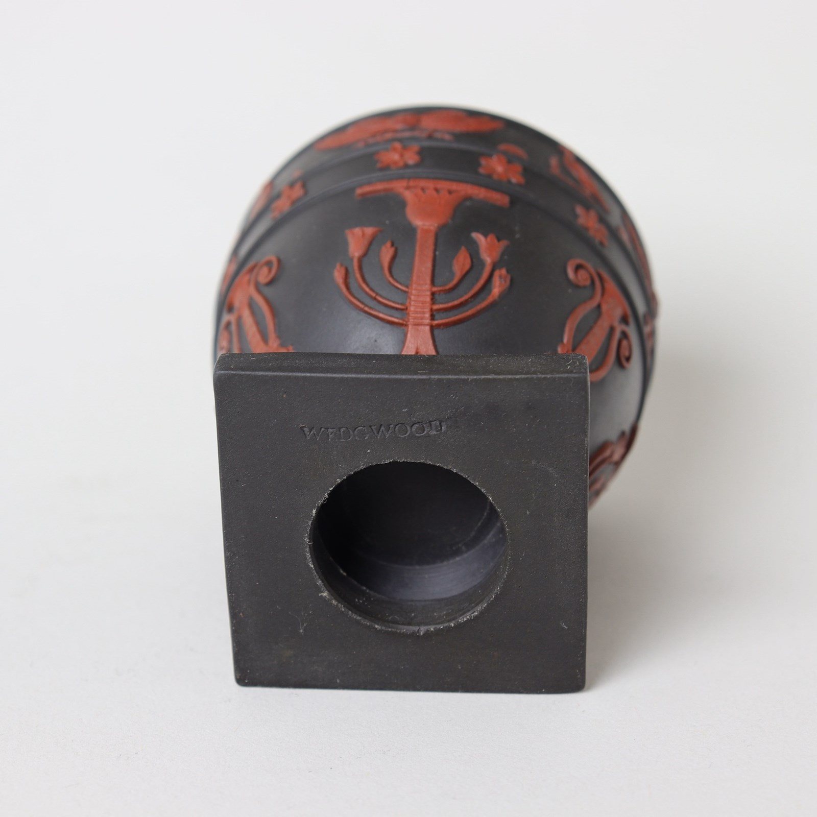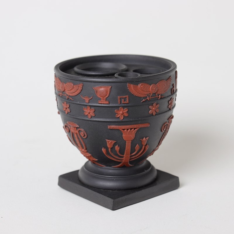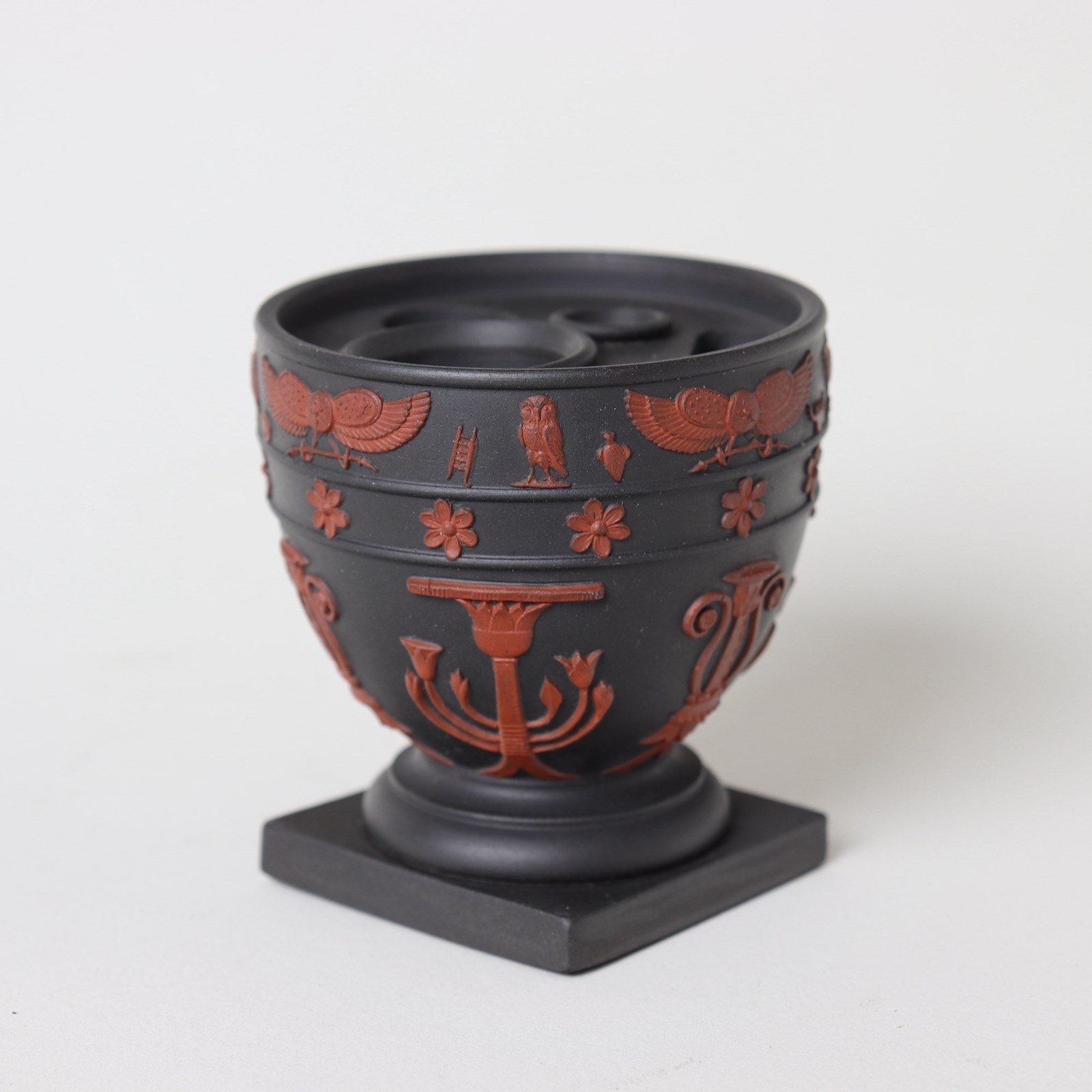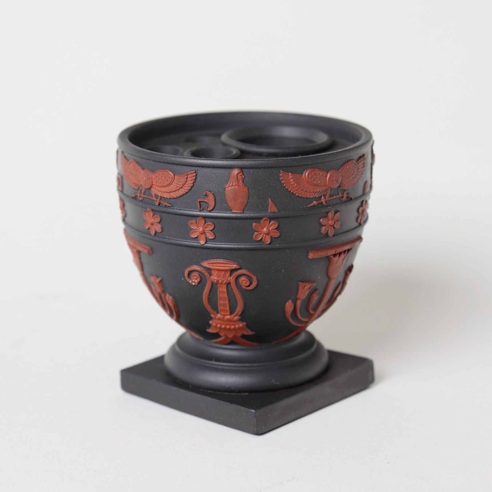 A rare, early 19th century, Wedgwood Rosso Antico pyrophorus vase. This is marked “WEDGWOOD” and it dates from c.1815. Pyrophorus vases were early 19th century, decorative ceramic pots which were designed to create an instant flame. They acted as early, sophisticated match holders. The main container held chemical tipped wooden splints and these were dipped into the acid which was kept in a separate container within the vase. Very few were made and, due to their use, they were often damaged as they were in the habit of exploding. This example is beautifully decorated with Egyptian reliefs in terracotta against a basalt ground. The reliefs are super quality and, remarkably, the piece is still in excellent condition.