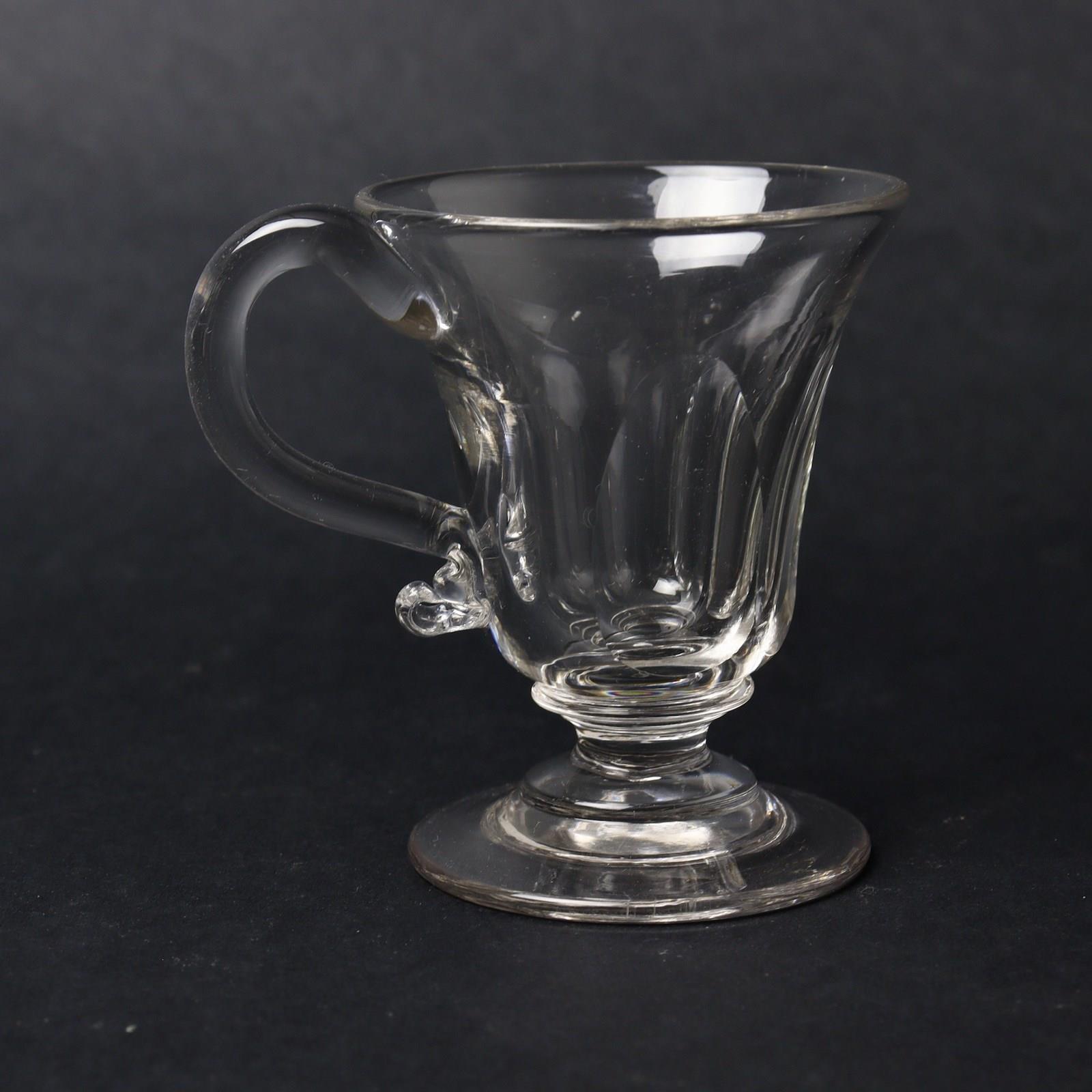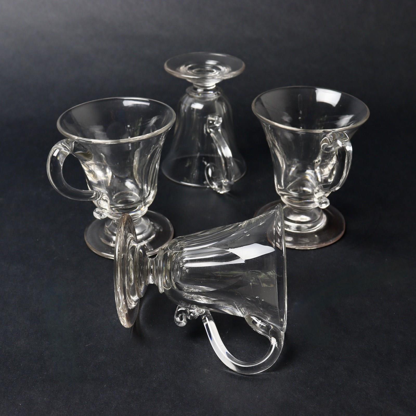 A set of four, early 19th century, English glass custard cups. These would have been used for serving desserts such as flavoured custards, flummery or syllabub. They date from c.1820. They have a long elliptical cut to the bowls and the handles have an attractive turned terminal. They are all in excellent condition.