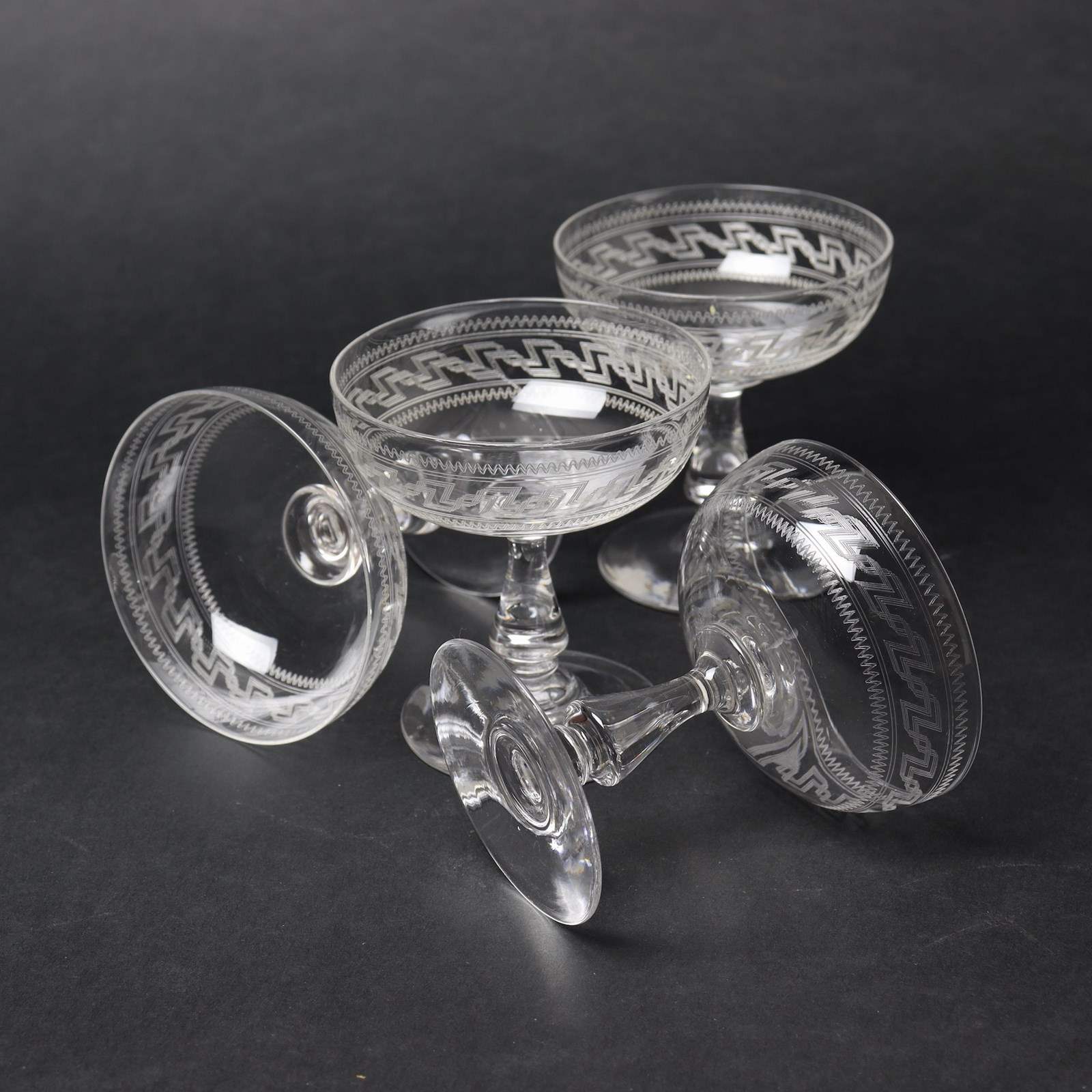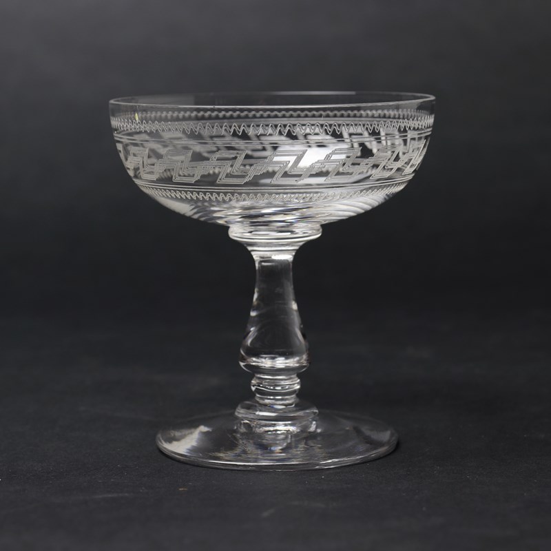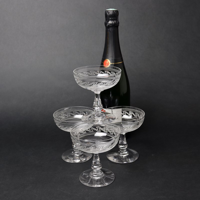 A set of four French crystal, champagne coupes. These are made from a fine quality crystal and they date from c.1920. They have a low, baluster stem and the bowls are finely engraved with a variation of the Greek Key design. They are all in excellent condition.