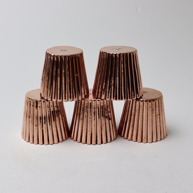 A set of 5, 19th century, miniature copper moulds with fluted sides and flat tops. These are made from a substantial gauge of copper, they are English and they date from c.1880. The tops of the moulds are stamped with a pattern number “56”. They are in very good condition and the tinning to the interiors, although slightly worn, is still in usable condition.