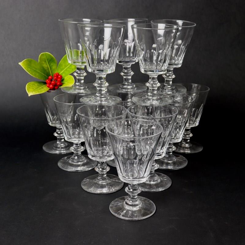 A set of six, 19th century, French crystal wine glasses. These are made from a very heavy, good quality crystal and they date from c.1880. They have a long, elliptical cut to the lower section and a flying saucer shaped stem. They are all in excellent condition.