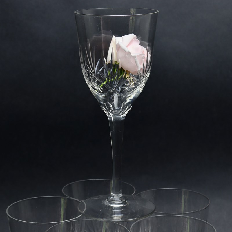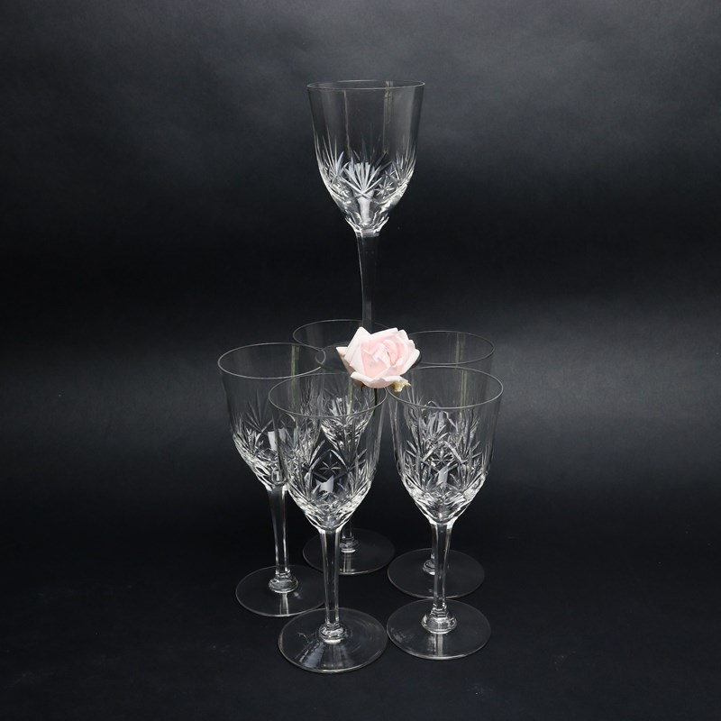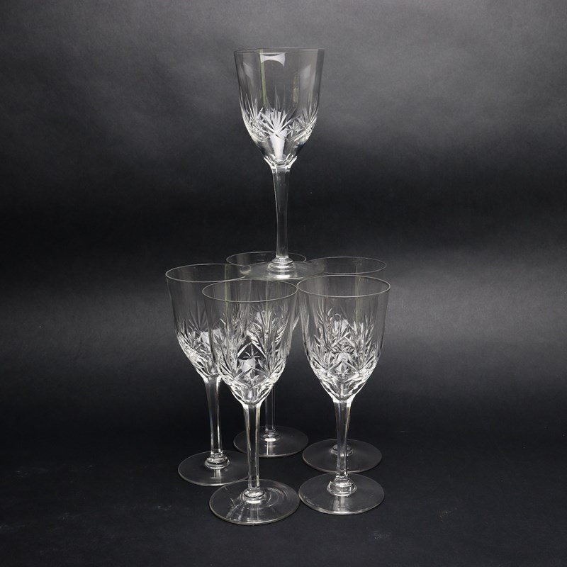 A set of six large French crystal wine or water glasses. The deeply cut geometric design is very similar to the St. Louis Chantilly pattern but it is slightly less busy. The glasses are made from a very good quality crystal and they are all in excellent condition.