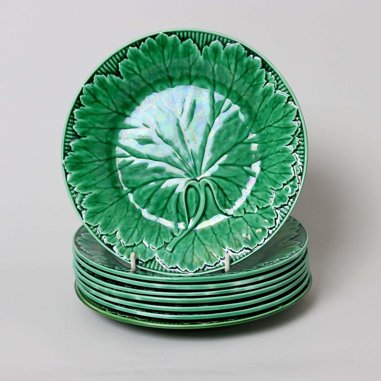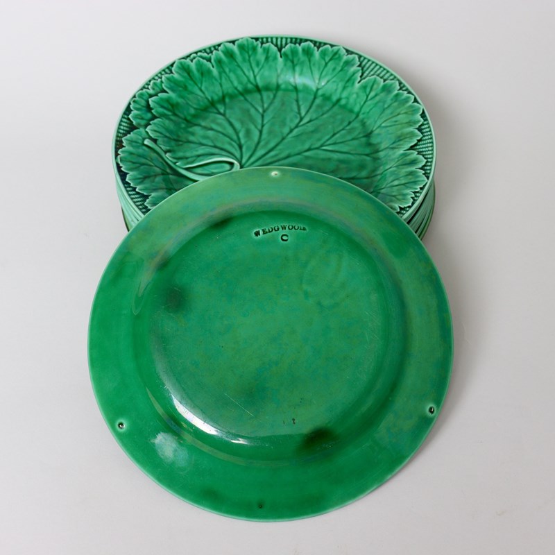 A set of eight Wedgwood, green majolica glazed leaf plates. These are marked “WEDGWOOD” and they are also impressed with a large letter “O”. One plate is also impressed with a three letter date code but the final letter, which denotes the year, is indistinguishable. They date from c.1870. Each plate is moulded in the shape of a cabbage leaf against a basket weave background and this is then covered in a dark green, majolica glaze. There is very minimal wear to the glaze on the high points of the design on some of the plates but otherwise they are all in very good condition.
