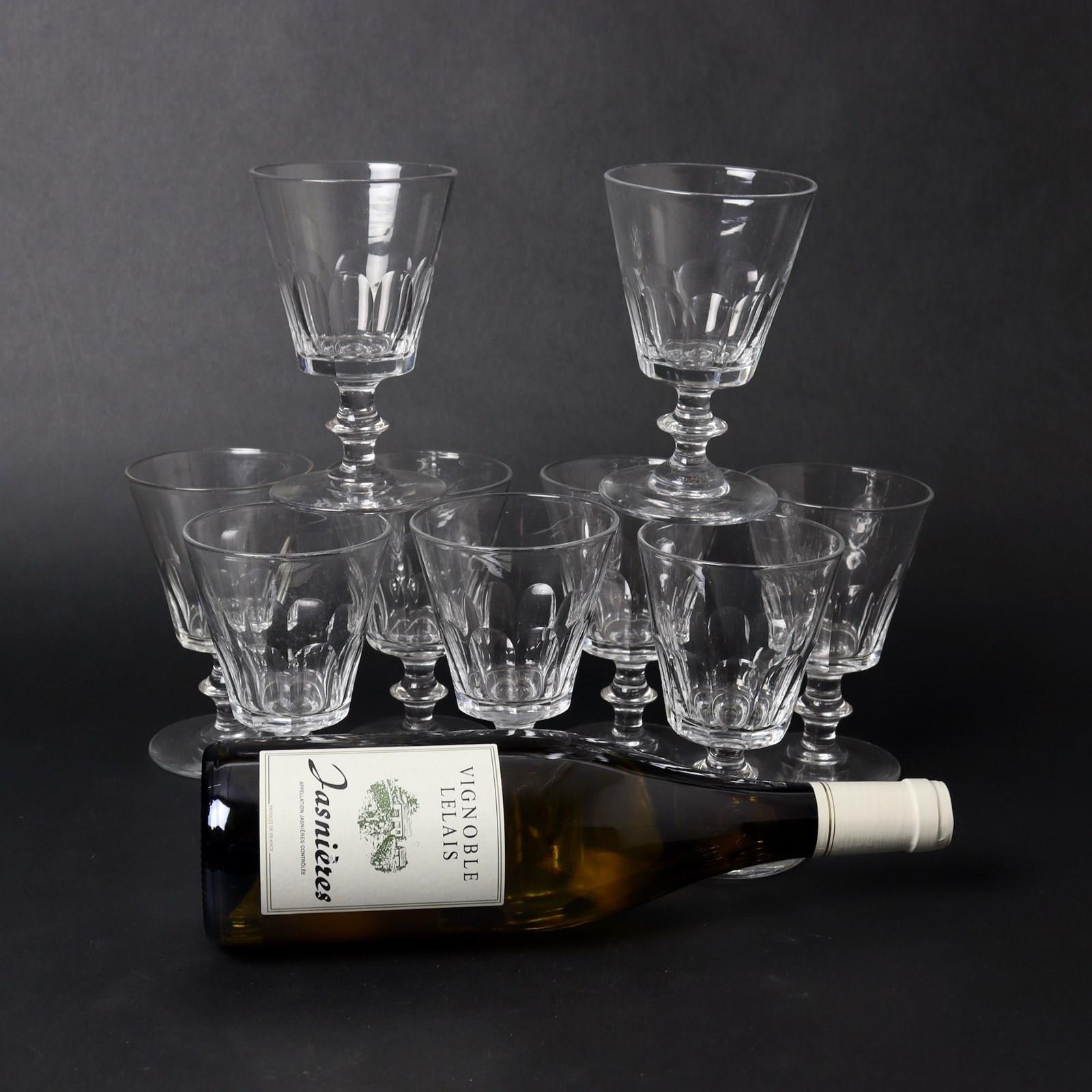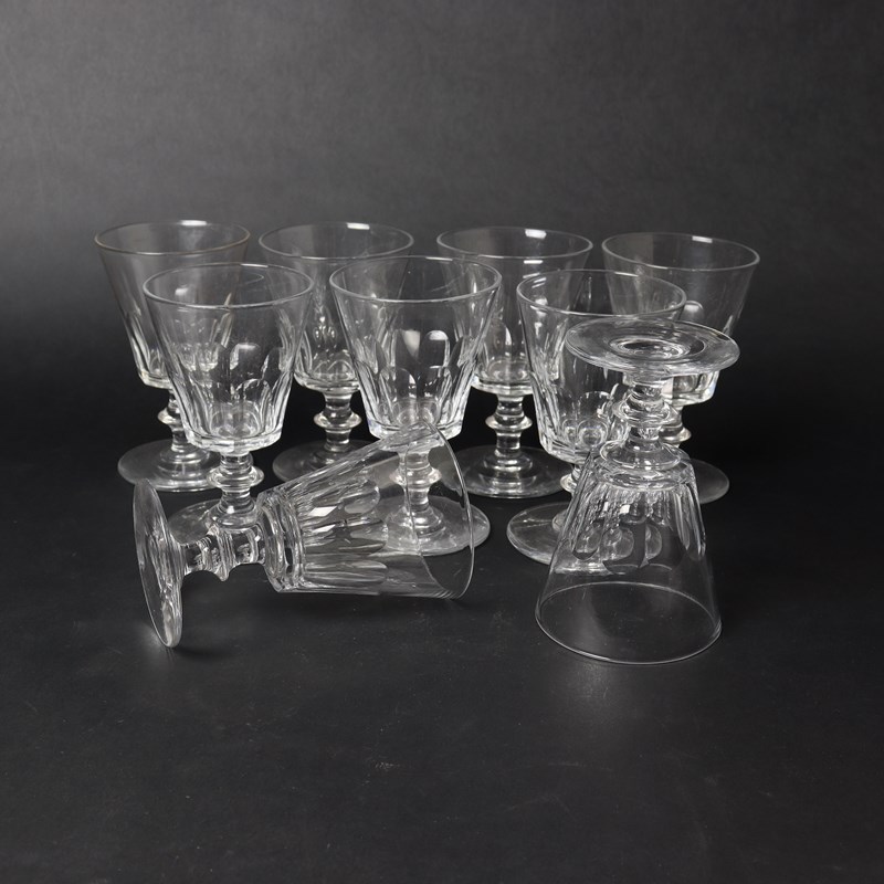 A set of nine, 19th century, French crystal wine glasses. These are made from a very heavy, good quality crystal and they date from c.1880. They have a long, elliptical cut to the lower section and a flying saucer shaped stem. They are all in excellent condition.