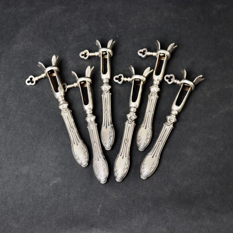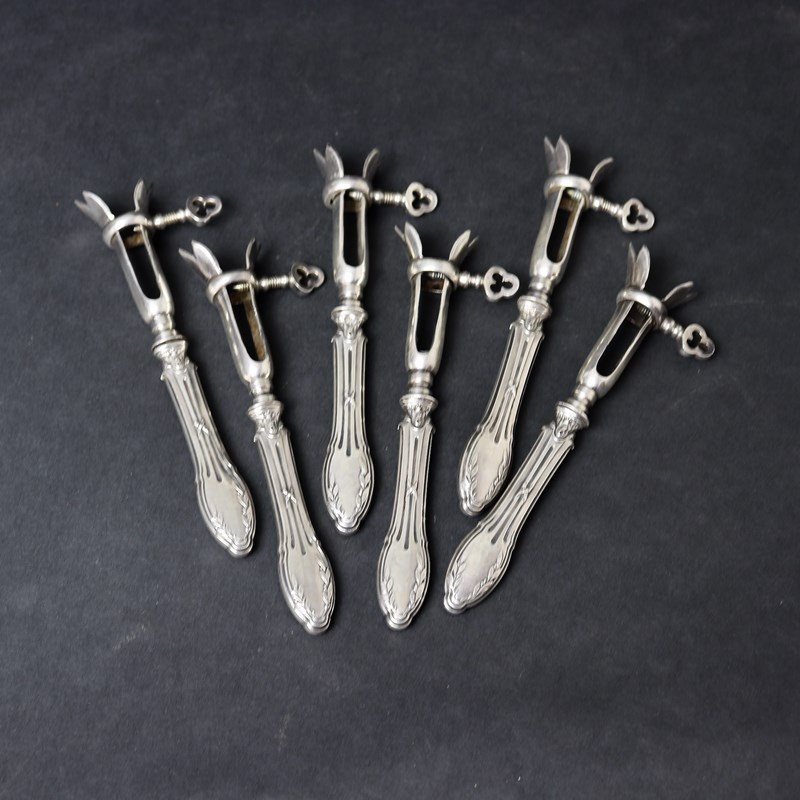 A unusual set of six, small French silver and silver plate bone clamps. These usually come individually, and in a much larger size, and were use for holding the end of a leg of lamb whilst carving. However, these very small examples would have been used to clamp the end of the leg of a small bird so that you could pick it up to eat it from the bone. These are a delightful set which date from c.1880. The handles are silver, with an attractive design, and the clamp section is silver plated as this is stronger than silver. They would be a very elegant addition to a table, when serving poultry on the bone, and they are all in excellent condition.