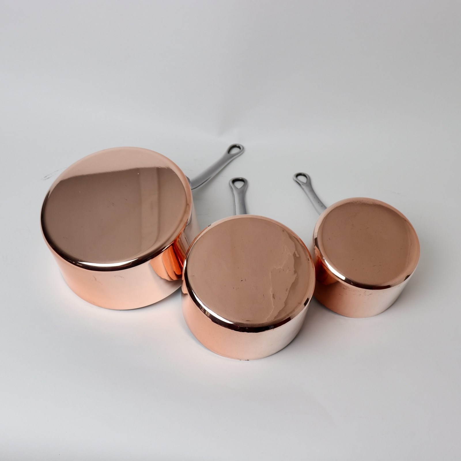 A matched, graduated set of three French copper saucepans with steel handles. The larger of these pans is stamped with the number “20”, which relates to the diameter in centimetres, it is made from a very heavy gauge of copper and it dates from c.1920. The two smaller pans are 19th century and they are also made from a very heavy gauge of copper. They are marked “E DEHILLERIN 18 RUE COQUILLIERE PARIS” but the mark on one is quite worn. They date from c.1880. The mid sized pan is also stamped with a large letter “G”. All three pans are in very good condition. The tinning in the largest pan is still in usable condition but the tinning in the two smaller pans is worn.