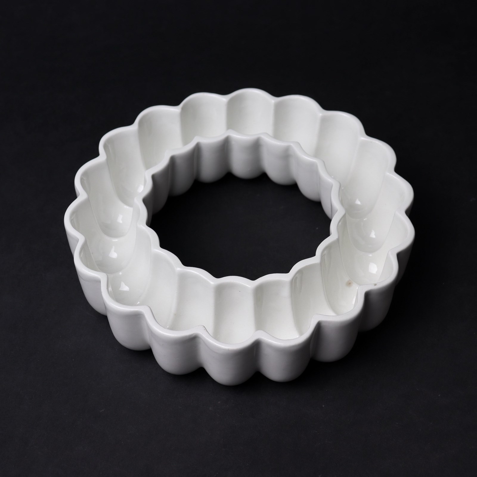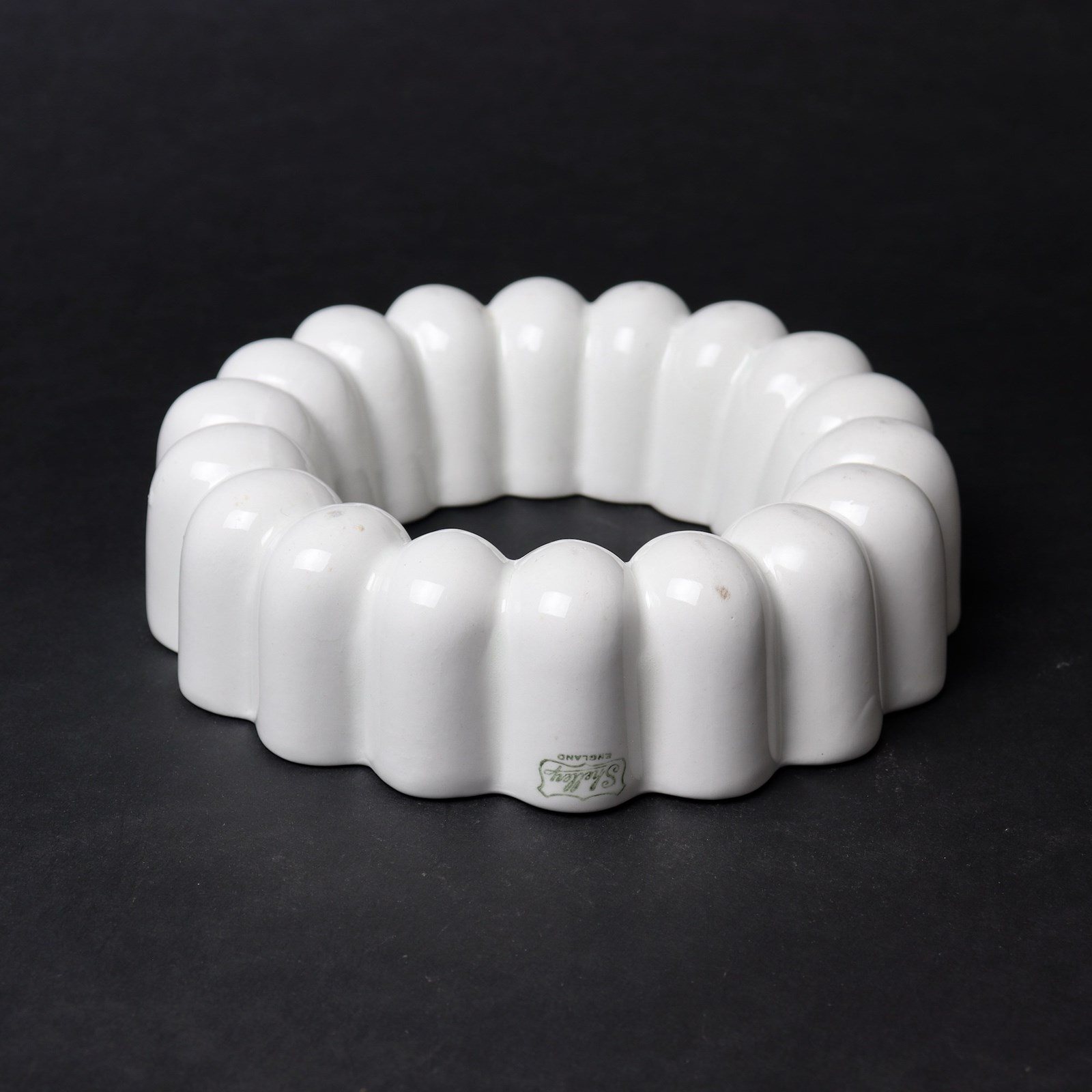 A Shelley, fluted ring pattern jelly mould. Although quite simple this is one of the less common designs of mould produced by Shelley. It is marked, in green transfer print, with “Shelley” within a shield, above “ENGLAND” , and it dates from c.1920. It is in very good condition but there are a couple of small pieces of kiln grit on the interior of the mould which may bind if you were trying to turn out a jelly.