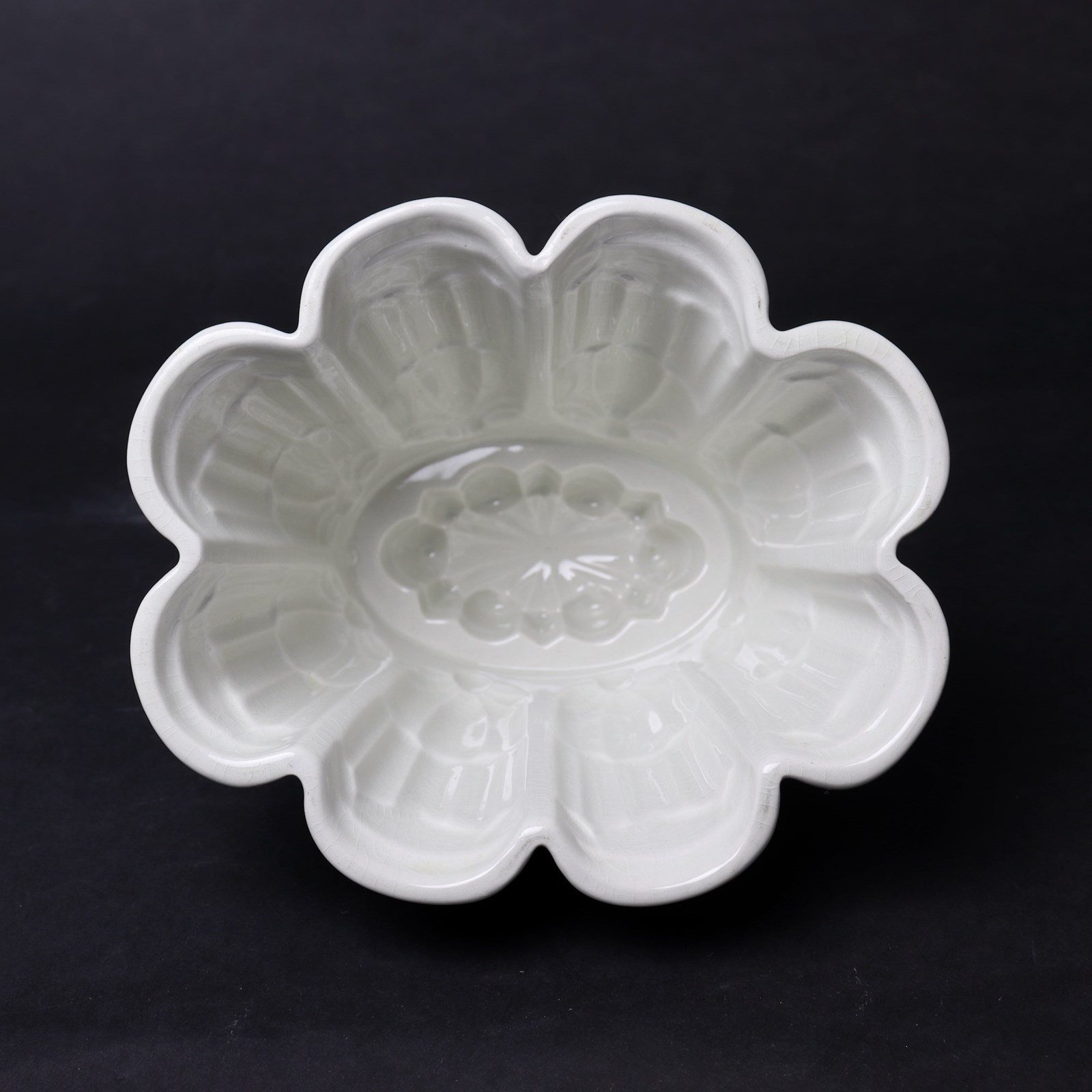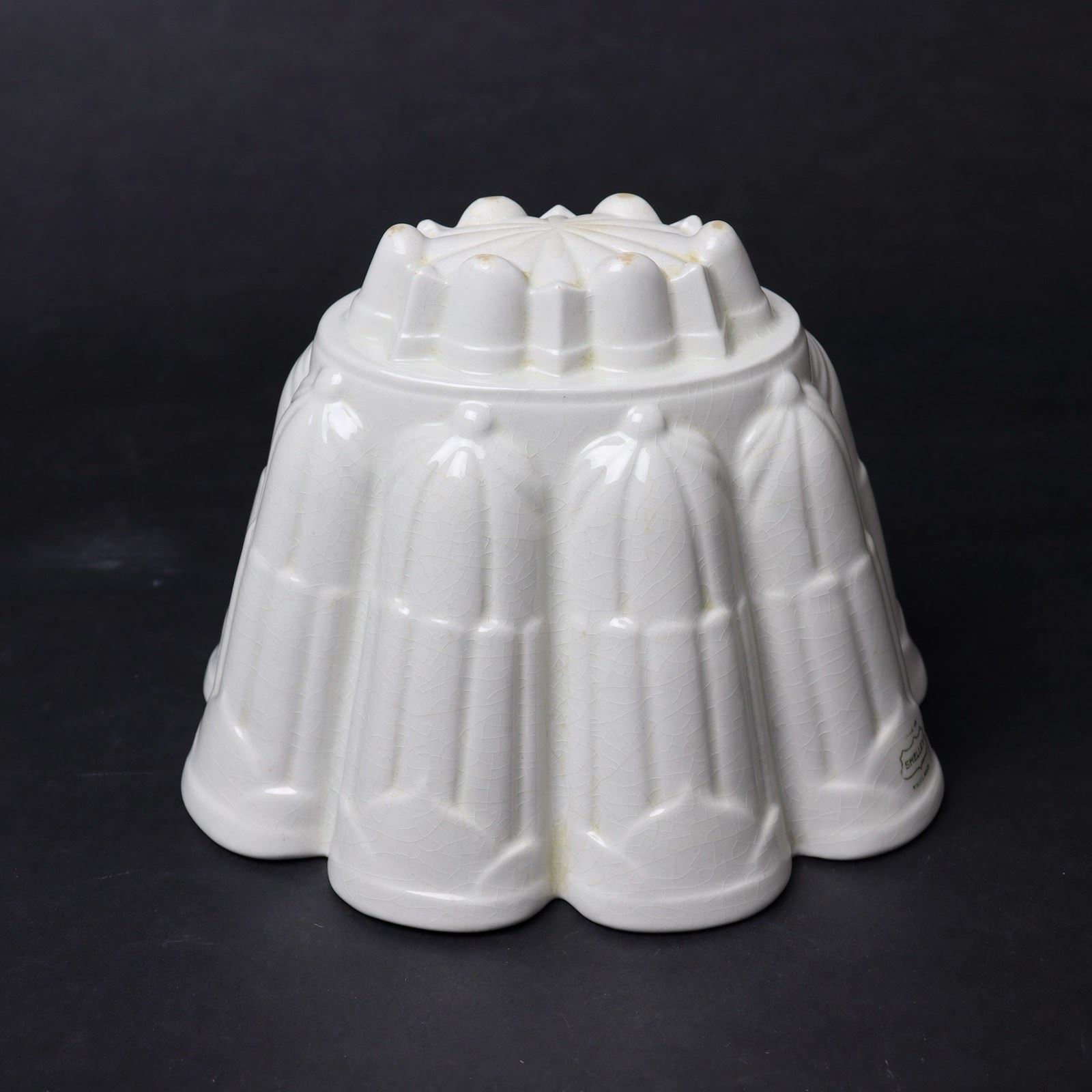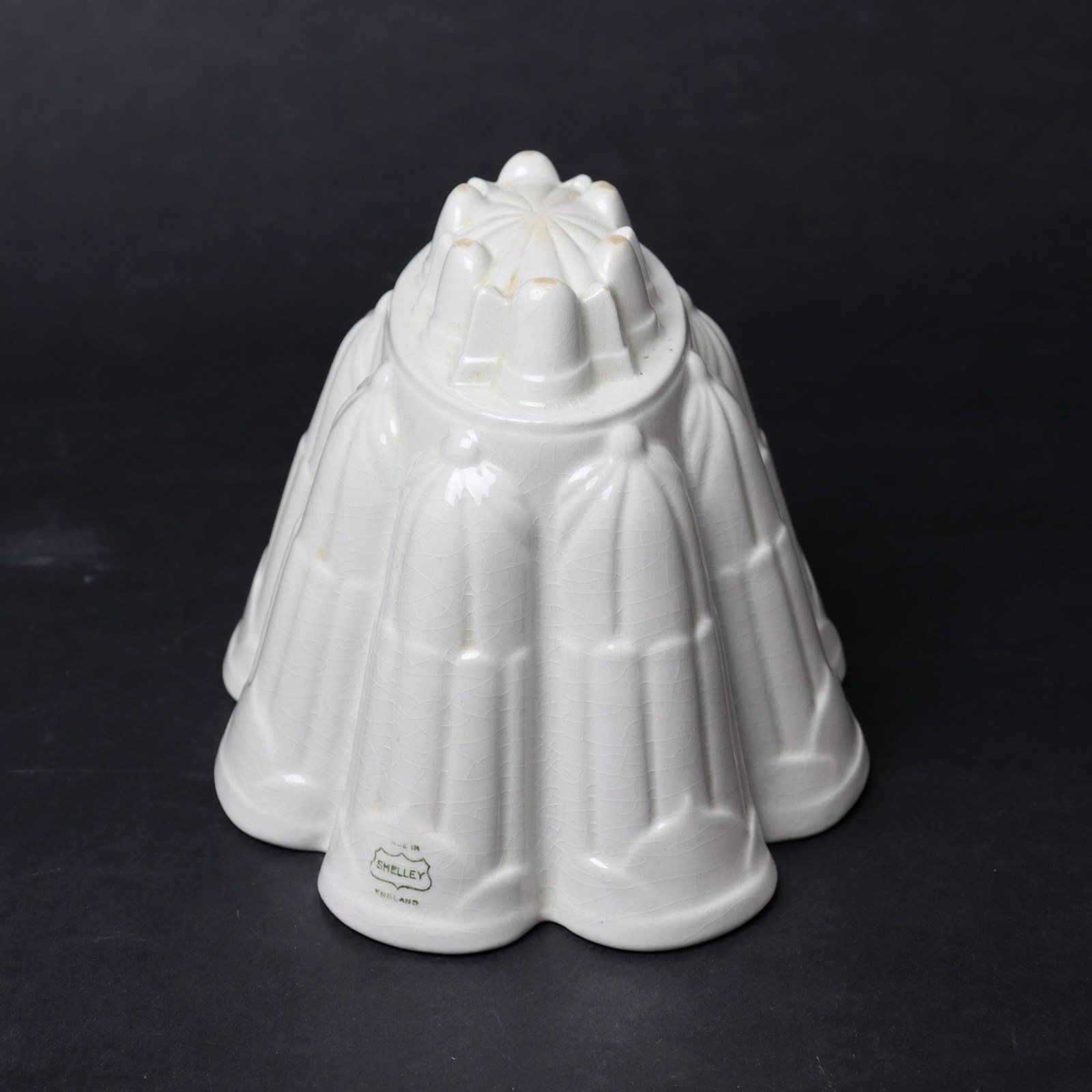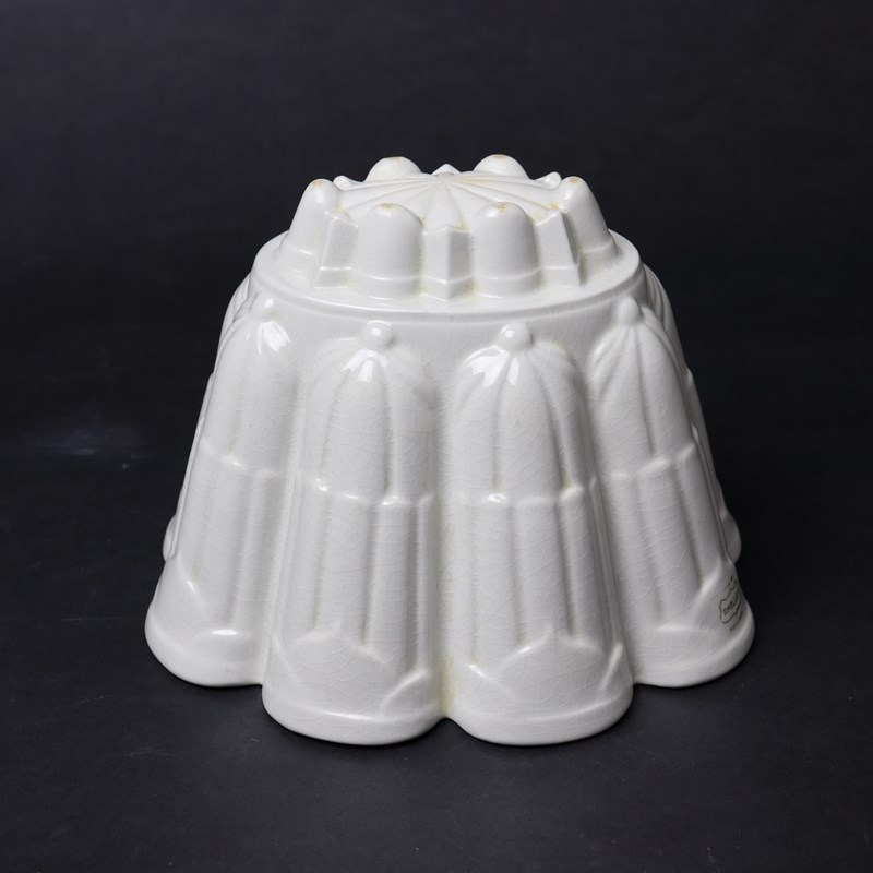A Shelley Ritz pattern jelly mould. This is marked, in green transfer print, “SHELLEY” in a shield shape with “MADE IN” above and “ENGLAND” beneath and it dates from c.1920. This is one of the designs which Shelley named after London hotels and it was produced in four different sizes. It is a very fancy design which turns out well but, as the design is also on the exterior, it also displays very well on a shelf. There is slight rubbing to the glaze, on the high points to the top of the mould, but the mould is in very good, usable condition.