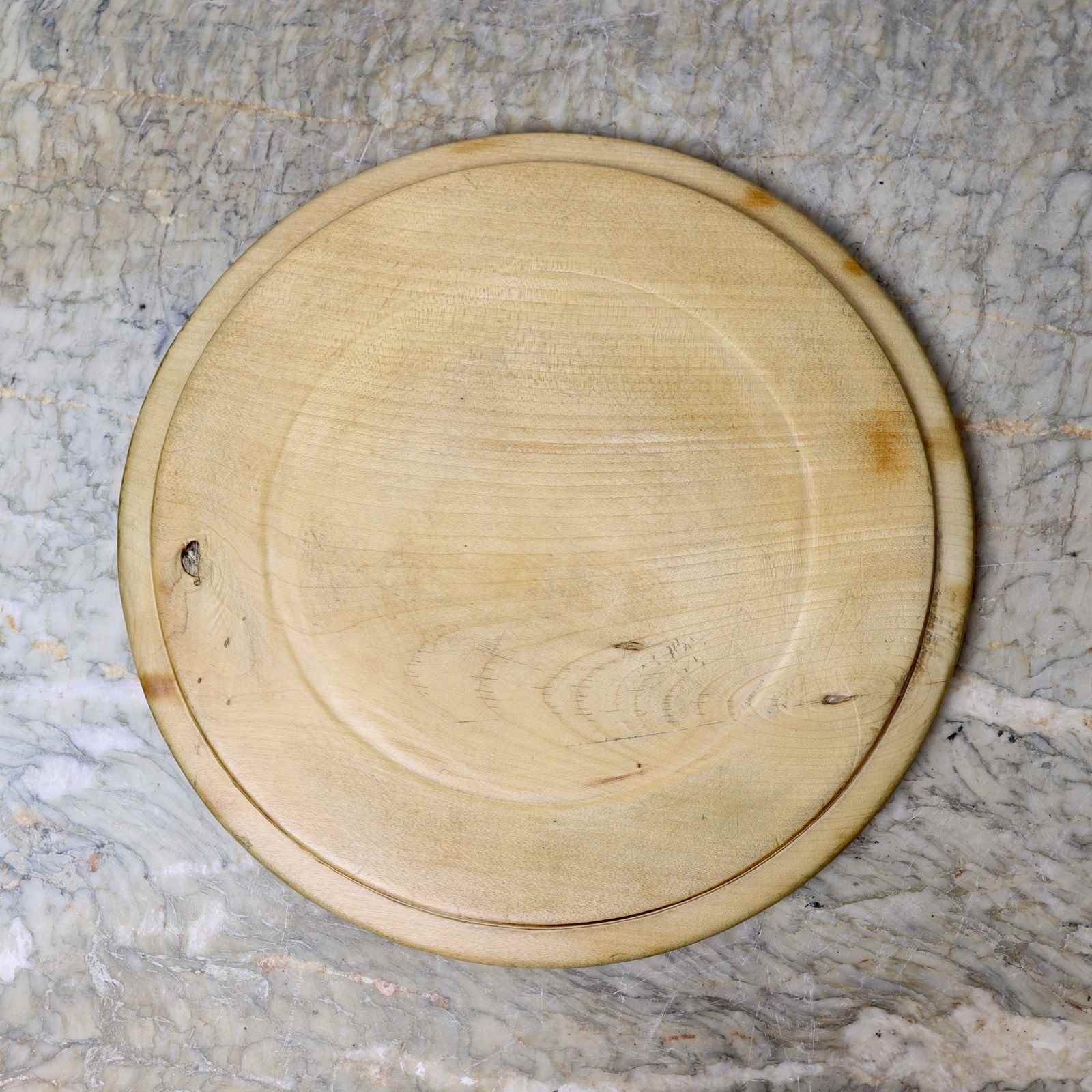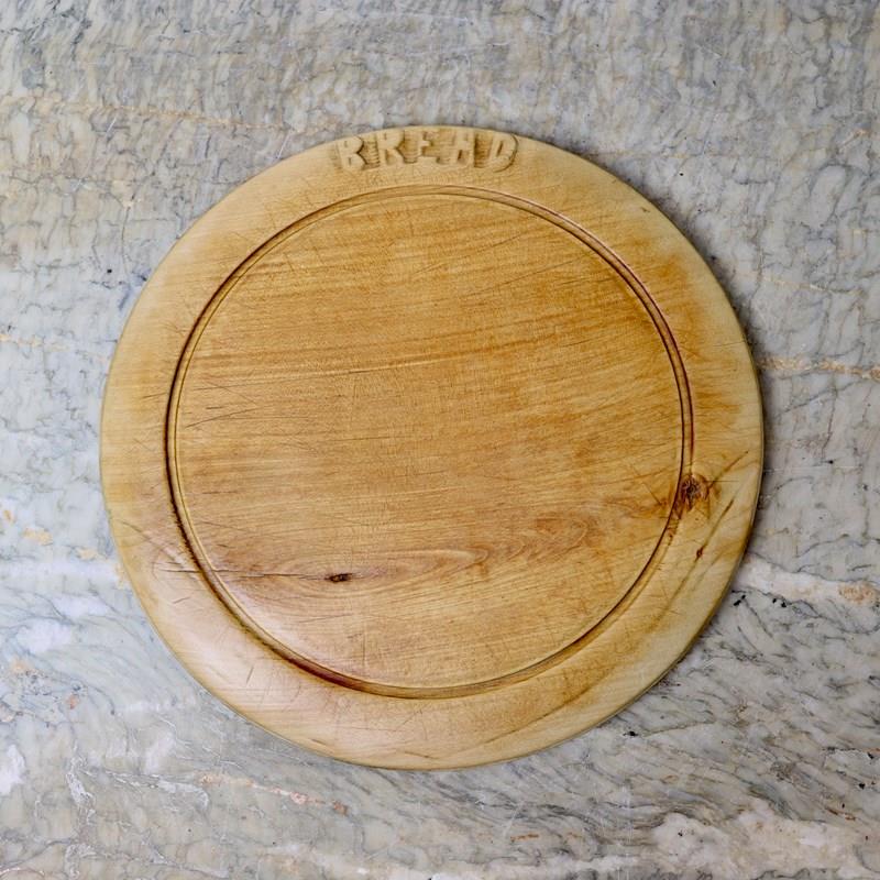 A very simple, early 20th century, sycamore breadboard. This is carved with the word “BREAD” and it dates from c.1920. Originally there were long, chip carved, stylised leaves around the remainder of the border but these are now so worn that they are barely visible. The board is in good condition, with no chips or cracks, but there are some knots in the wood, which can be seen in the images, and they would have been in the wood when the board was carved.