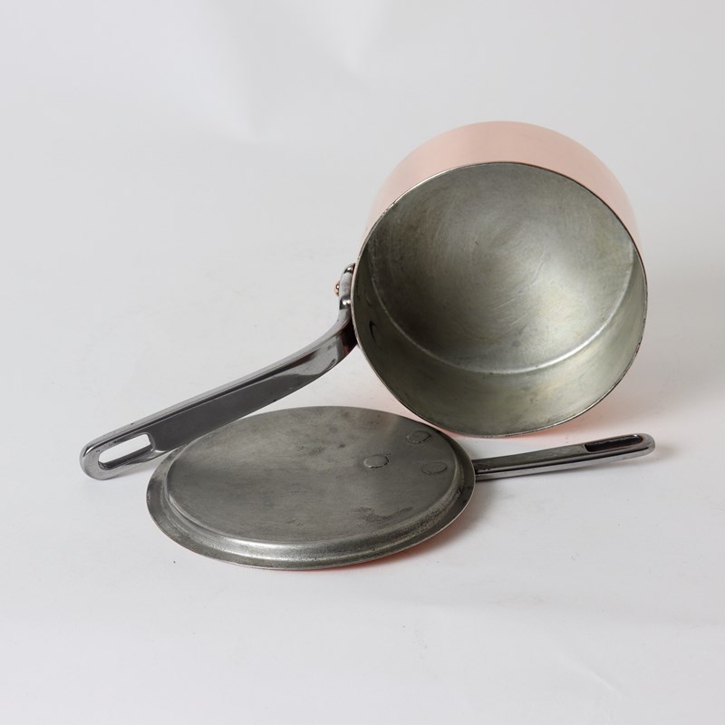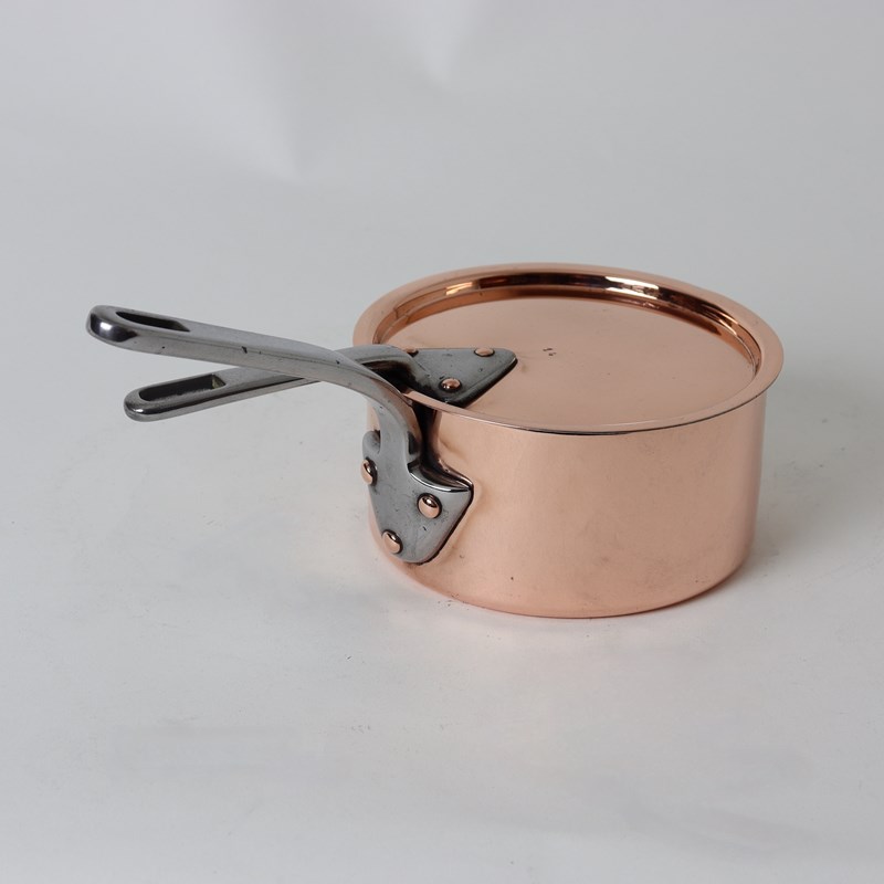 A small, 19th century, French copper saucepan and cover. Both the pan and cover are stamped with the number “14” which relates to the diameter of the pan in centimetres. It is well made, from a very heavy gauge of copper, and it has nicely shaped, steel handles. It dates from c.1880. It is in excellent condition and the interior has been re-tinned so that it can be used.