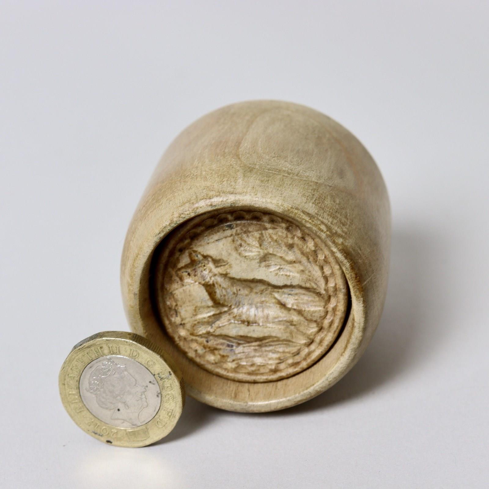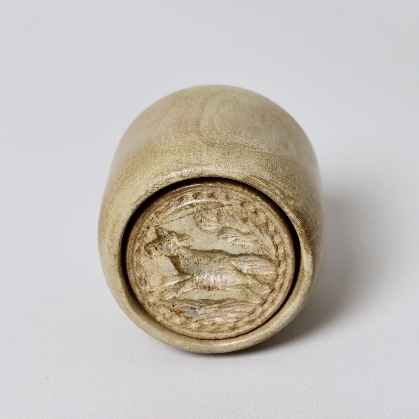 A small, early 20th century sycamore butter ejector print carved with a fox. The carving of this print is quite naive in style but it is unusual to find a fox carved on a butter print. It dates from c.1920 and is in excellent condition.